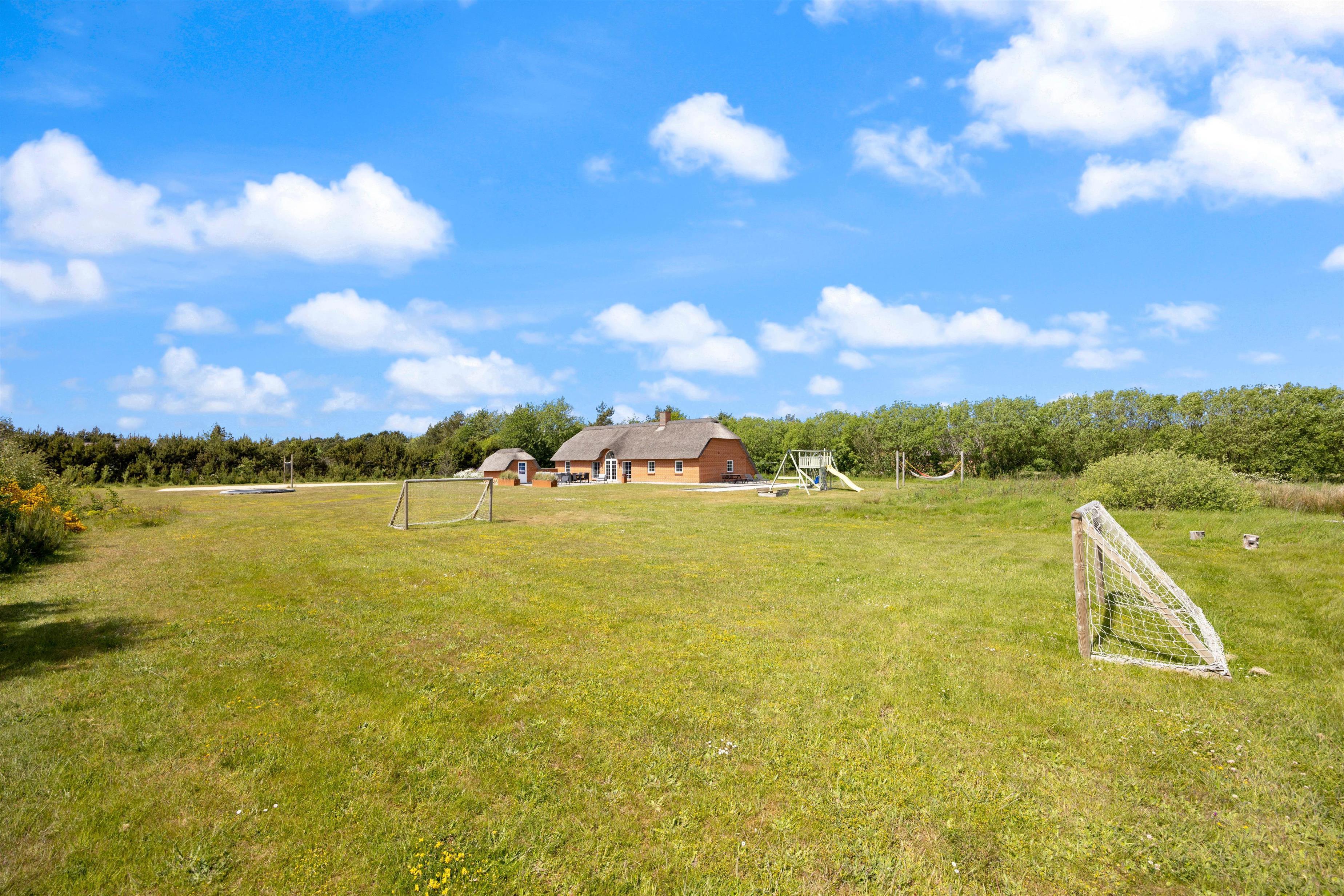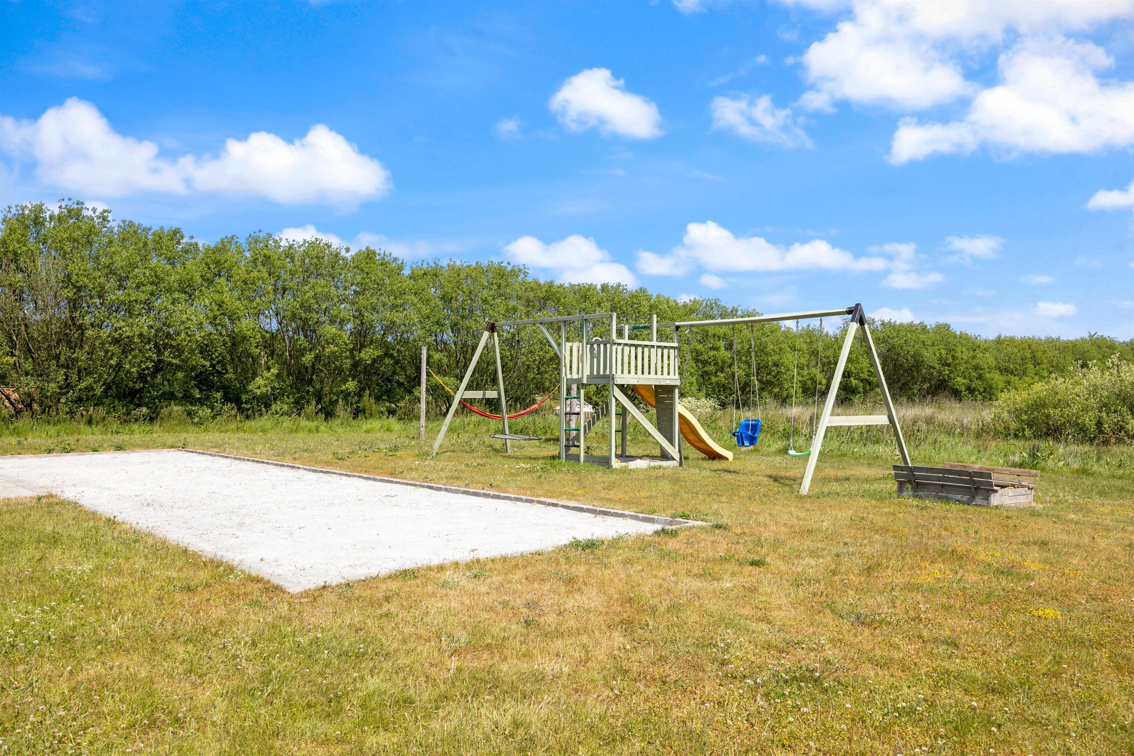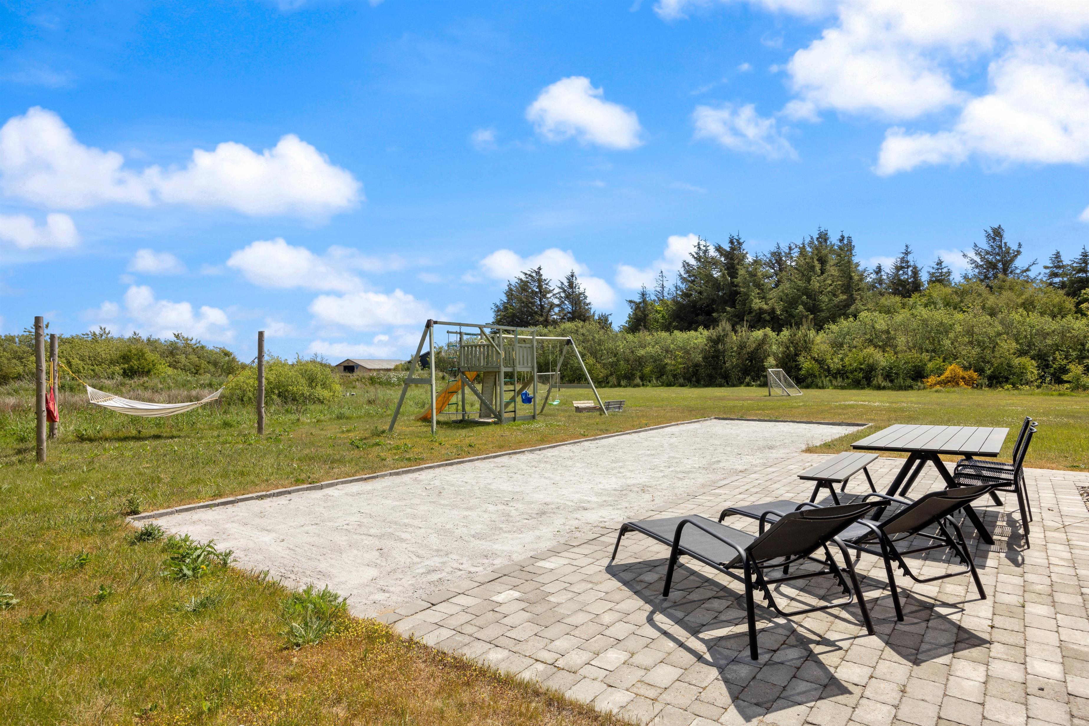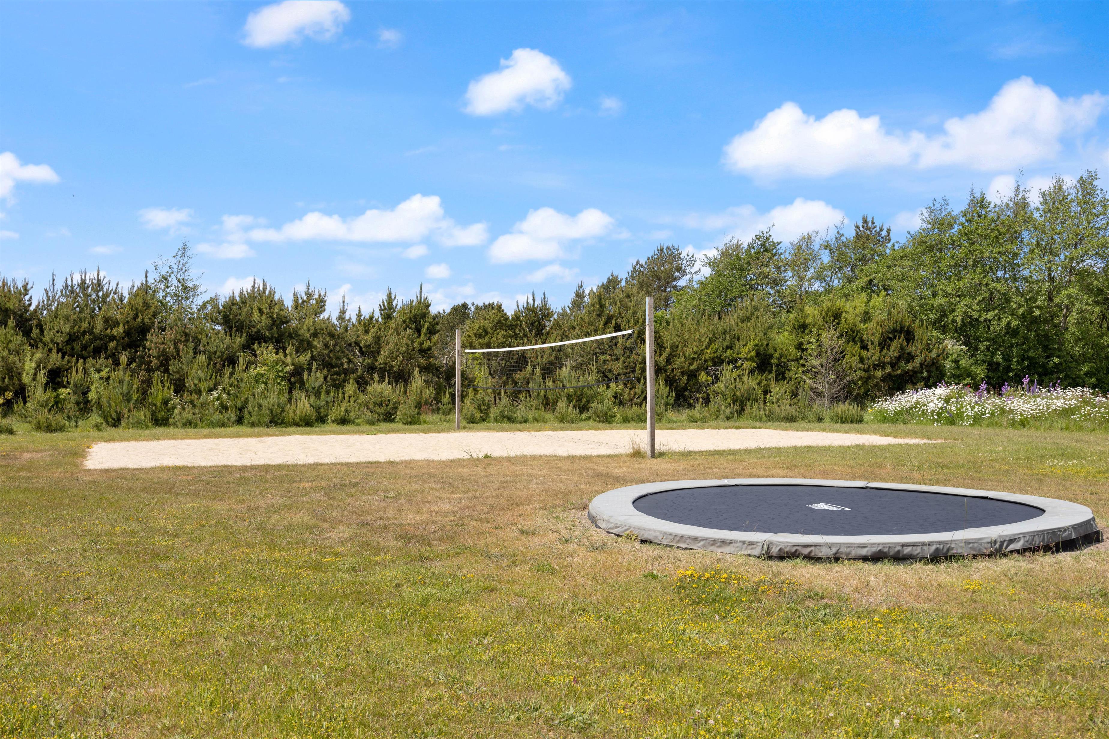 Gennem terrassedørene kommer I ud på den afskærmede og stenbelagte terrasse mod syd. Her kan I nyde solen i liggestolene og slutte dagen af med lækker grillmad direkte fra sommerhusets grill. Udendørsaktiviteter er der heller ikke sparet på i dette sommerhus. Sommerhuset har både egen beachvolleybane, petanquebane, trampolin og fodboldmål!