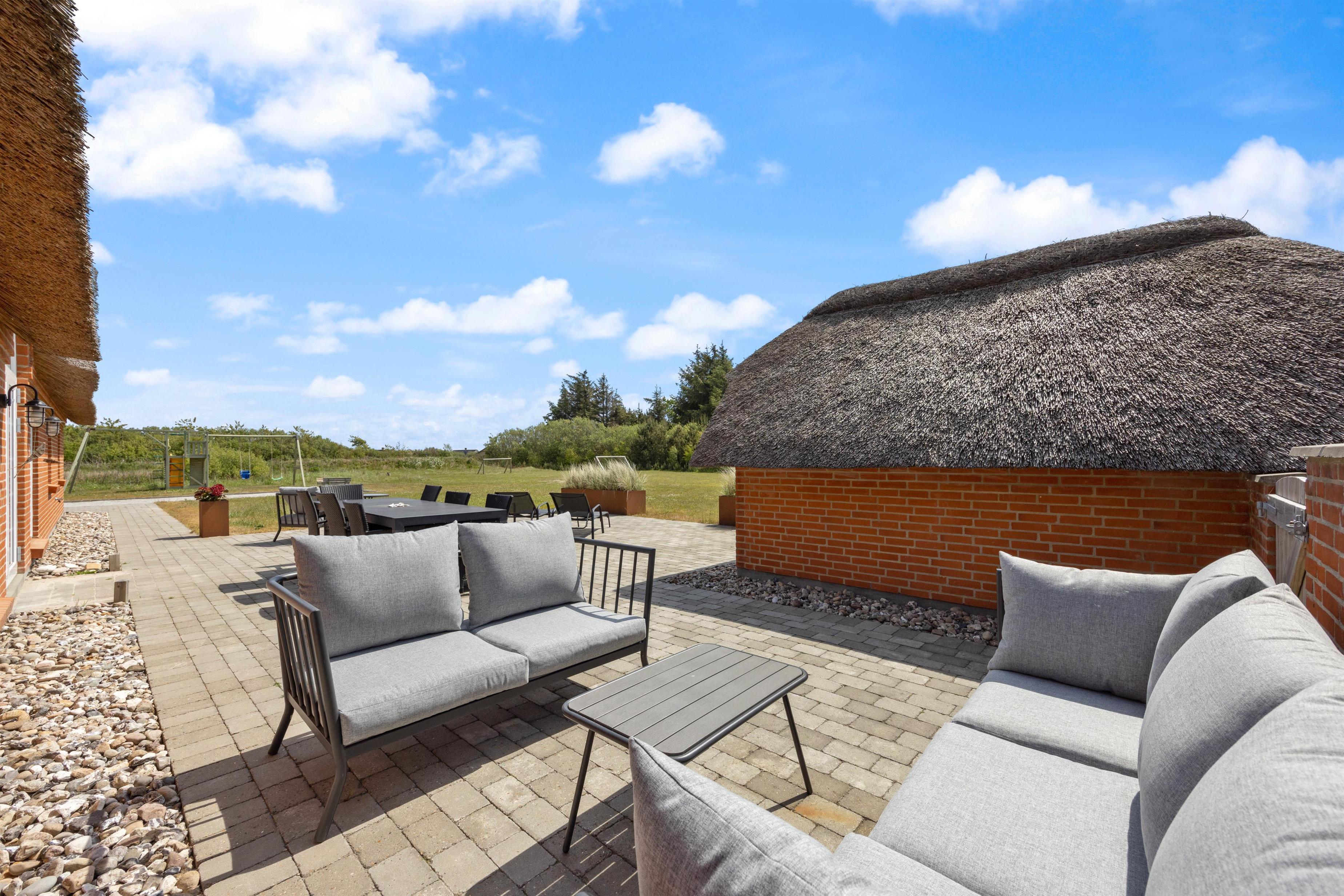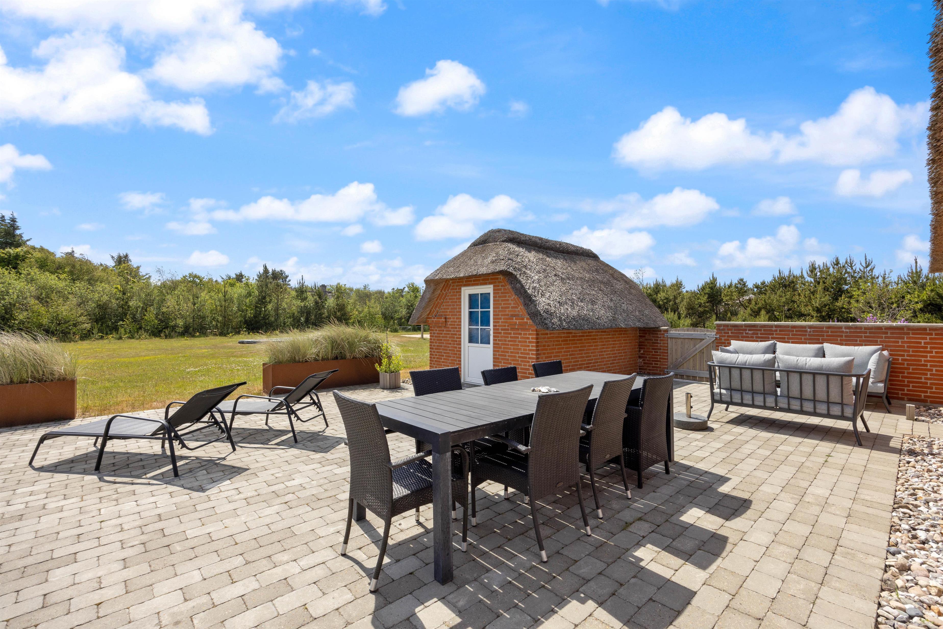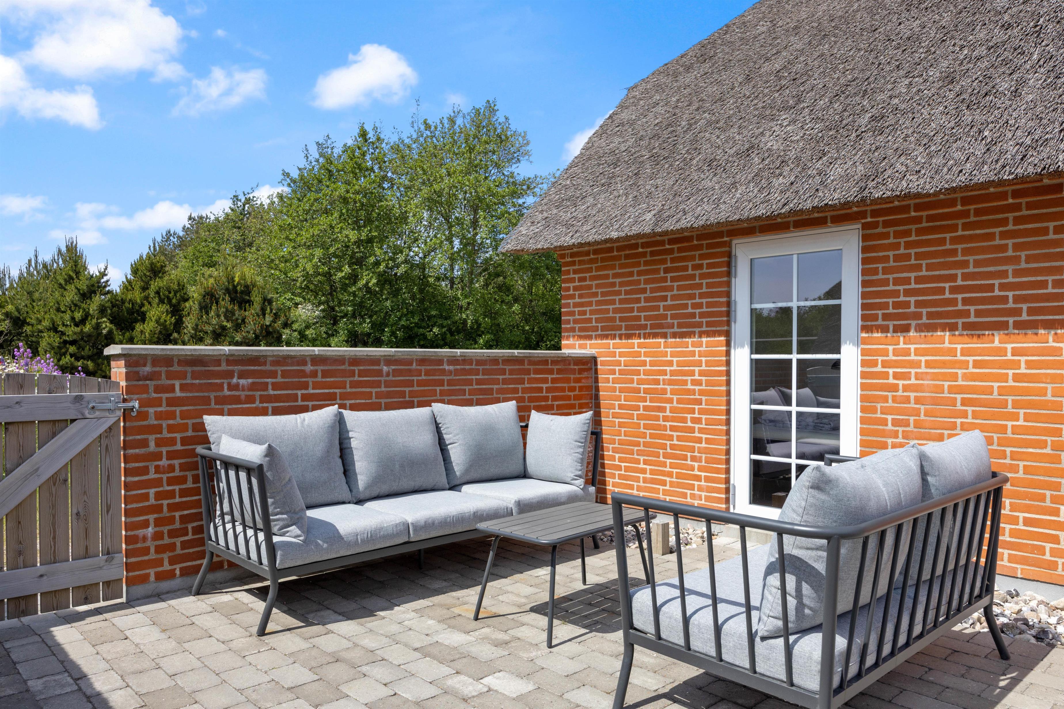 Gennem terrassedørene kommer I ud på den afskærmede og stenbelagte terrasse mod syd. Her kan I nyde solen i liggestolene og slutte dagen af med lækker grillmad direkte fra sommerhusets grill. Udendørsaktiviteter er der heller ikke sparet på i dette sommerhus. Sommerhuset har både egen beachvolleybane, petanquebane, trampolin og fodboldmål!