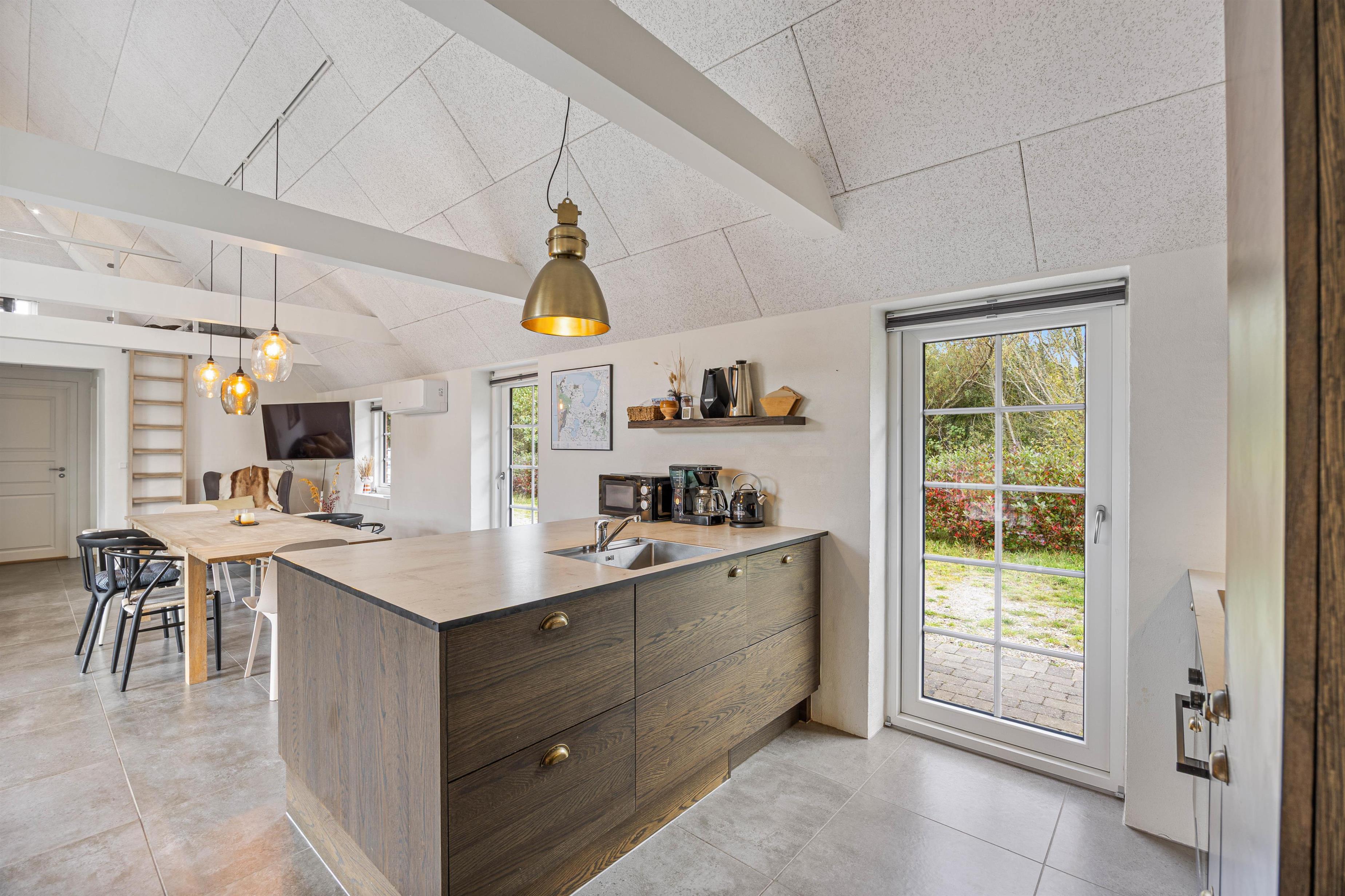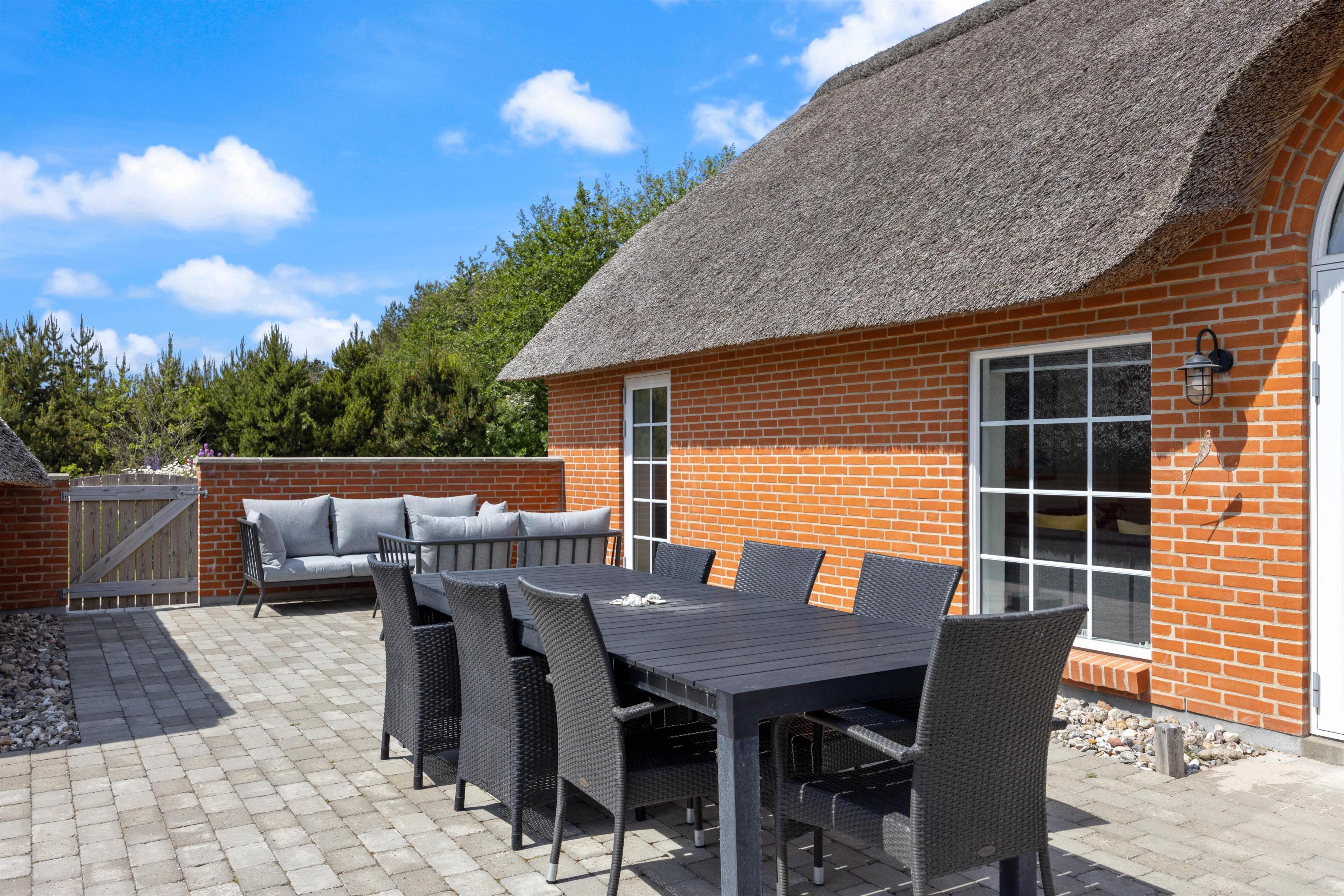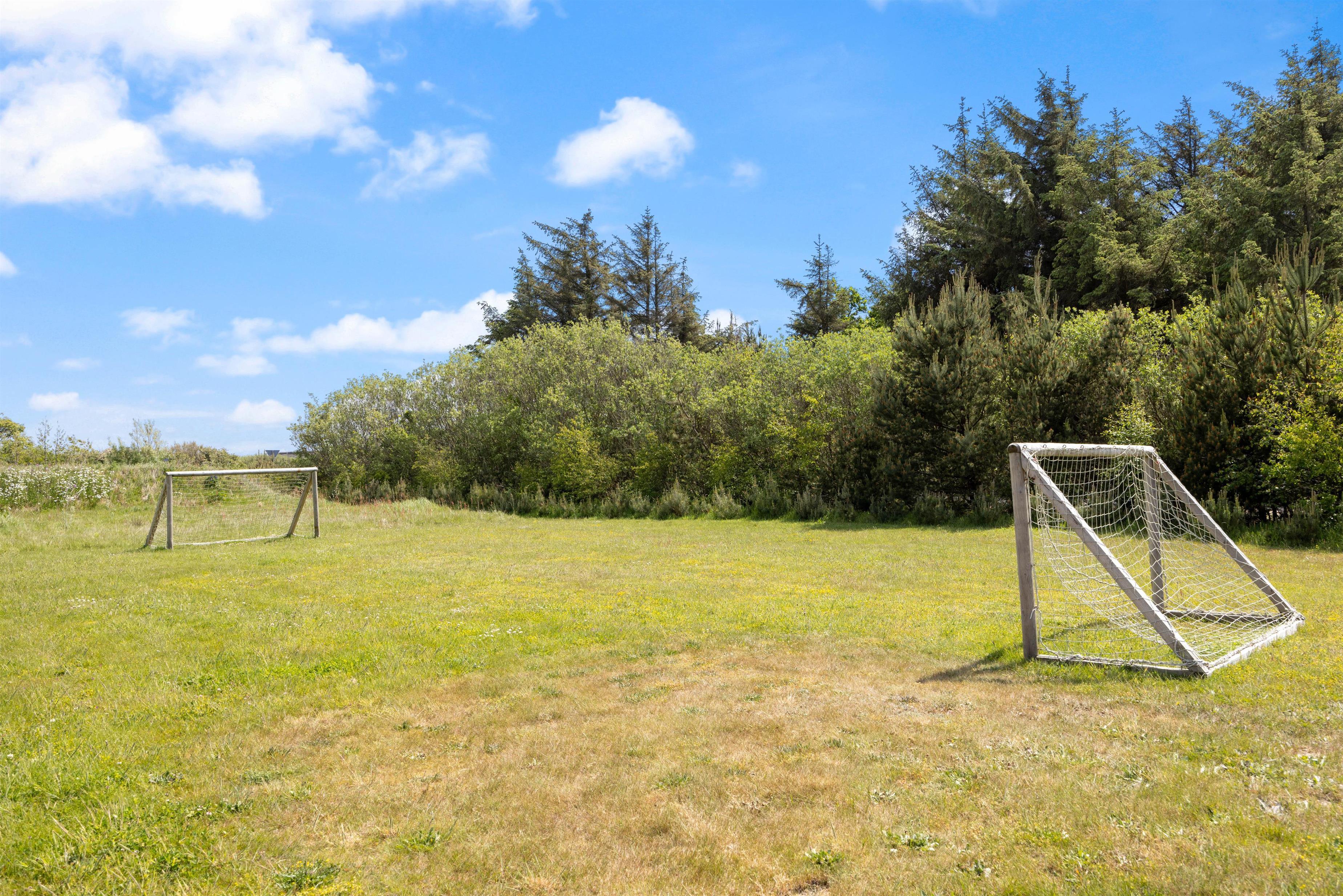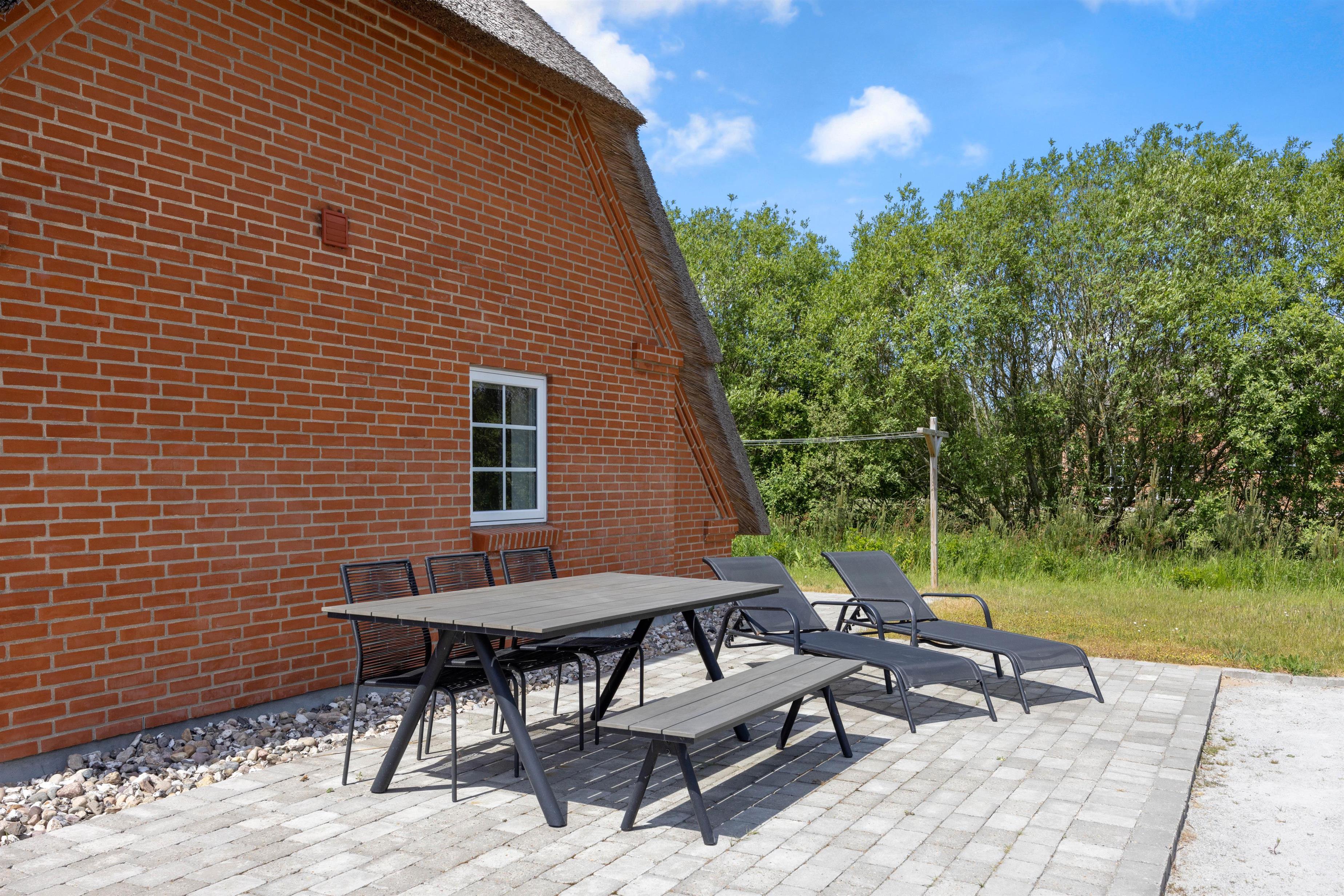 Gennem terrassedørene kommer I ud på den afskærmede og stenbelagte terrasse mod syd. Her kan I nyde solen i liggestolene og slutte dagen af med lækker grillmad direkte fra sommerhusets grill. Udendørsaktiviteter er der heller ikke sparet på i dette sommerhus. Sommerhuset har både egen beachvolleybane, petanquebane, trampolin og fodboldmål!