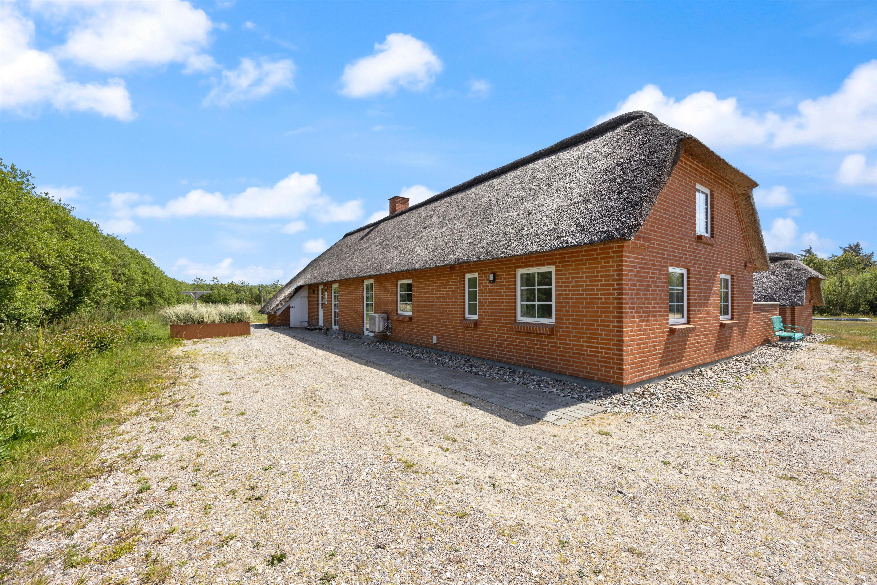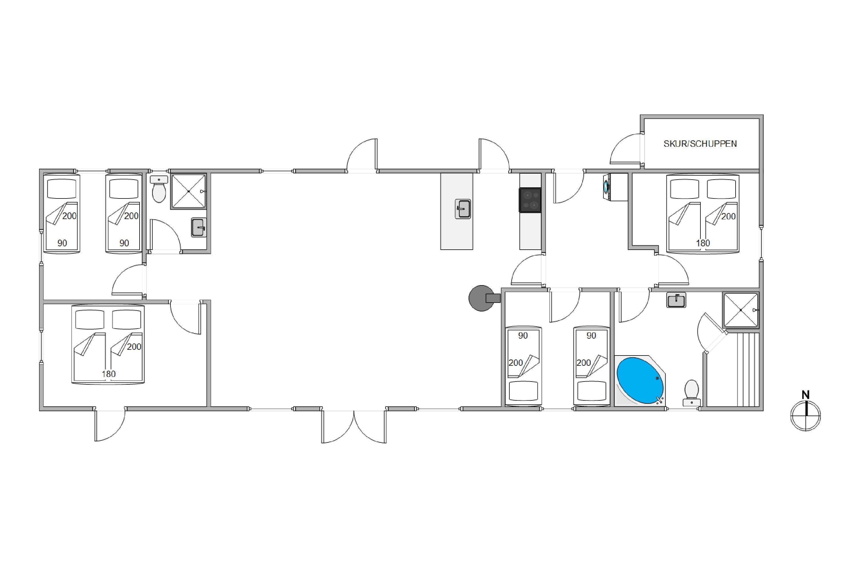 Det stråtækte aktivitetshus har plads til i alt 8 personer. Da der er to soveafdelinger og to badeværelser er der god plads til, at to familier med børn sammen kan nyde deres ferie her. Den ene af de to dobbeltsenge i soveværelset med egen tilgang til terrassen er ekstra lang og har en længde på 210cm, så komfort og god nattesøvn til alle er der også tænkt på!