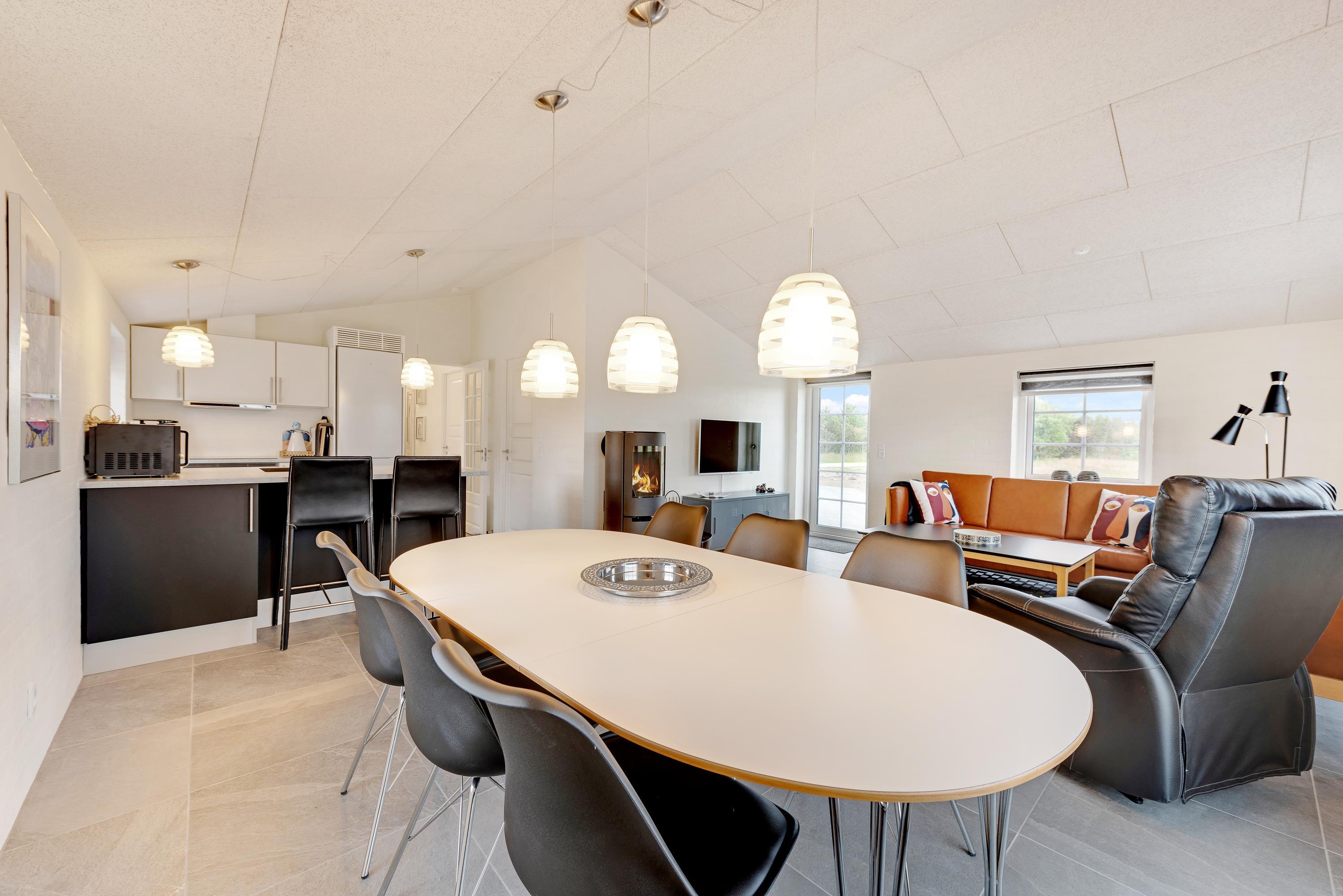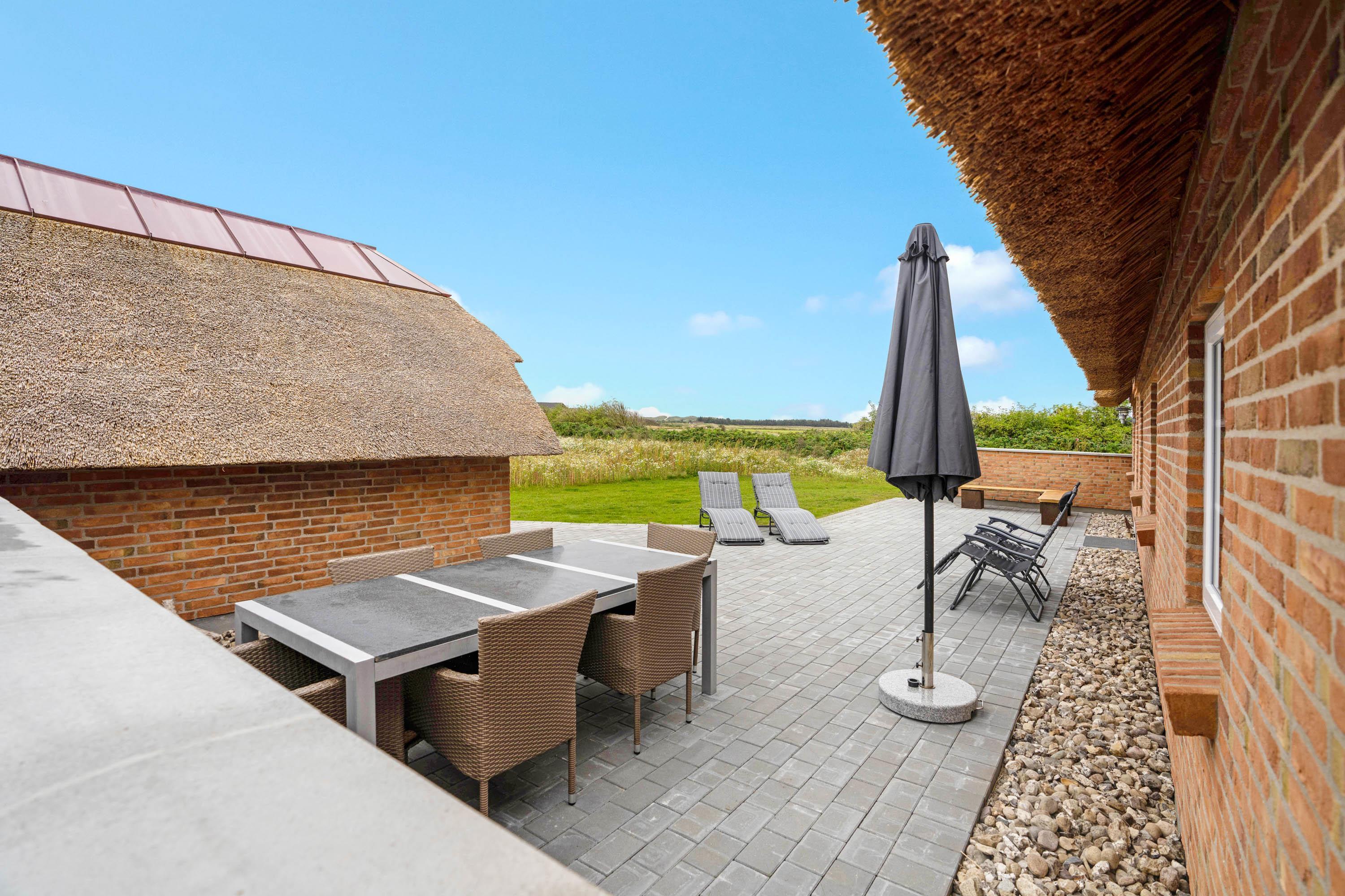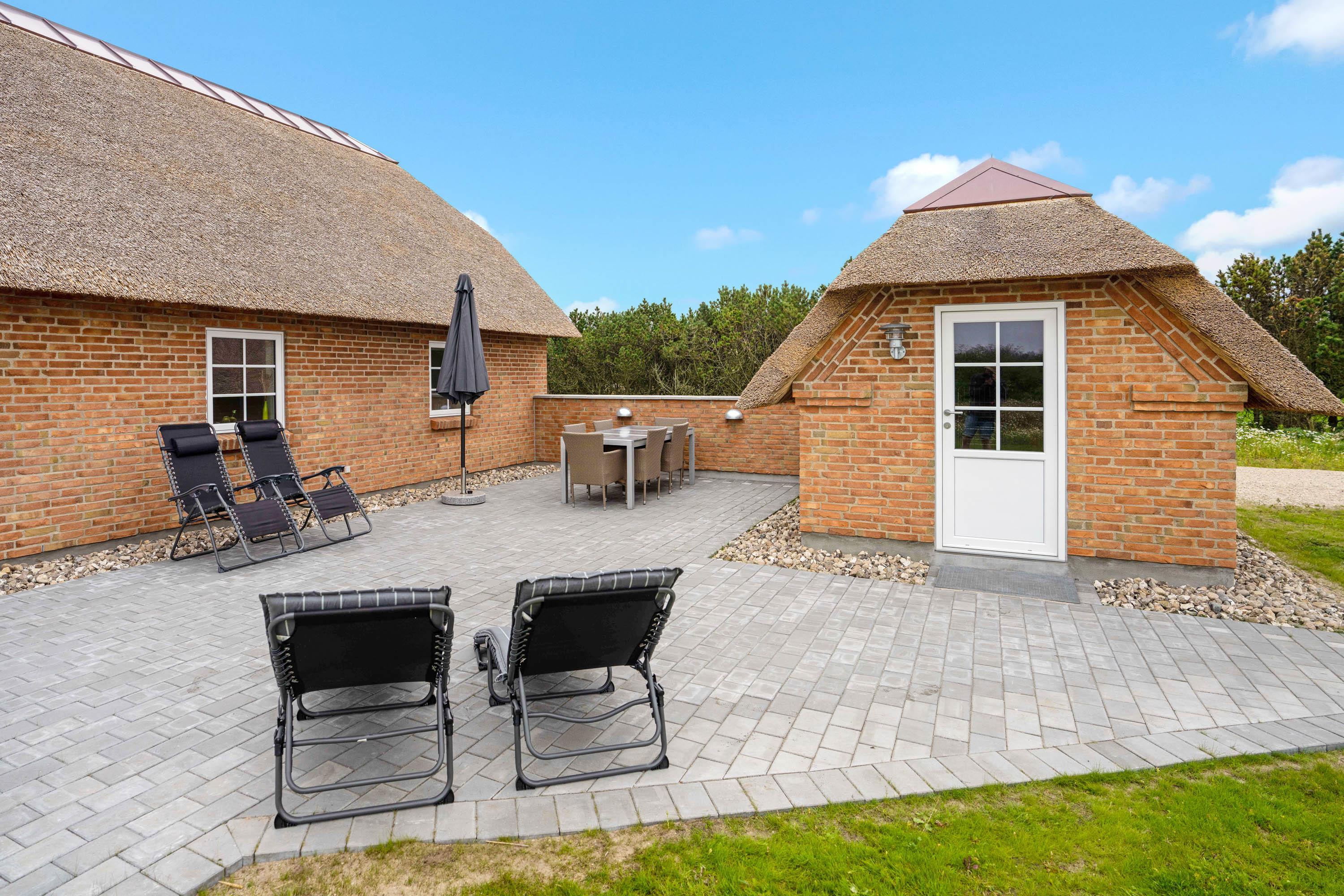 På den delvist afskærmede terrasse kan I nyde den friske luft og den smukke udsigt til de vestjyske klitter. Der er sørget for både havemøbler, liggestole og en praktisk gasgrill, så I har de bedste forudsætninger for at rykke udenfor, når vejret er til det. Der er en lademulighed til elbiler ved feriehuset (EW-link - STD-T25 16 Ampere). Der er også et ekstra køleskab med fryser i skuret.