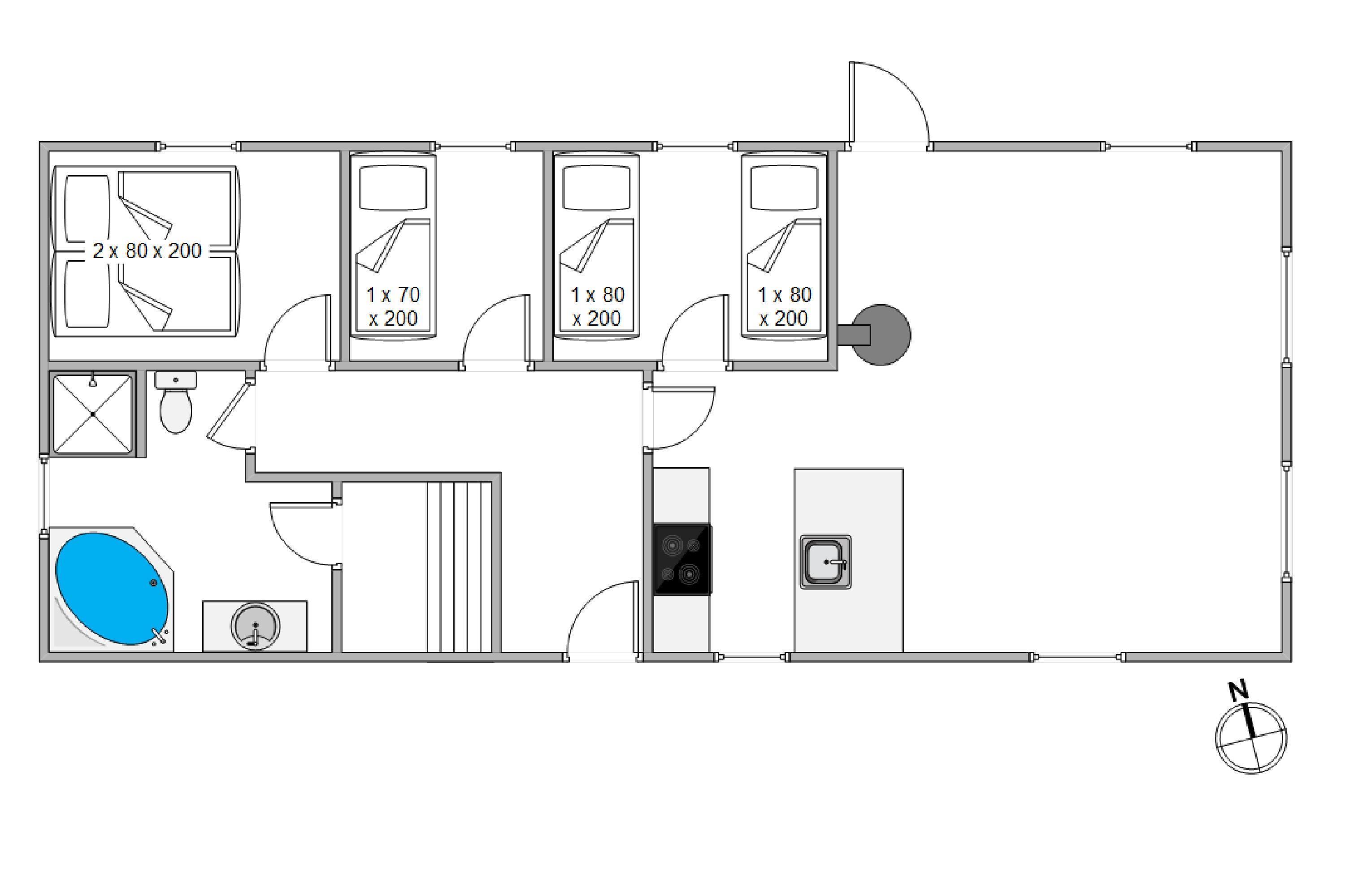I feriehuset i Vester Husby har I masser af plads at holde ferie på. Sofahjørnet og spiseområdet bliver varmet op af den klassiske brændeovn, og stue og køkken ligger i åben forbindelse til hinanden. Køkkenet blev renoveret i 2018, og her kan feriekokkene slippe fantasien og kreativiteten løs. Efter maden sørger opvaskemaskinen for oprydningen, så I kan bruge jeres tid på at holde ferie.