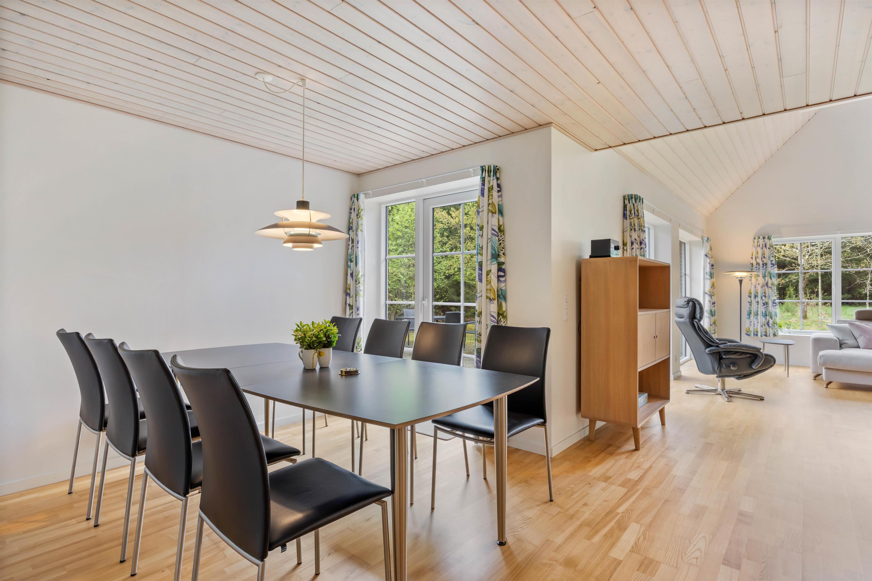 På første sal findes et mindre område som kan benyttes til opholds- eller legerum. Feriehusets absolutte samlingssted er den store stue med loft til kip og det velindrettede køkken med plads til alle, som ønsker at deltage i madlavningen. Her kan I tilbringe mange hyggelige feriestunder sammen. Stuens panoramavinduer giver jer fornemmelsen af at sidde midt i naturen. Brændeovnen sørger for en hyggelig feriestemning, hvor I kan sidde og slappe af og nyde flammerne.
