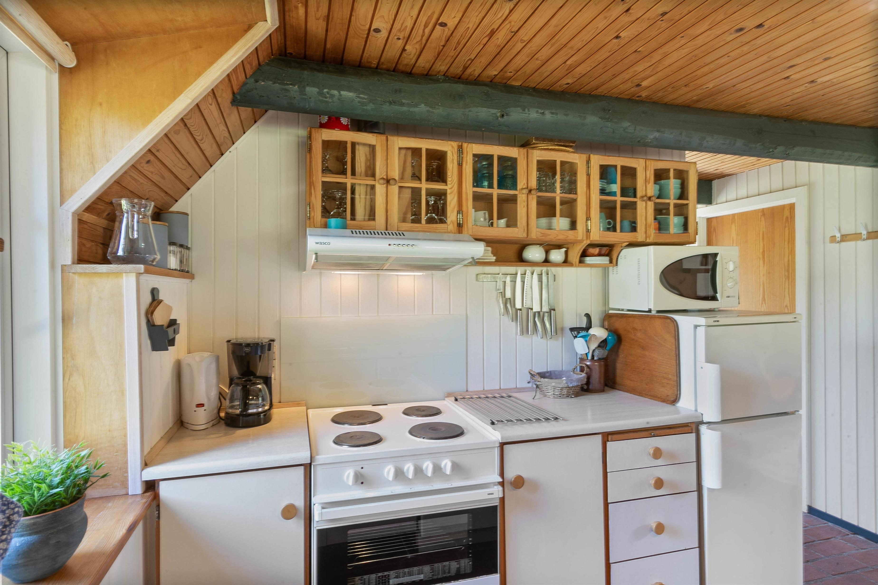 Dette hyggelige sommerhus byder på et lyst og indbydende stue- og spiseområde med komfortable siddepladser, fladskærms-tv og ikke mindst en stemningsskabende brændeovn. Her kan I nyde ægte sommerhushygge, mens ilden knitrer i baggrunden.