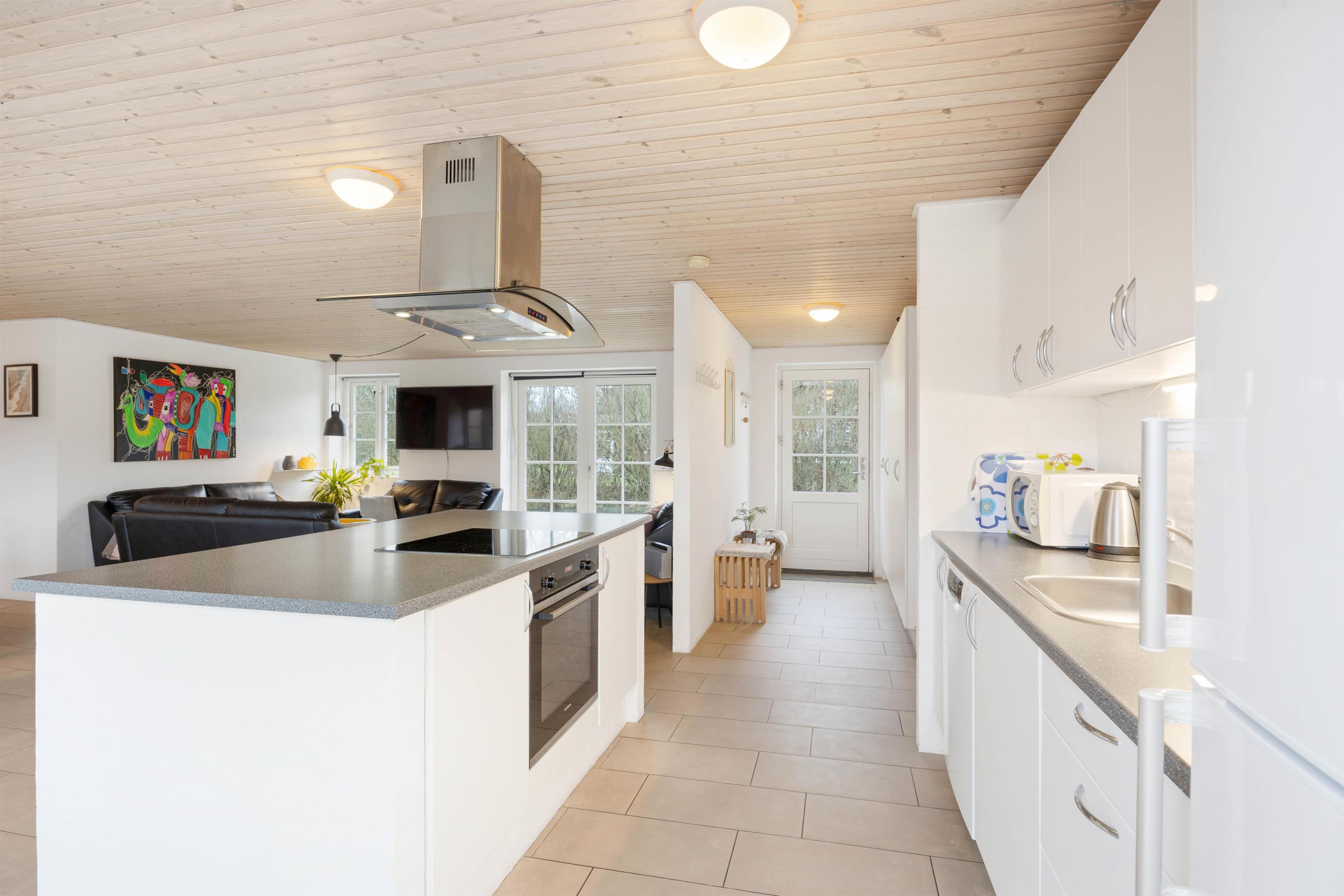 Det første, I vil blive mødt af, er de lyse omgivelser, som breder sig i alle sommerhusets rum. Spisestue og stue er i åben forbindelse med det flotte køkken, som er udstyret med alle nødvendige redskaber. Her finder I selvfølgelig også en opvaskemaskine, som klarer den værste opvask. Der er desuden vaskemaskine med indbygget tørretumbler.