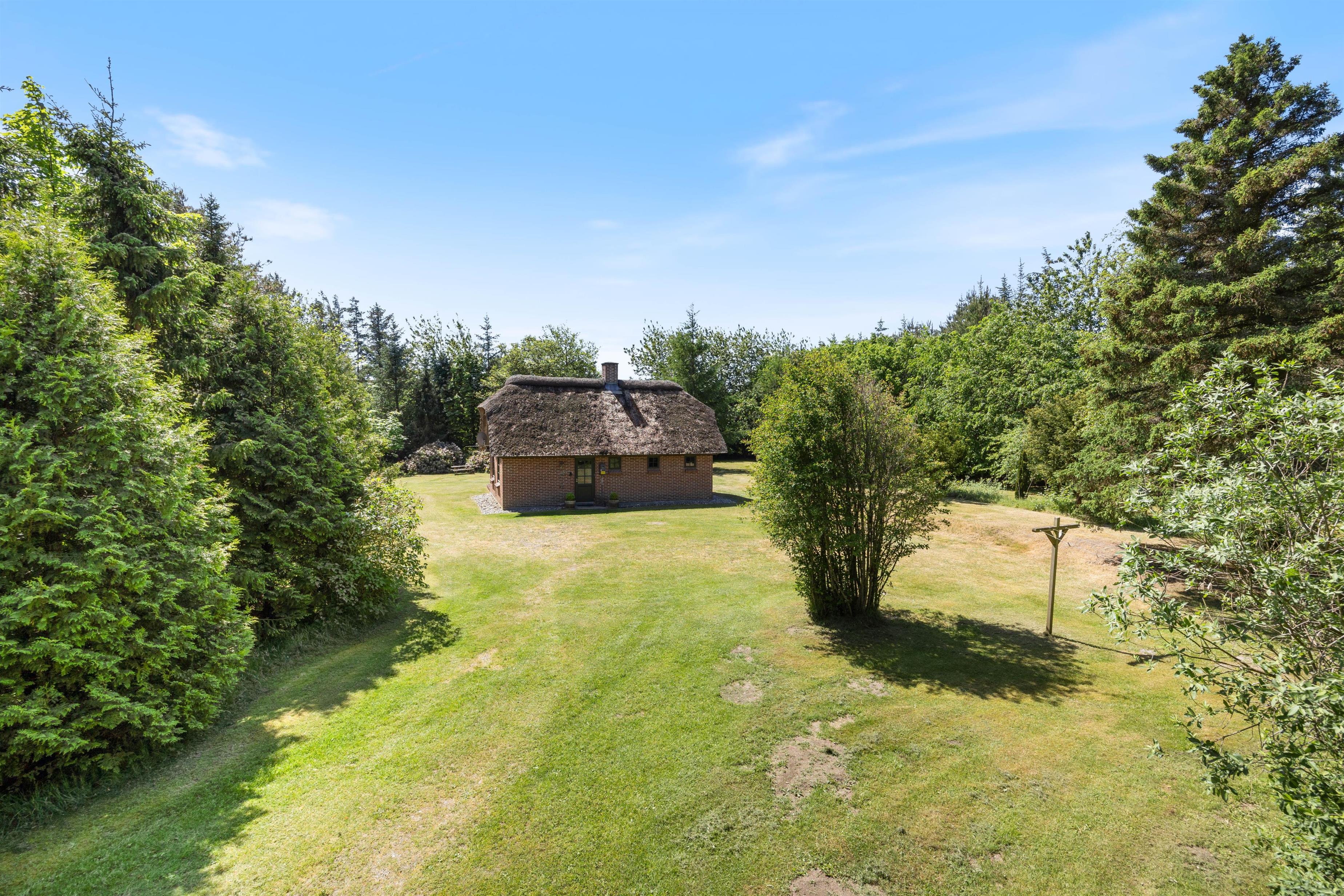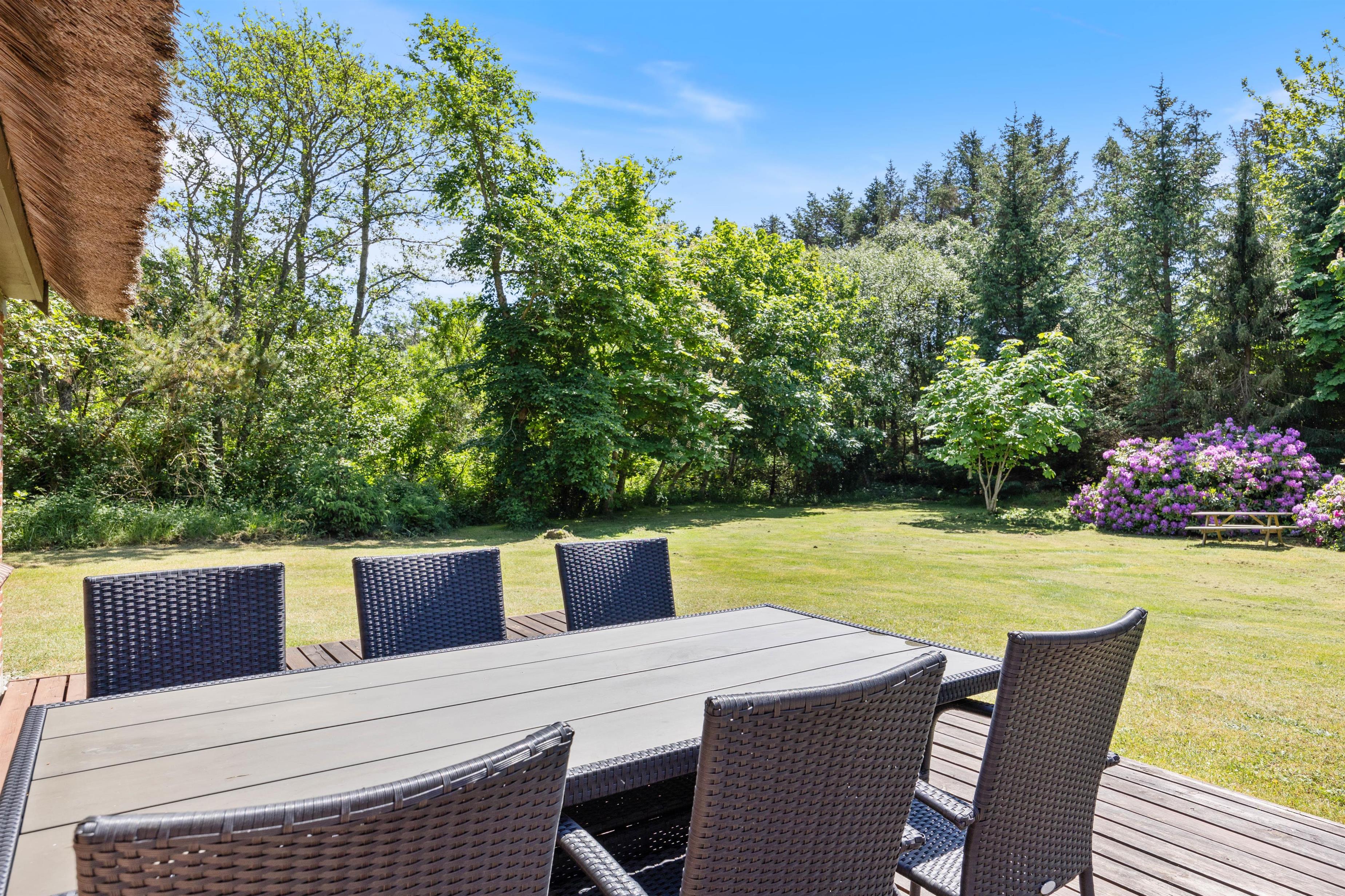 Fra stuen har I direkte adgang til en sydvendt træterrasse med udsigt, ud over det grønne. Sommerhuset er omgivet af store træer, som giver godt læ fra vinden, og afskærmer for nysgerrige blikke. Sommerhuset ligger i et naturskønt sommerhusområde med masser af dyreliv, som I nogle gange kan observere fra sommerhuset. Her kan I slappe af, tænde op i sommerhusets tilhørende grill, og bare nyde hinandens gode selskab.