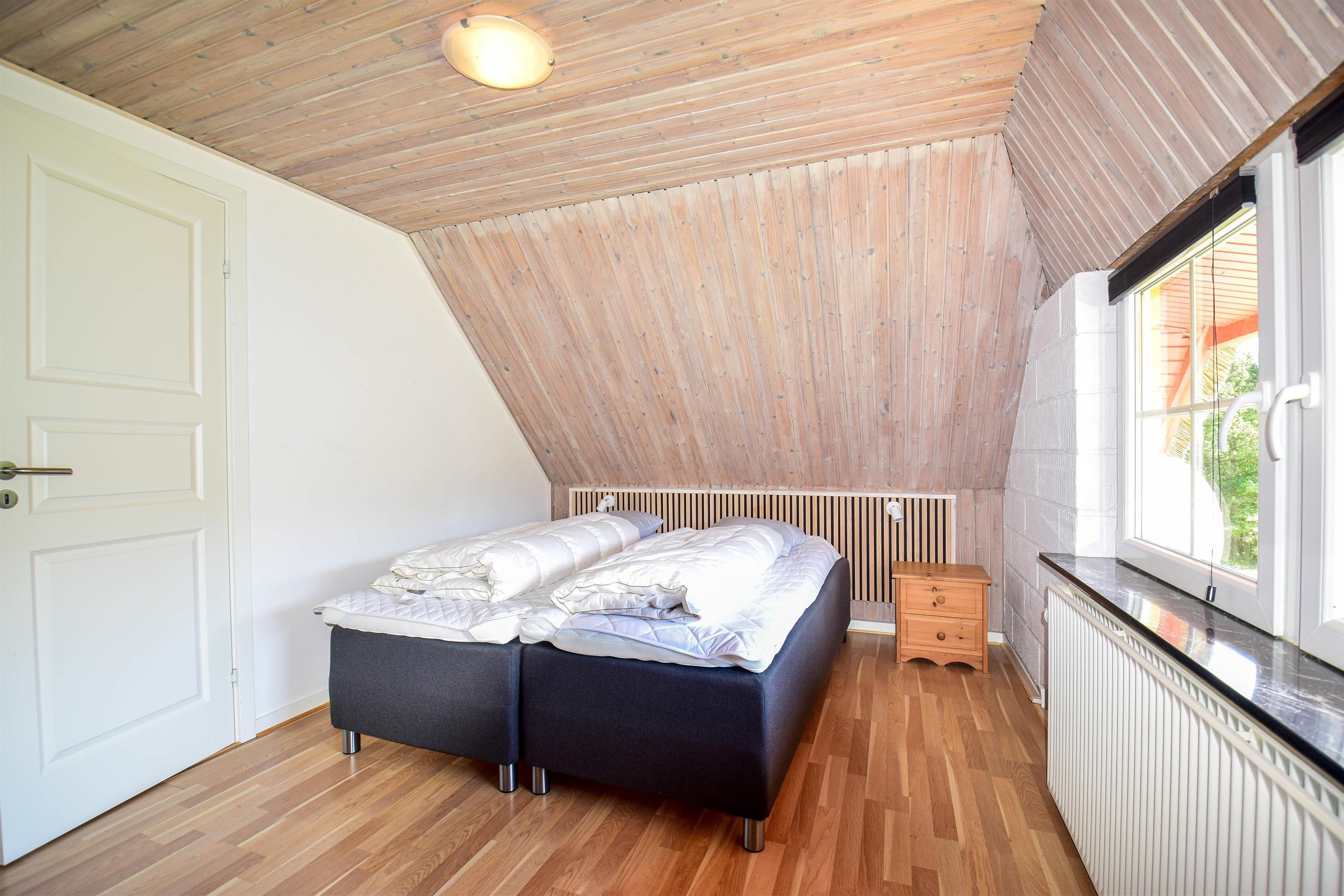 Fra stuen fører en smuk vindeltrappe op til 1. sal, hvor du finder en lille gang, et gæstetoilet og to dejlige soveværelser: