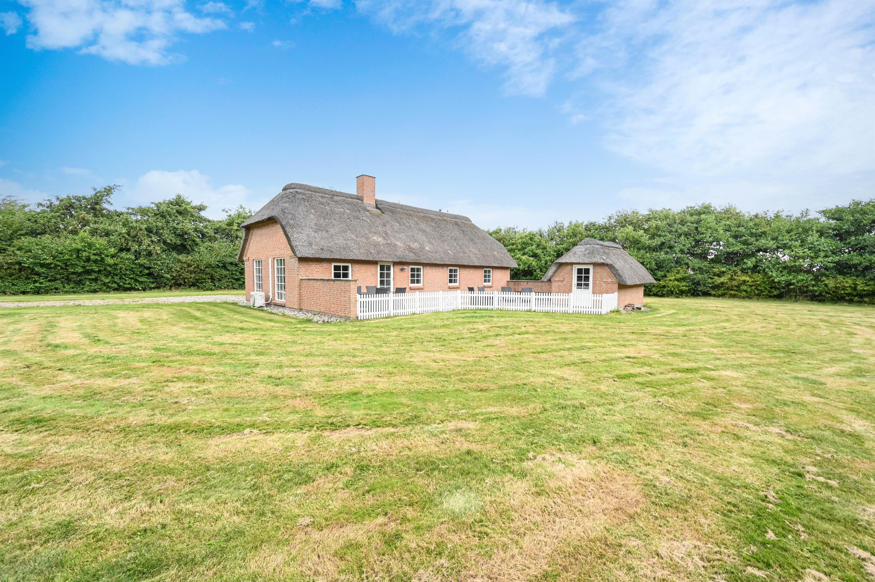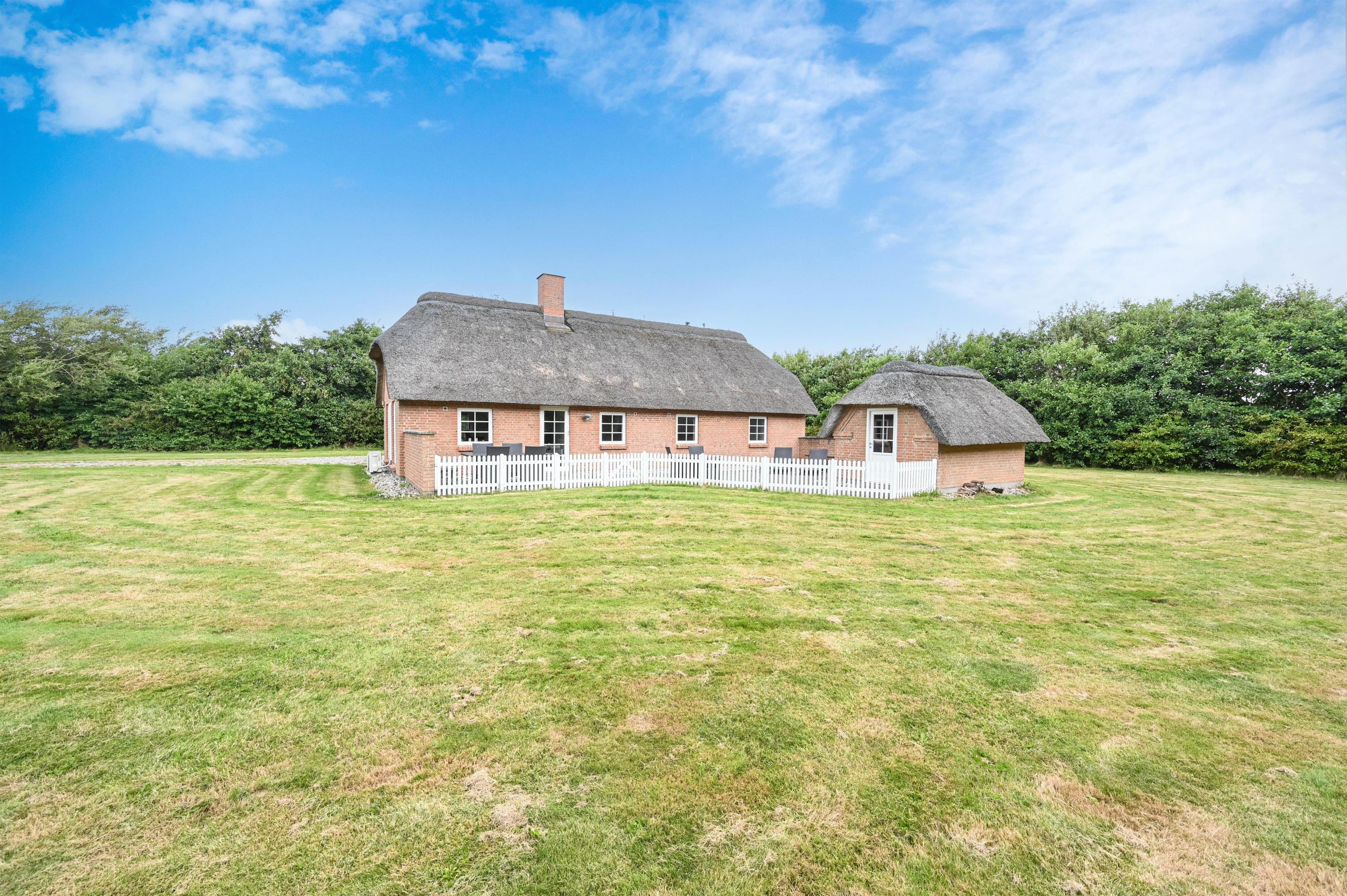 Huset er bygget i mursten med stråtag og ligger på en 3.500 m² stor, delvist plejet naturgrund – kun 1.200 meter fra Vesterhavet.