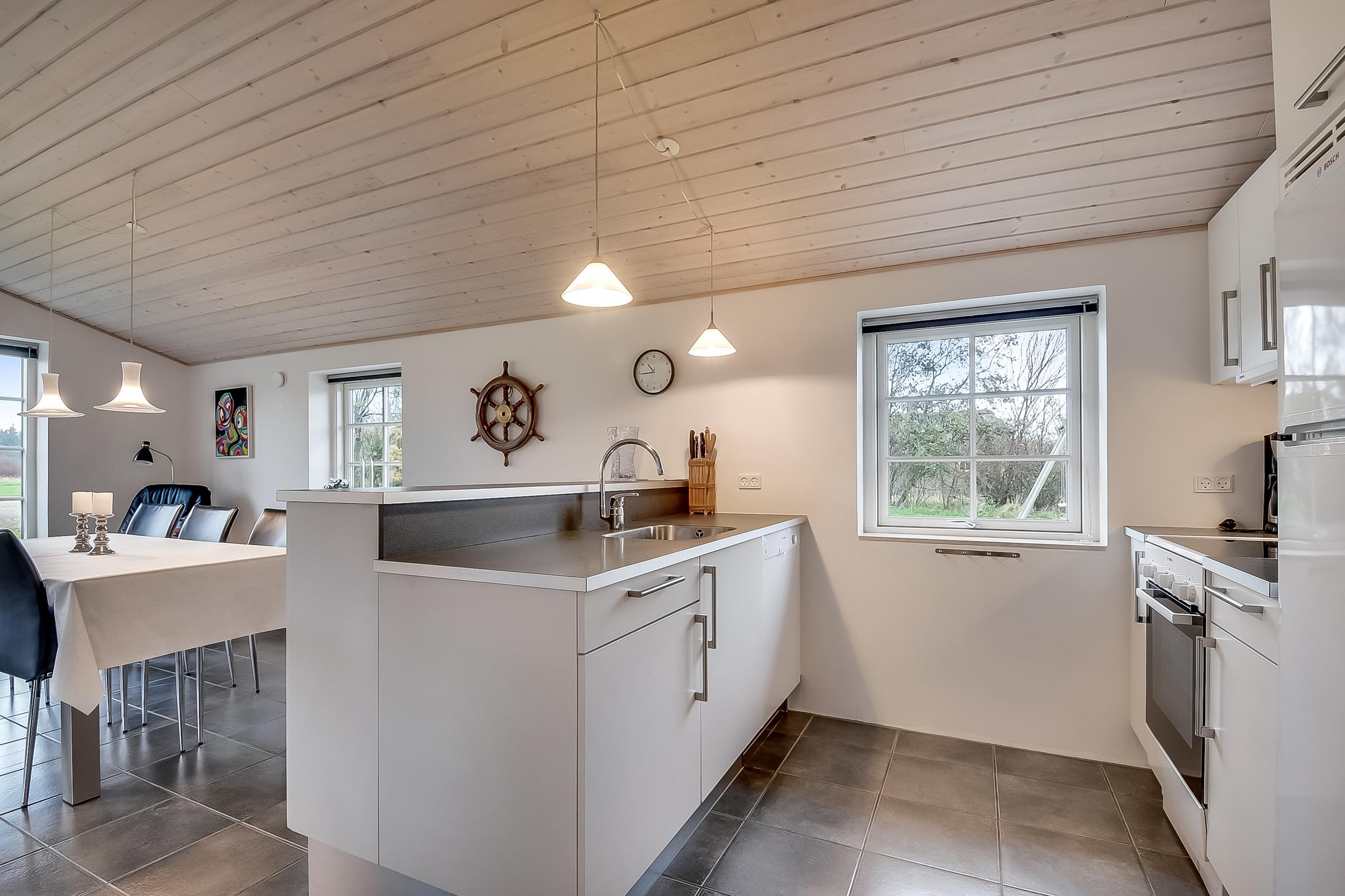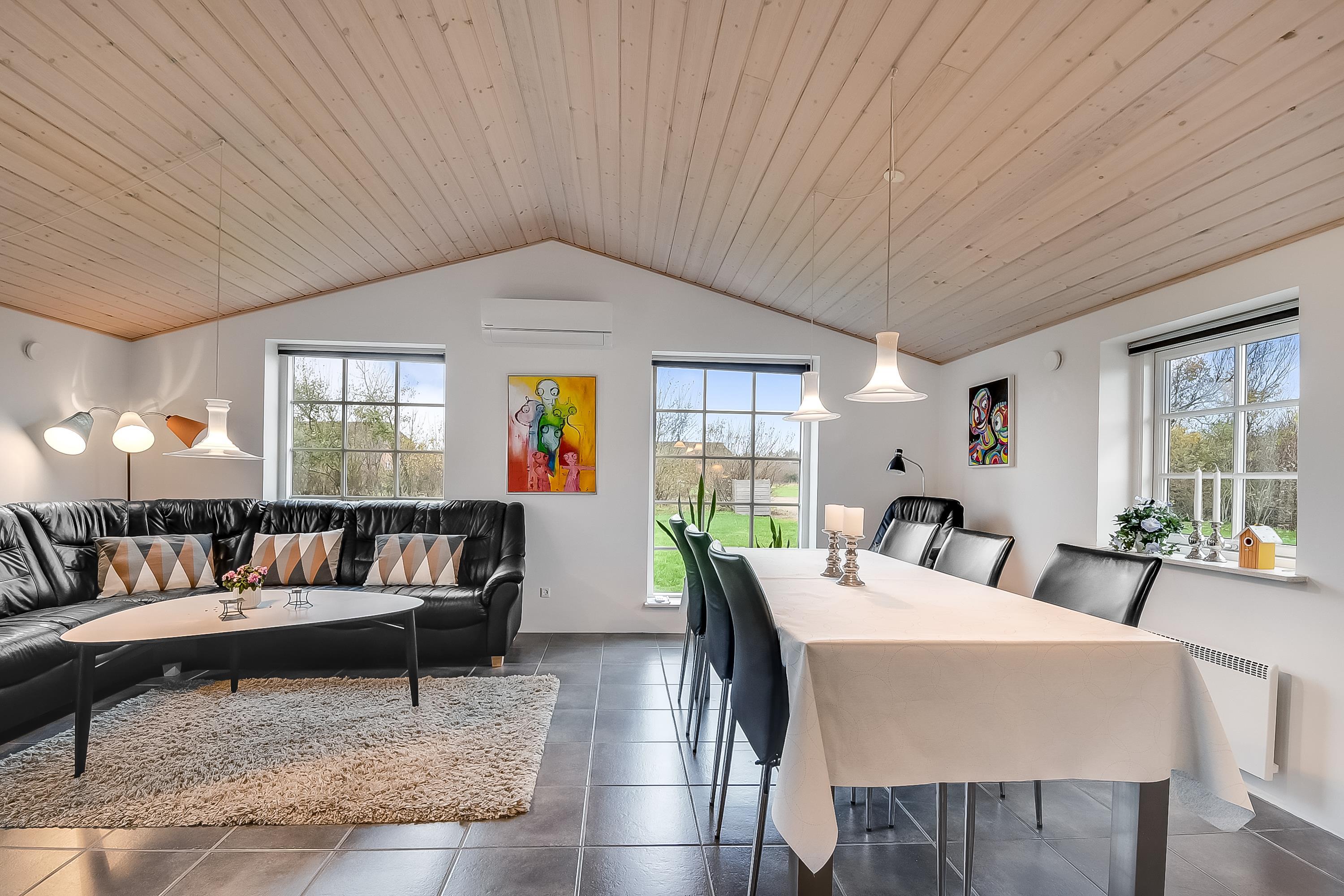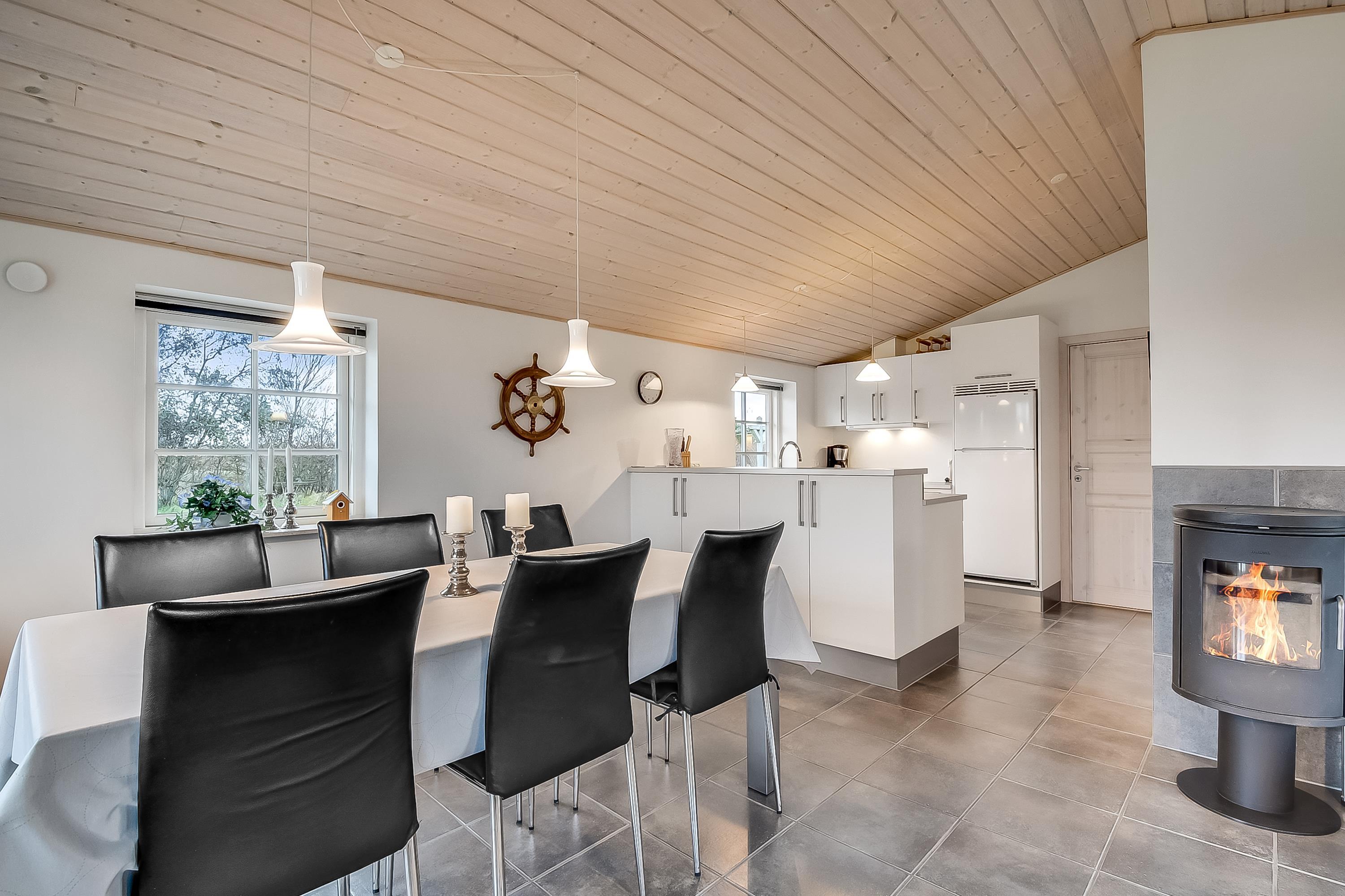 Det åbne køkken/alrum giver god plads til samvær, mens brændeovnen og den energieffektive varmepumpe sørger for en behagelig temperatur året rundt – varme om vinteren og kølighed på sommerdage.
