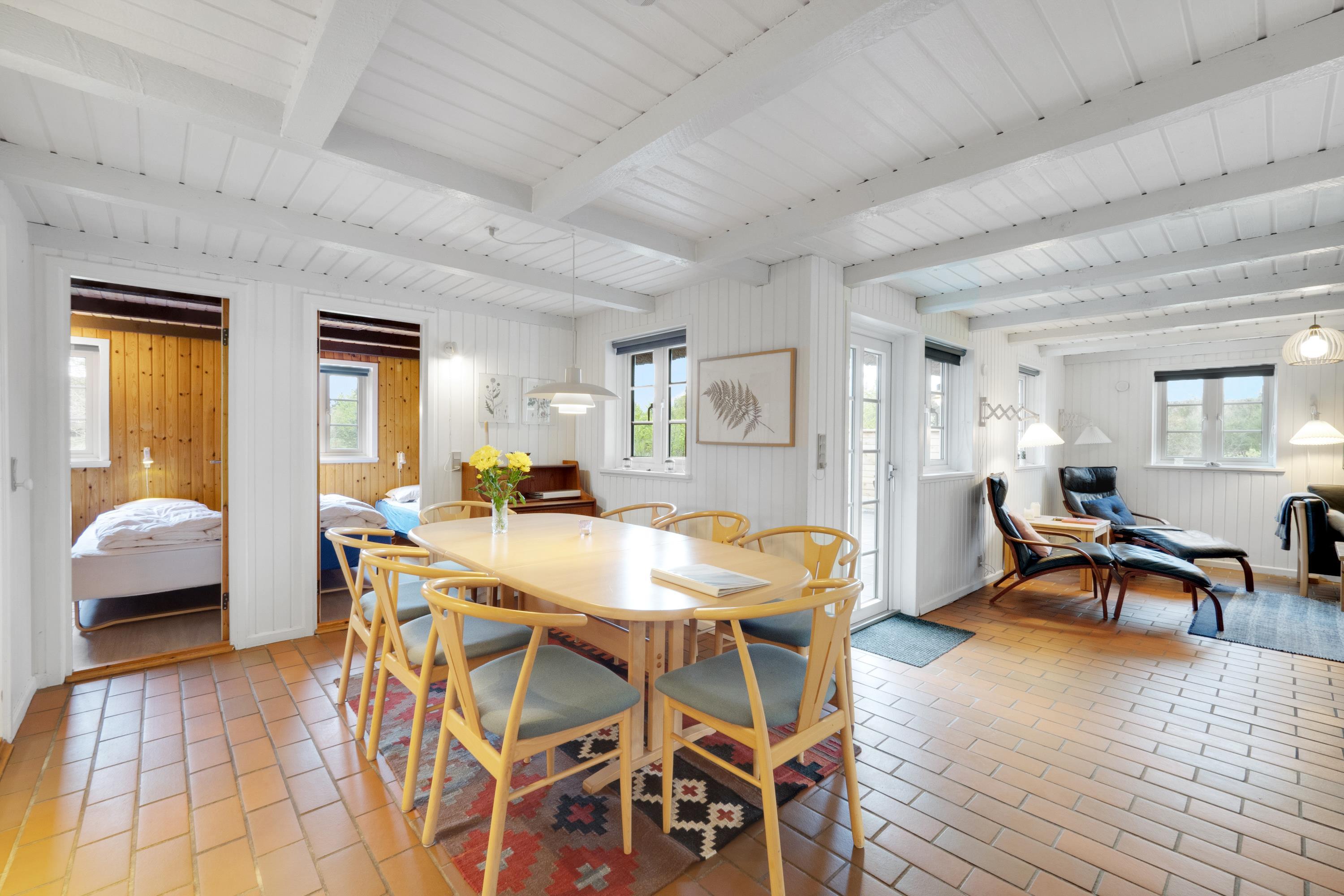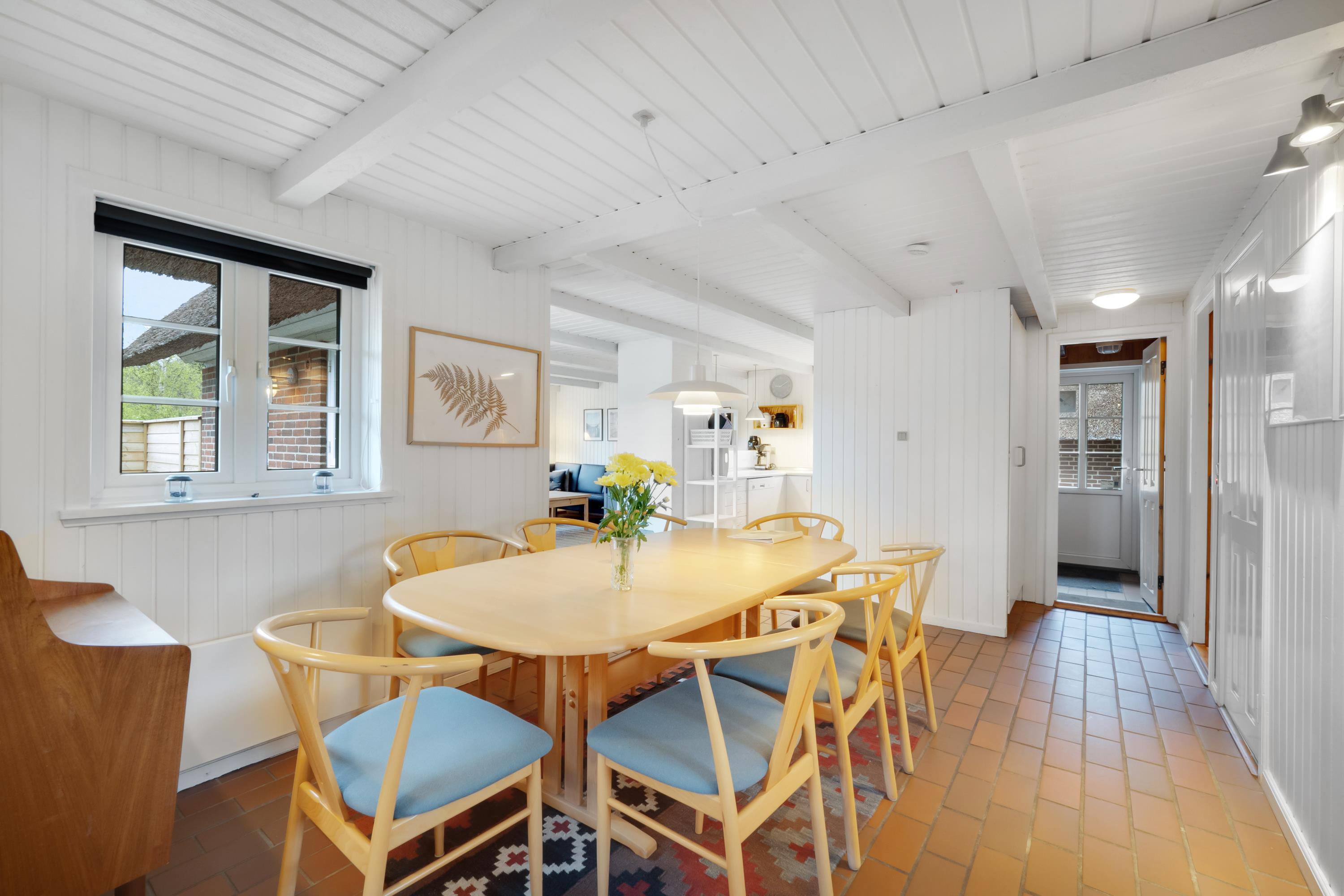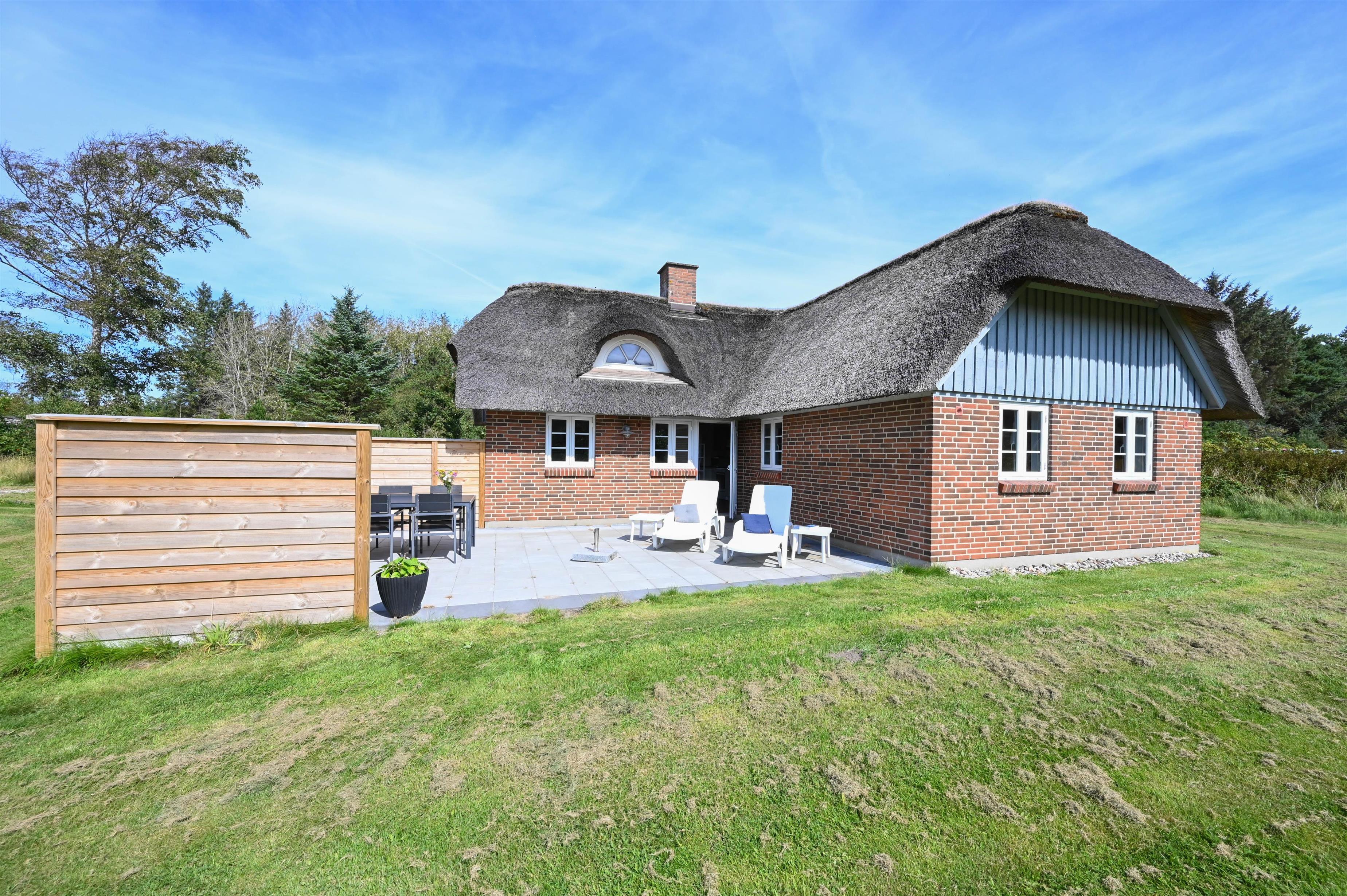 Huset er bygget i mursten med smukt stråtag og fremstår pænt og velholdt – et klassisk feriehus, hvor hyggen og den afslappede stemning er i fokus.
