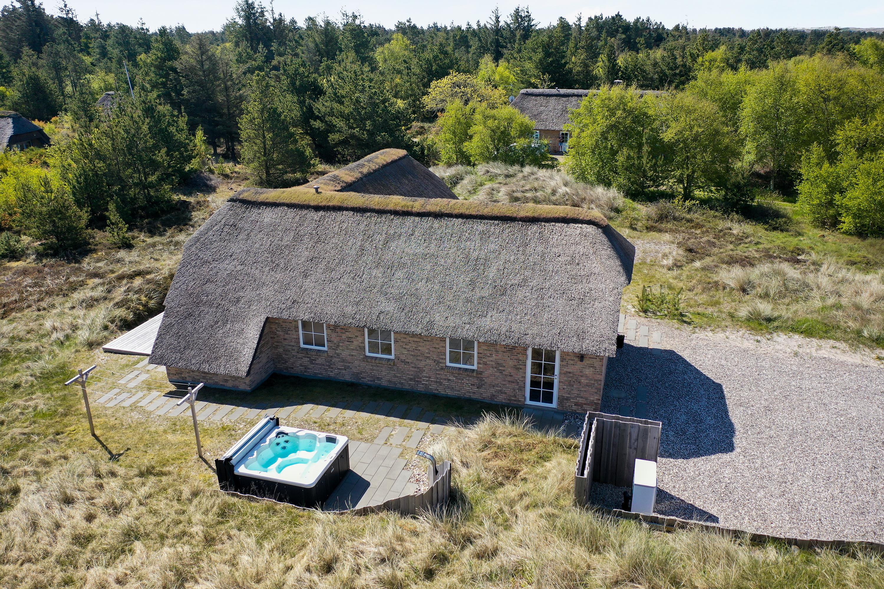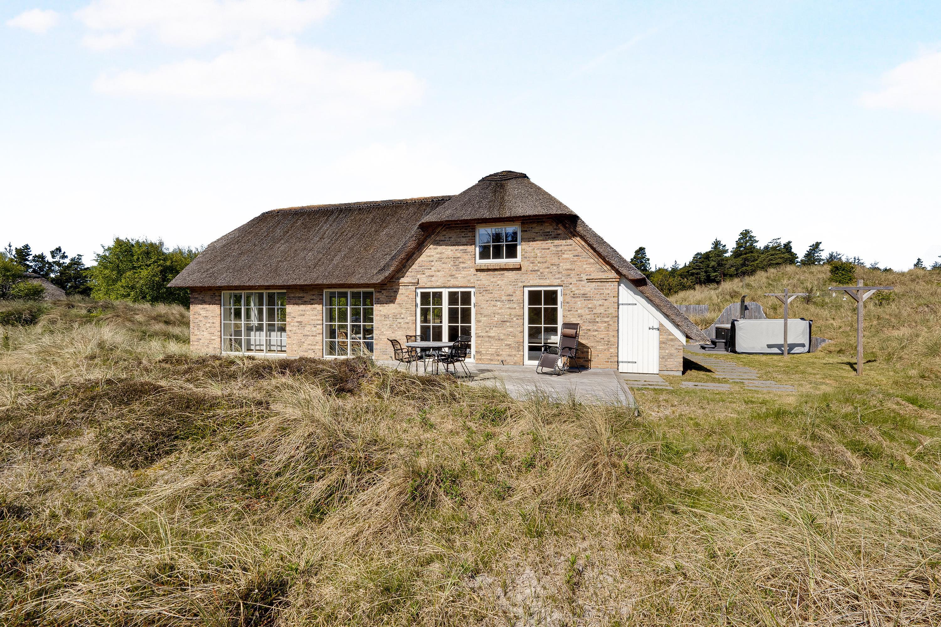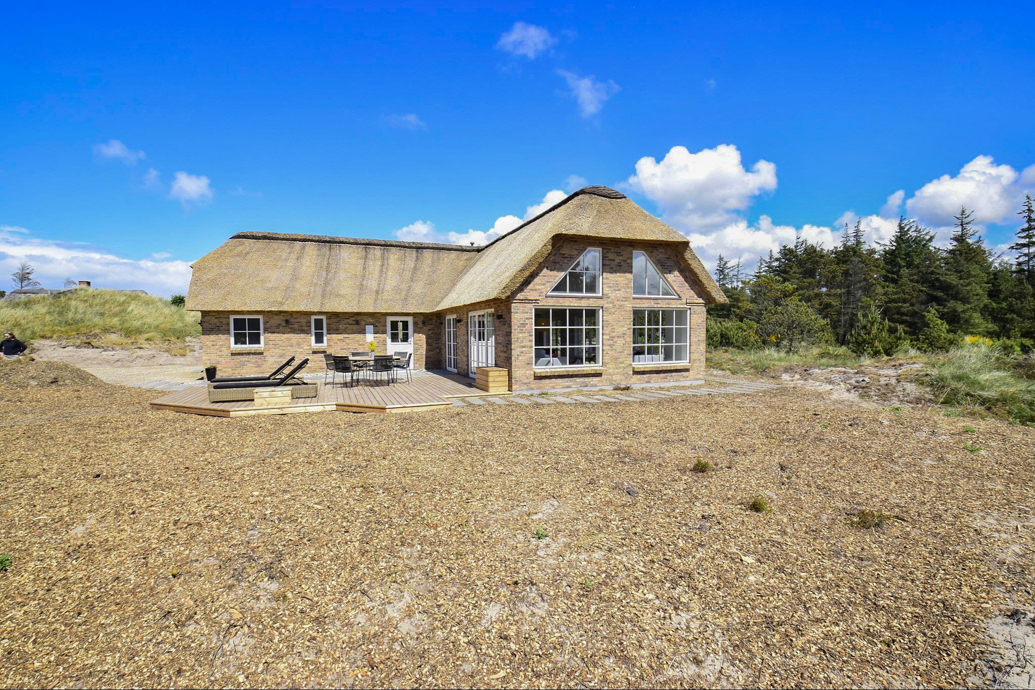 Dette flotte nye feriehus er beliggende på en smuk kuperet klitgrund med lyng planter og marehalm. Huset er bygget med bl.a. store vinduespartier så det smukke klitlandskab kan nydes både ude og inde.Rundt om huset er der gode terrasser, så man altid kan finde et hjørne med læ og nyde udelivet med havets brusen i baggrunden.
