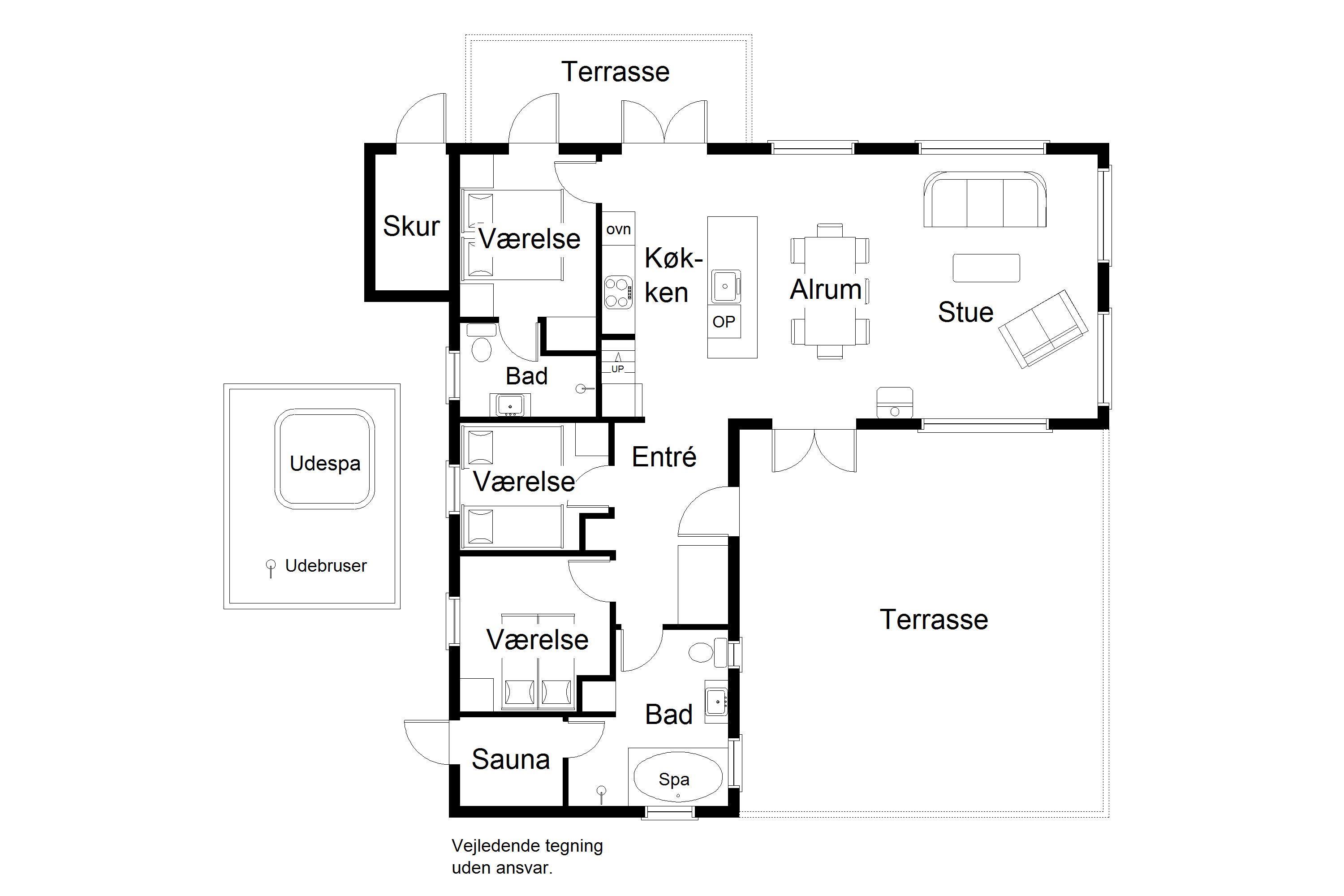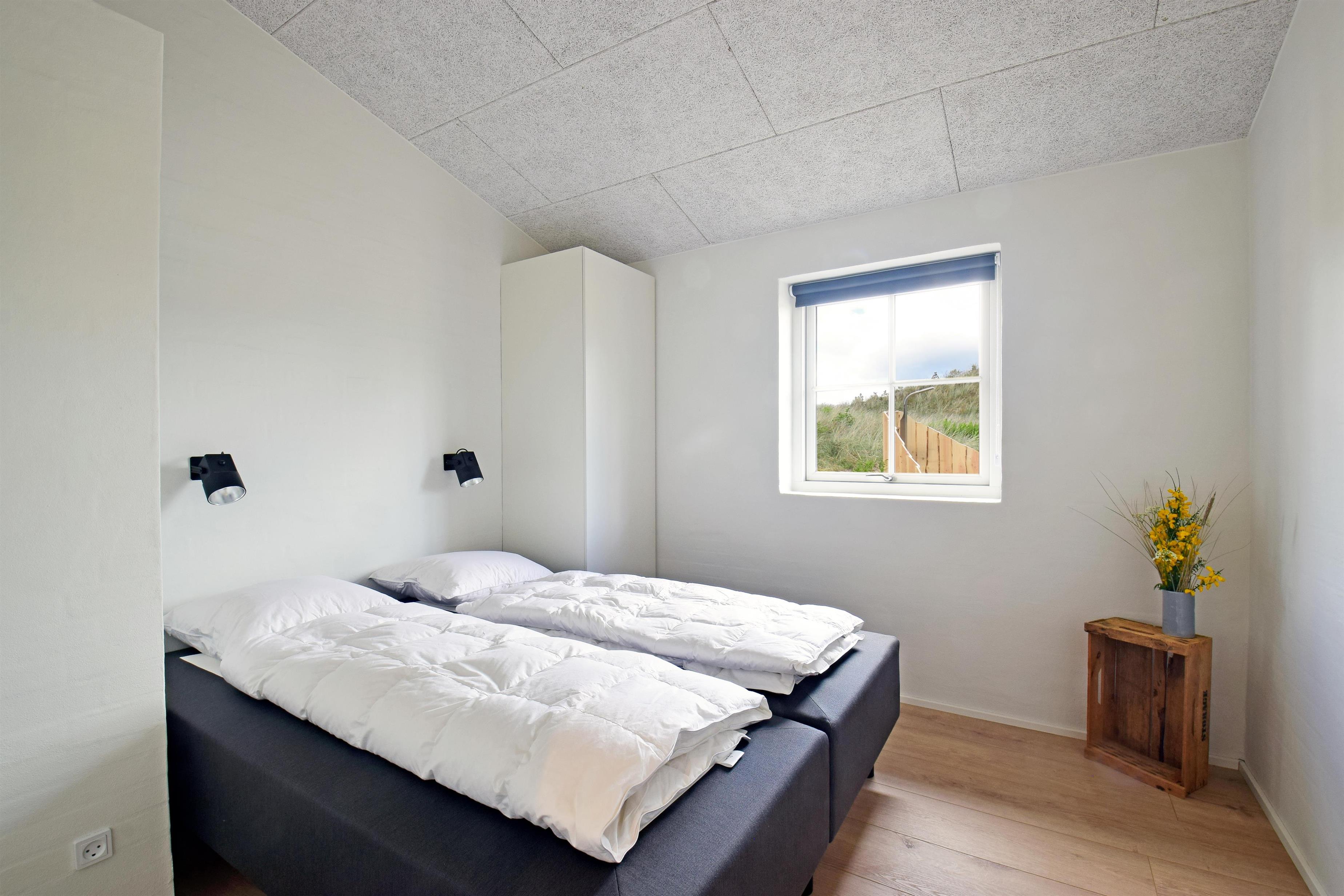 Indretning: Entre med plads til overtøj og sko. Værelse med 2 enkelte senge. Værelse med dobbeltseng. Soveværelse med dobbeltsenge og adgang til badeværelse med bruseniche. Huset har et stort luksusbadeværelse med bruseniche, spabad og sauna, hvorfra der også er udgang til terrasse med udendørsspabad. Husets køkken er i åben forbindelse med stuen, hvor der er loft i kip og store vinduespartier så klitplanskabet kan nydes fra både sofa og spiseplads.