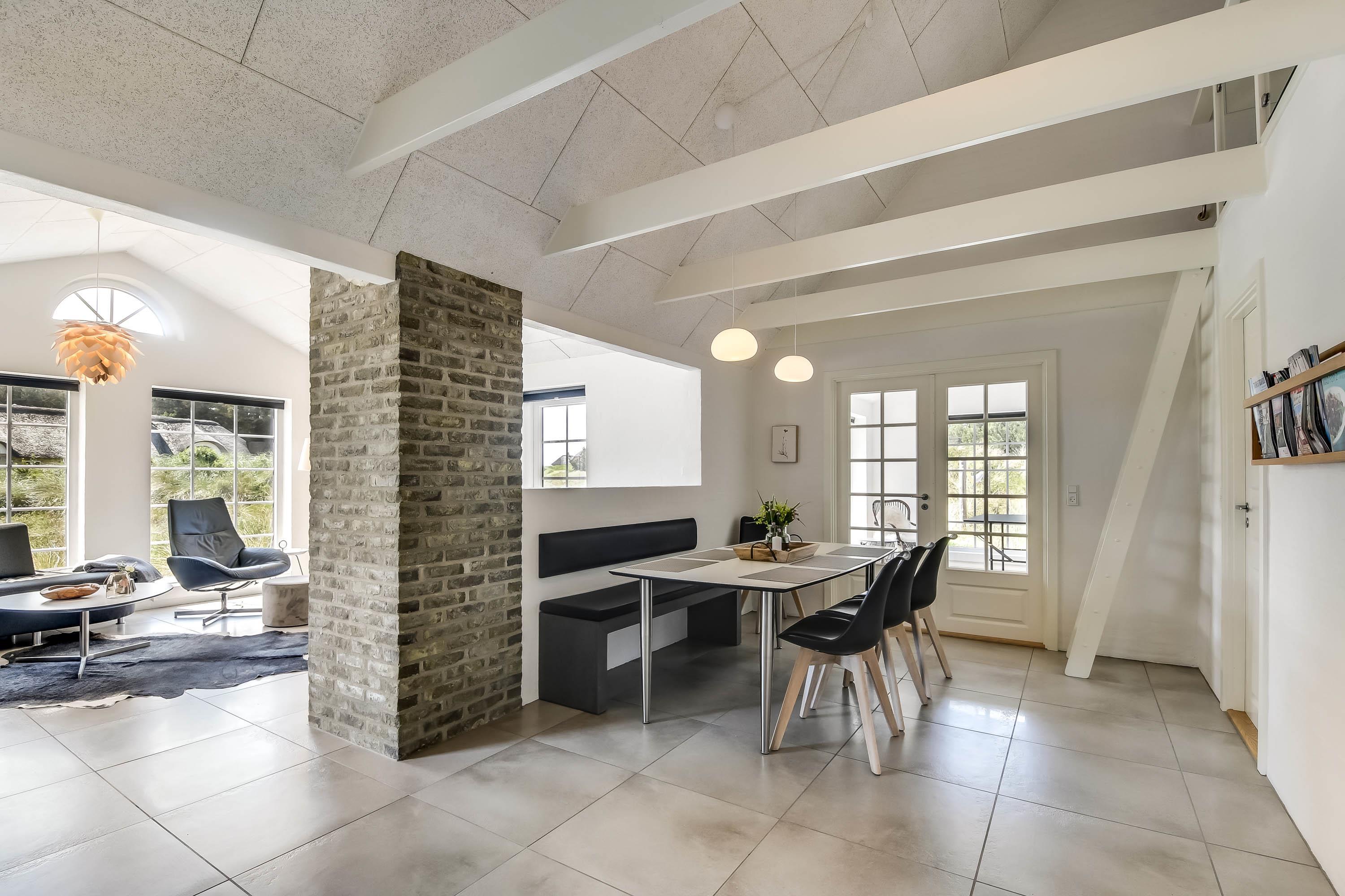Det rummelige køkken/alrum ligger i åben forbindelse med stuen, hvor den flotte brændeovnsindsats spreder varme og feriestemning.