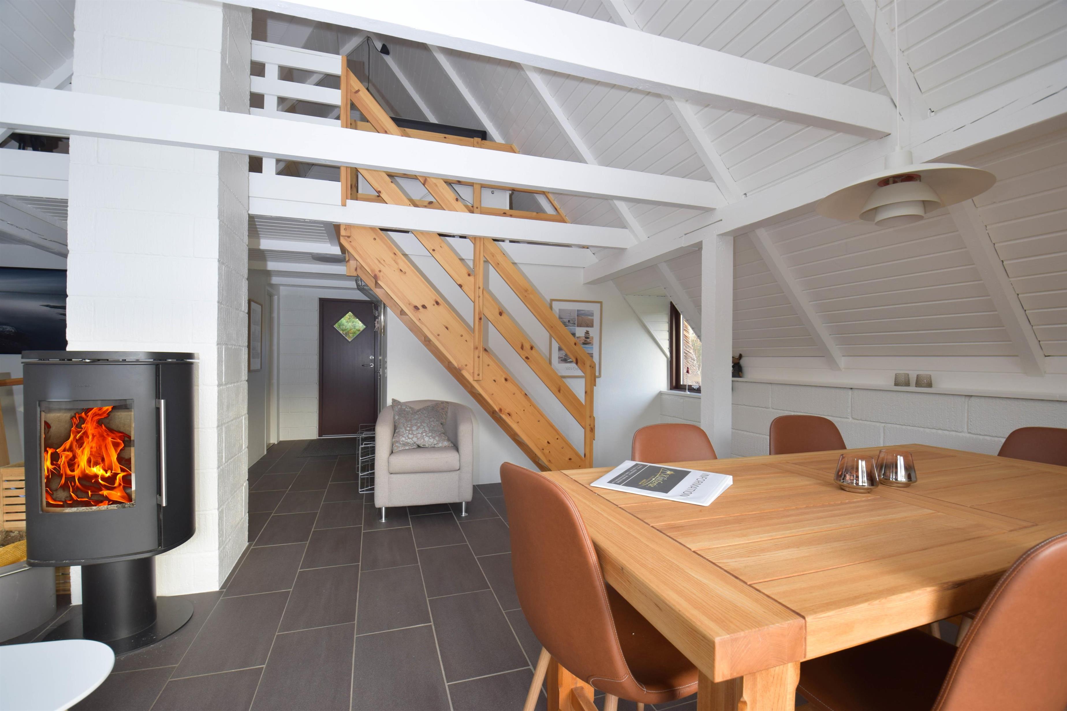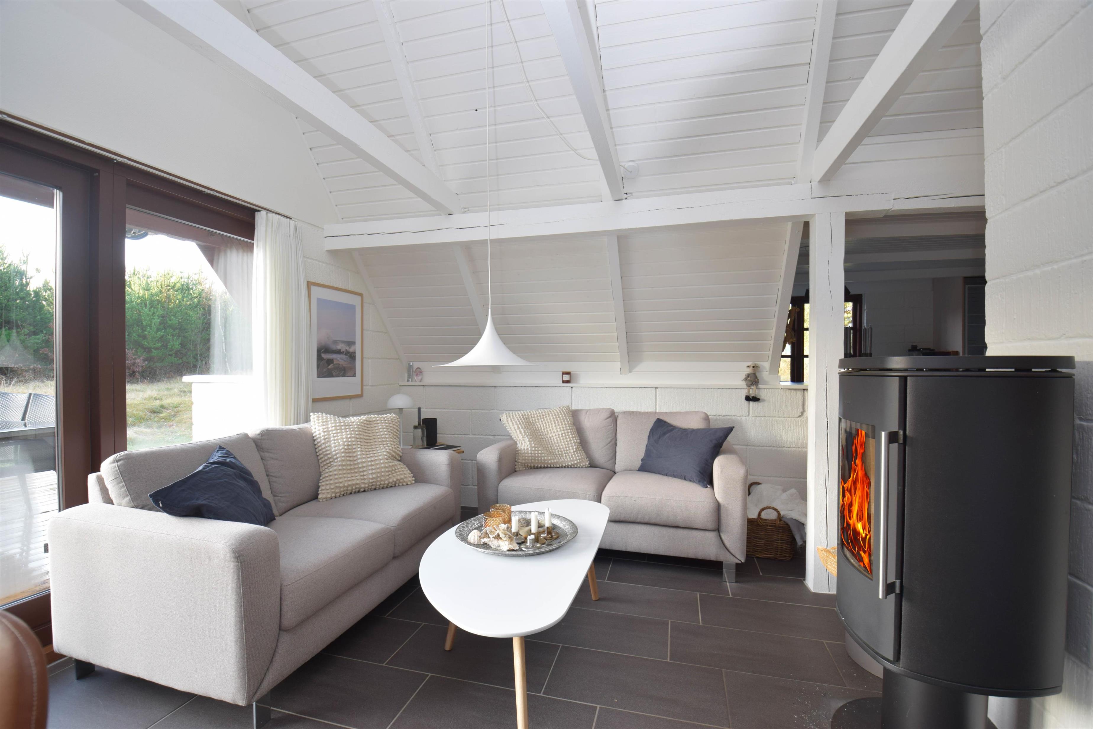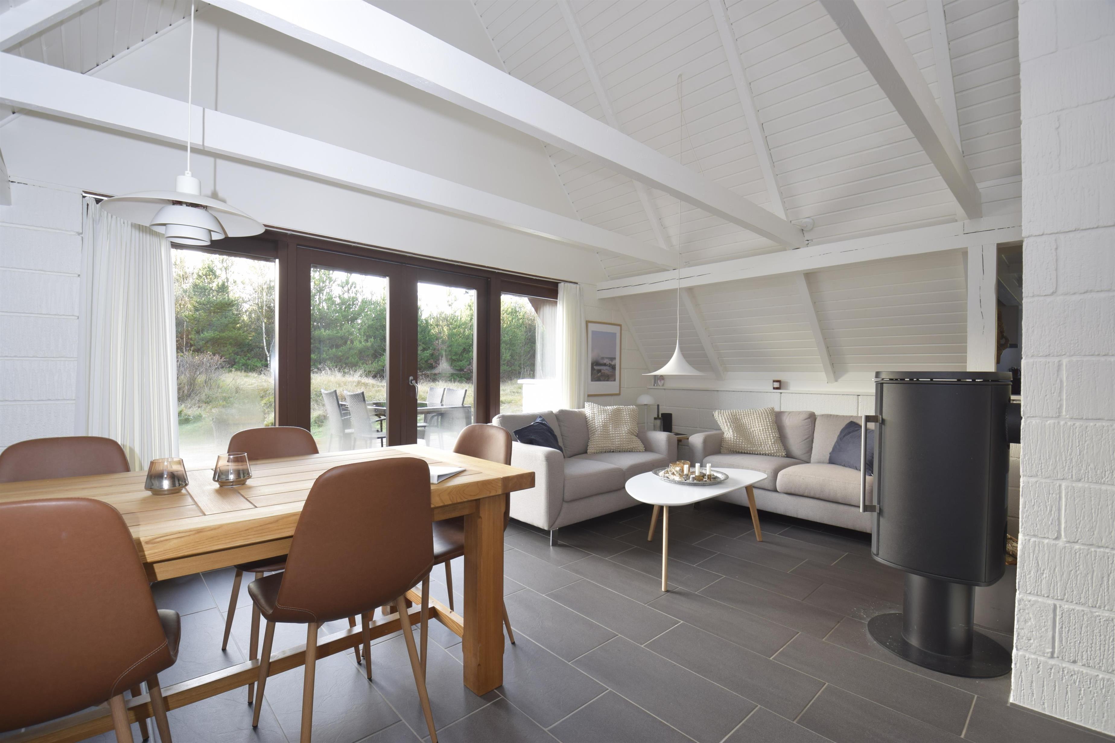 Stue med komfortable møbler, spiseplads, brændeovn og udgang til sydvendt terrasse