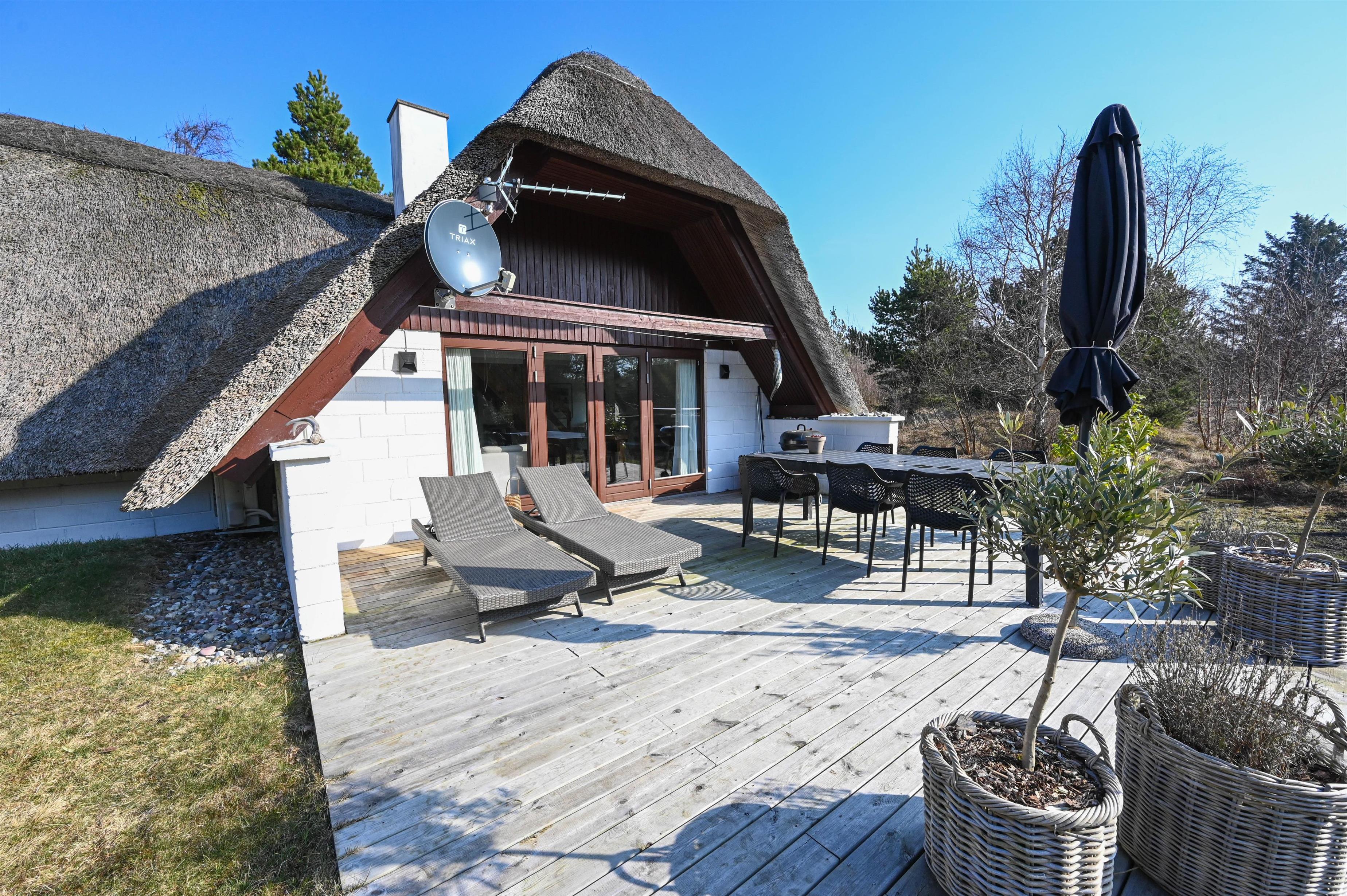 Fra den sydvendte terrasse har du en skøn udsigt over den kuperede, lyngbeklædte grund, hvor du kan finde både sol, læ og ro – et ideelt sted til afslapning efter en lang gåtur.