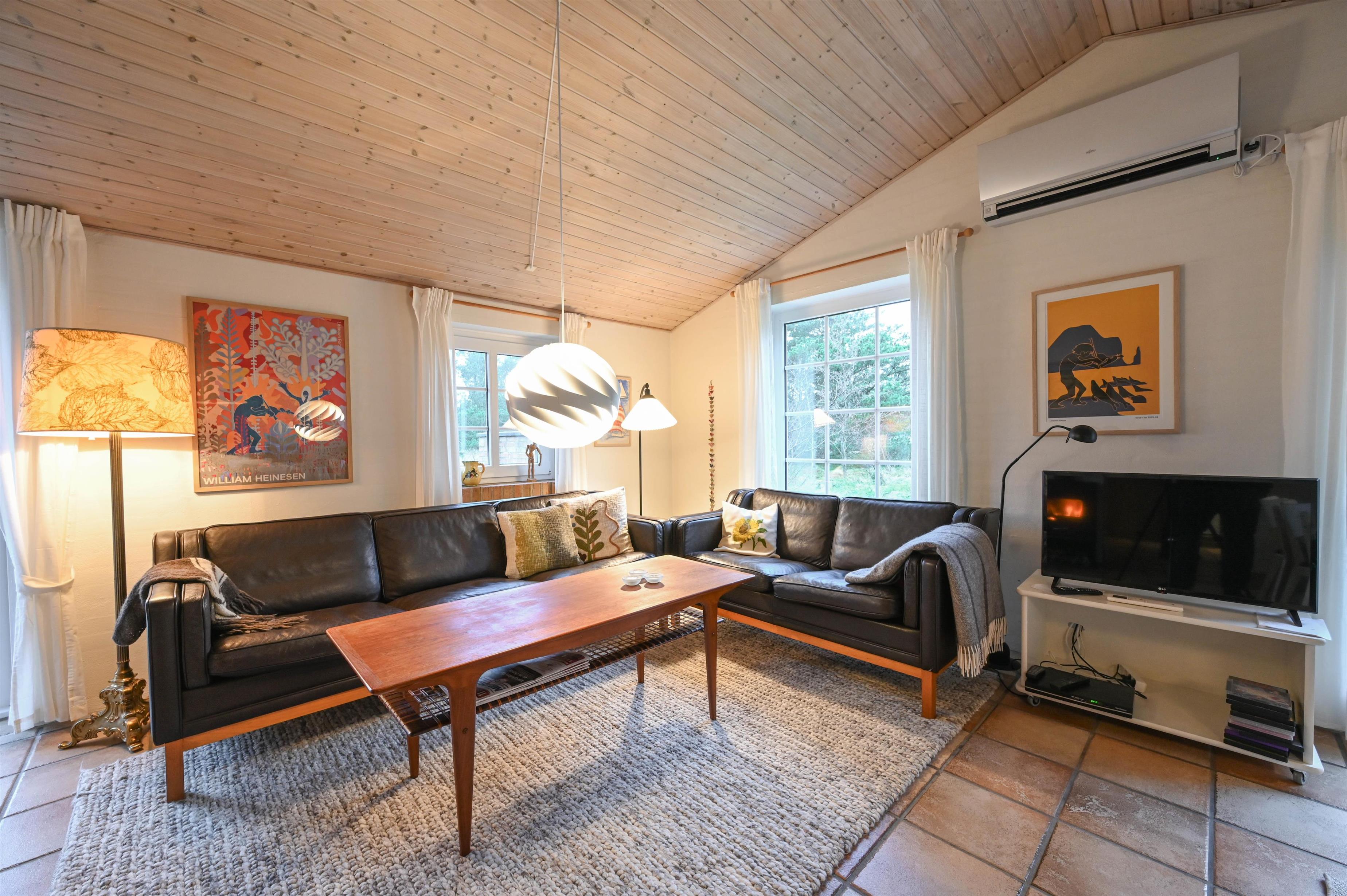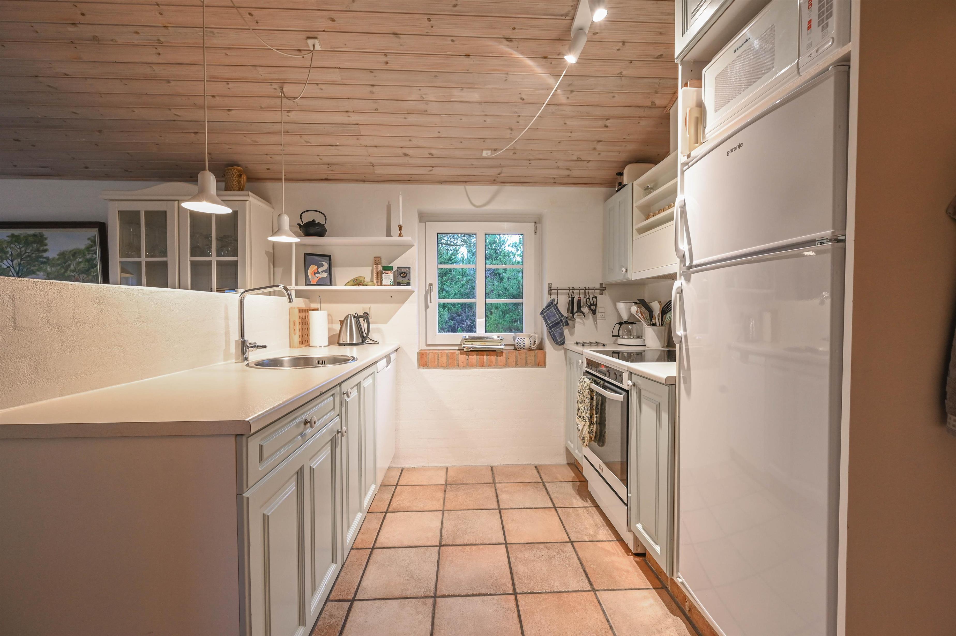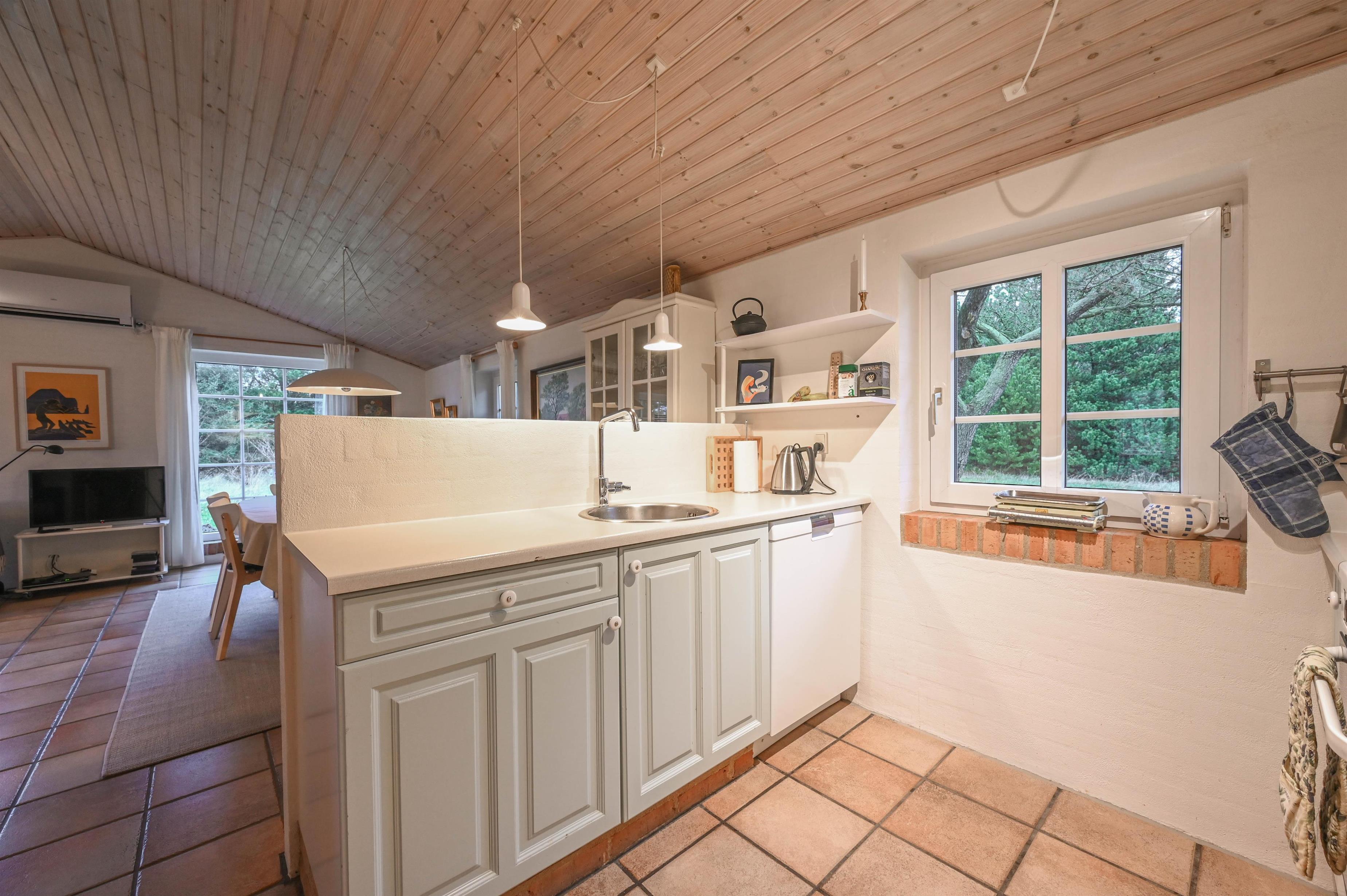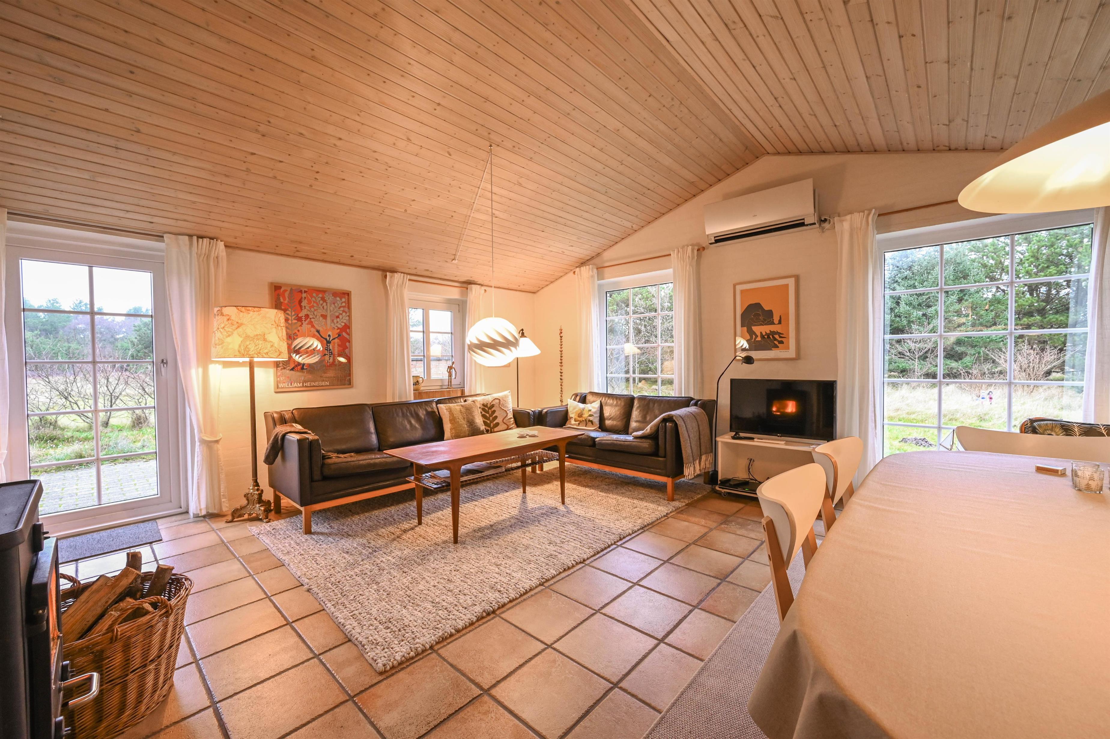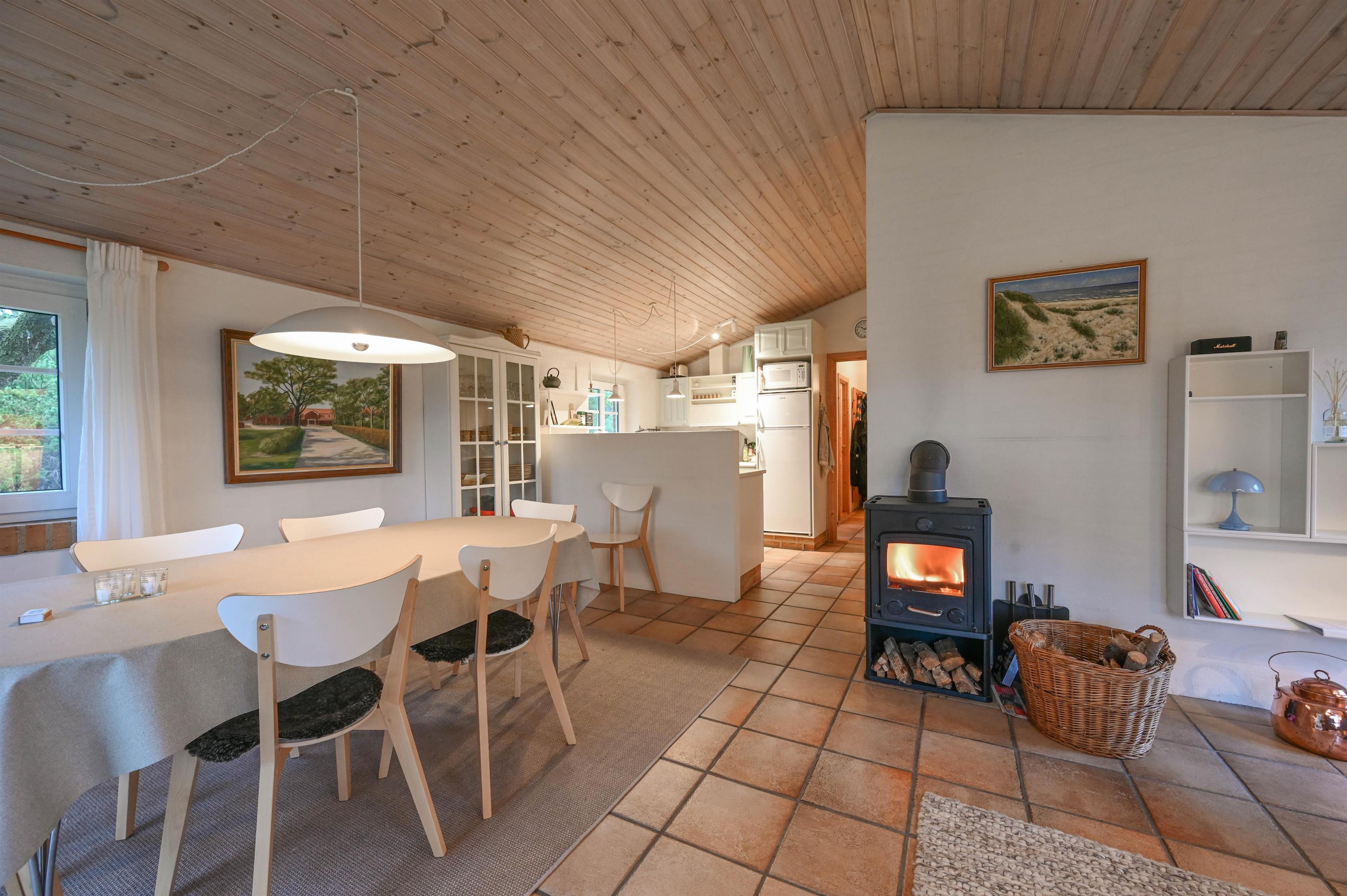 Det lyse køkken/alrum ligger i åben forbindelse med stuen, som er indrettet med hyggelige møbler, TV og brændeovn – her er det nemt at falde til og lade feriestemningen sænke sig.