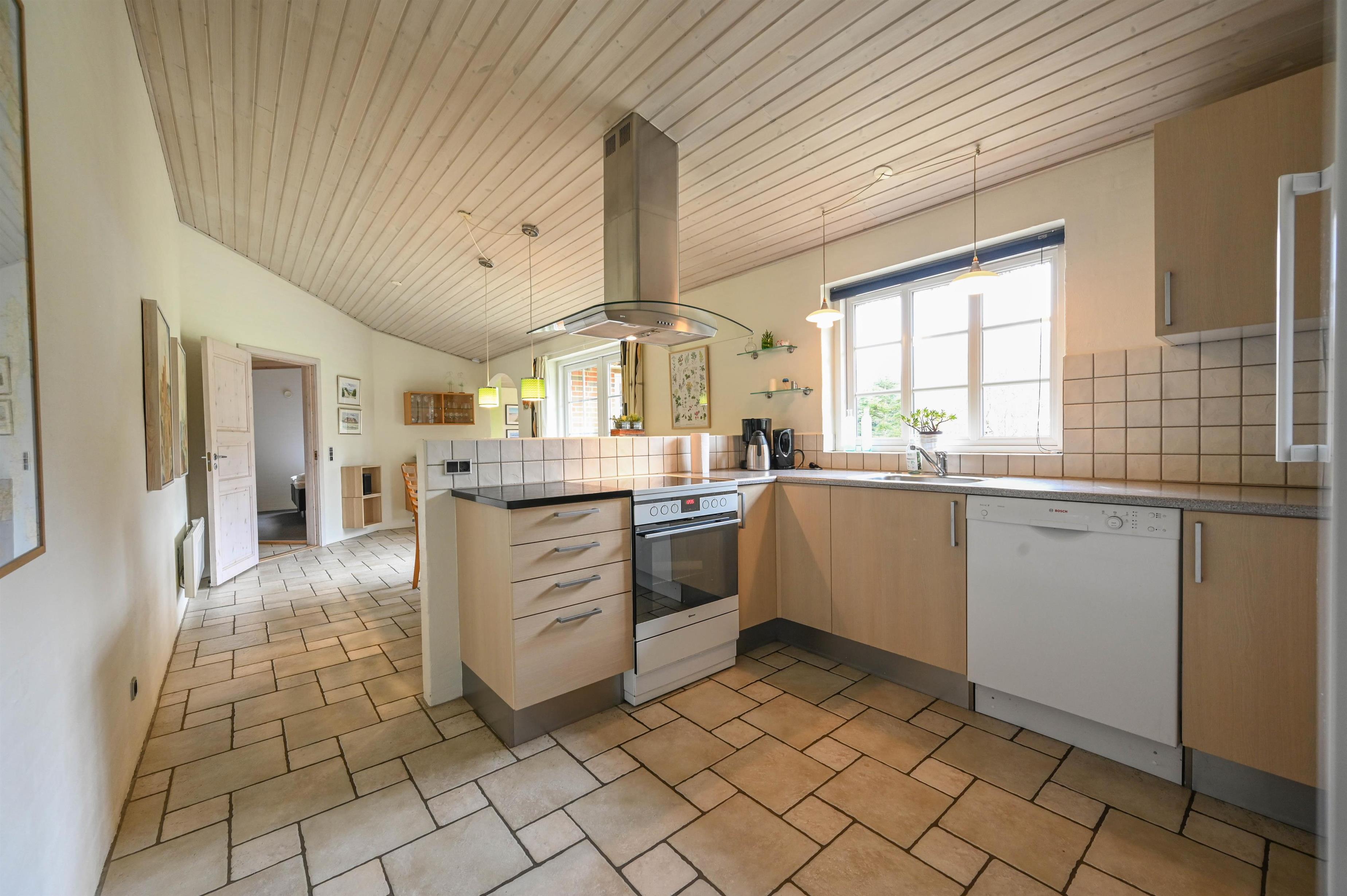 Det åbne køkken/alrum med brændeovn og varmepumpe danner husets hjerte – et lyst samlingspunkt for familie og venner.
