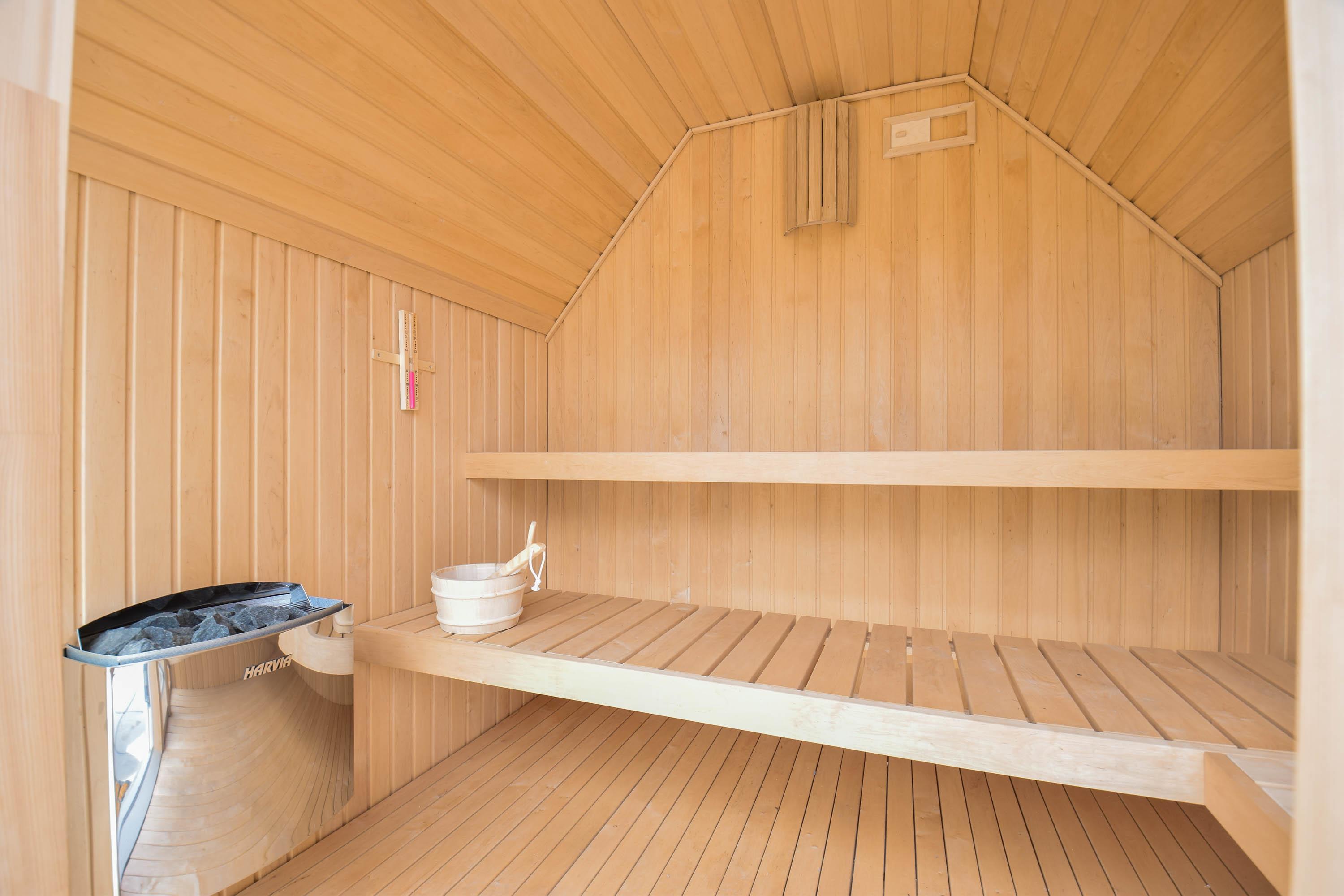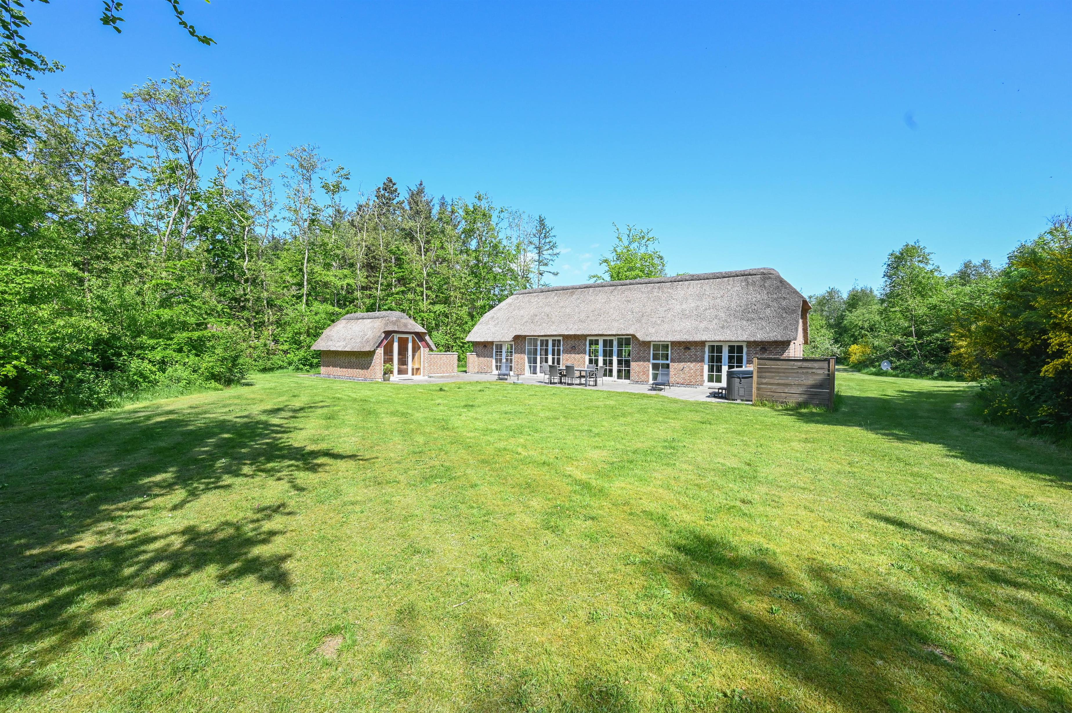 Fra terrassen har du naturen helt tæt på, og i udespaen eller den udendørs sauna kan du slappe af, mens du nyder den stille stemning og de grønne omgivelser.