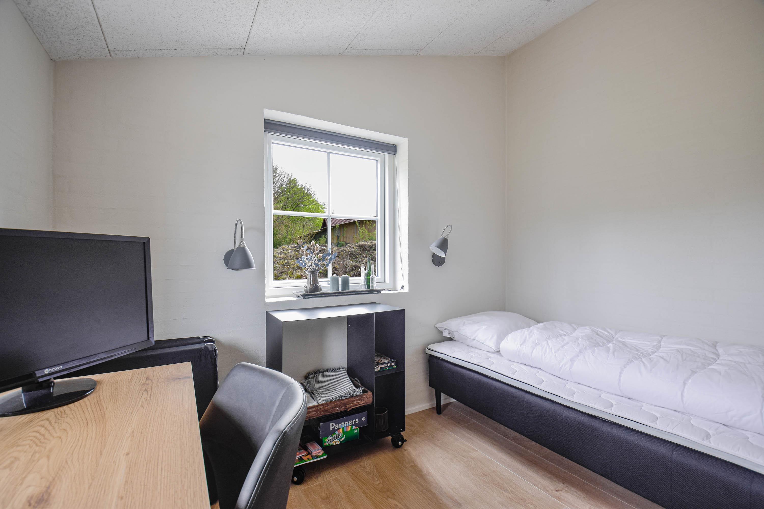 I husets østlige del finder du en stor entré med adgang til et badeværelse, et enkeltværelse med skrivebord (perfekt som lille arbejdsplads) og et værelse med dobbeltseng.