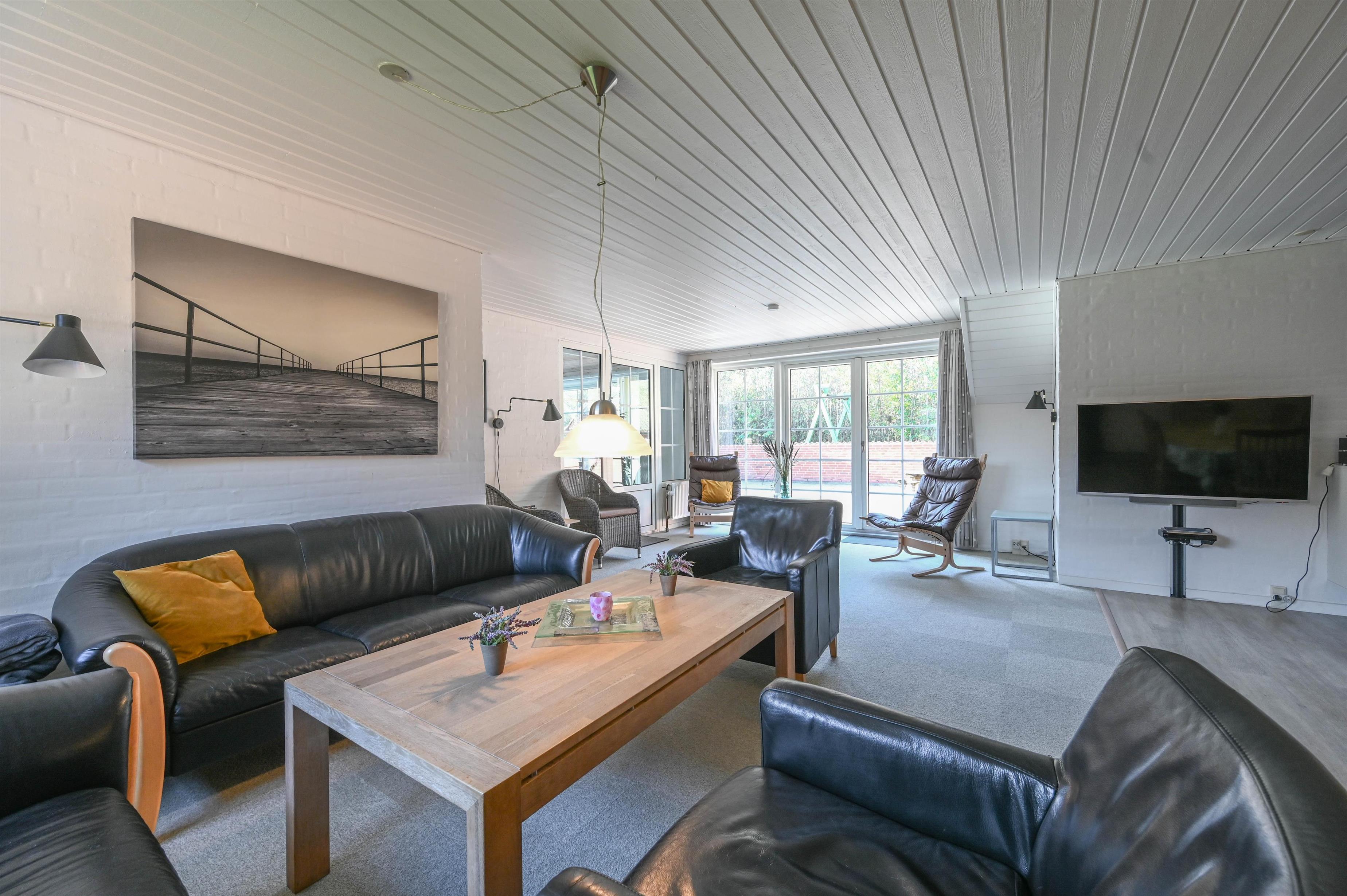 Køkkenet er veludstyret og ligger i åben forbindelse med stuen, som er indrettet med lædermøbler, stort spisebord og brændeovn – perfekt til hyggelige fællesmiddage og lange aftener.