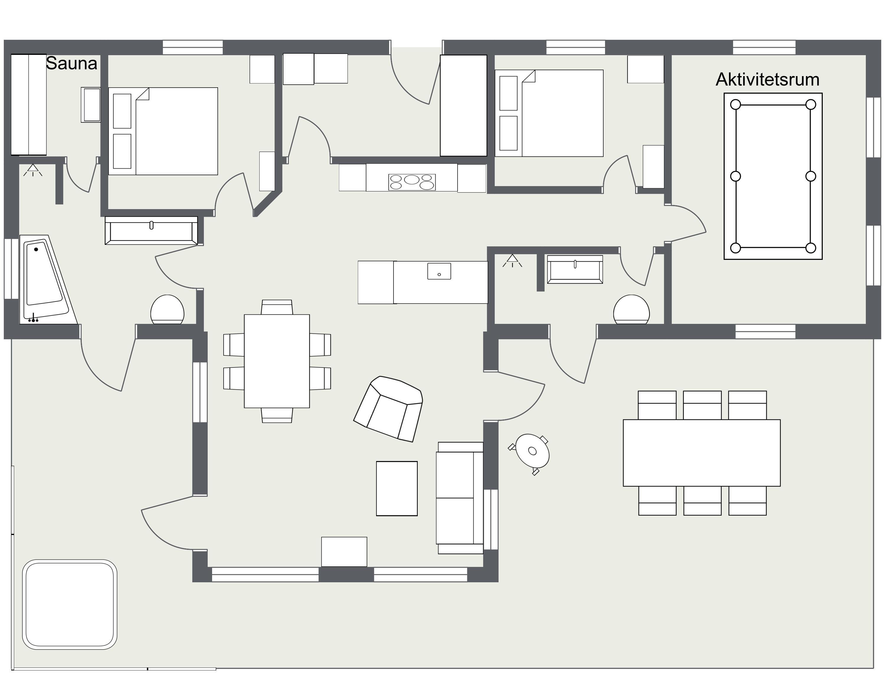 Fra det store alrum har I direkte udgang til stor terrasse. Her er der masser af muligheder for at nyde solen i fulde drag og slappe af med en god bog eller tage en tur i den skønne udespa, som egner sig til både sommer og vinter.