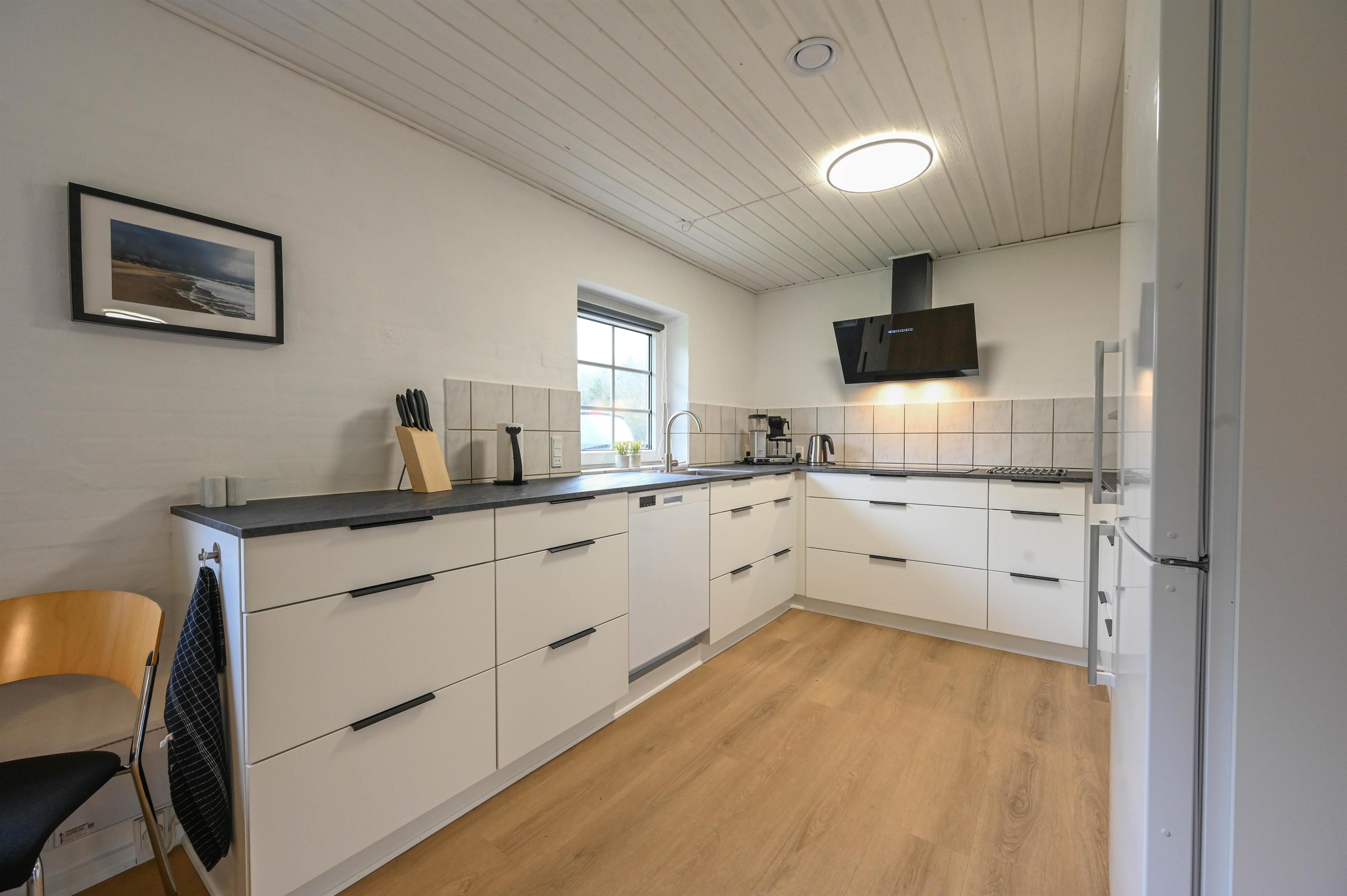 Det åbne køkken ligger i forlængelse af den lyse spisestue, som igen hænger sammen med den hyggelige opholdsstue.