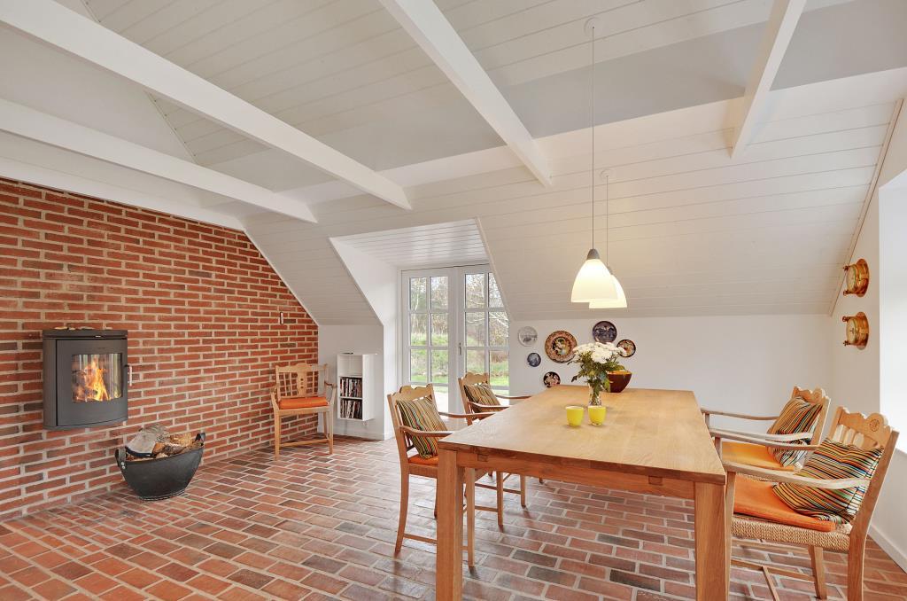 Lys stue med brændeovn, spisebord, sofagruppe og stort vinduesparti mod vest