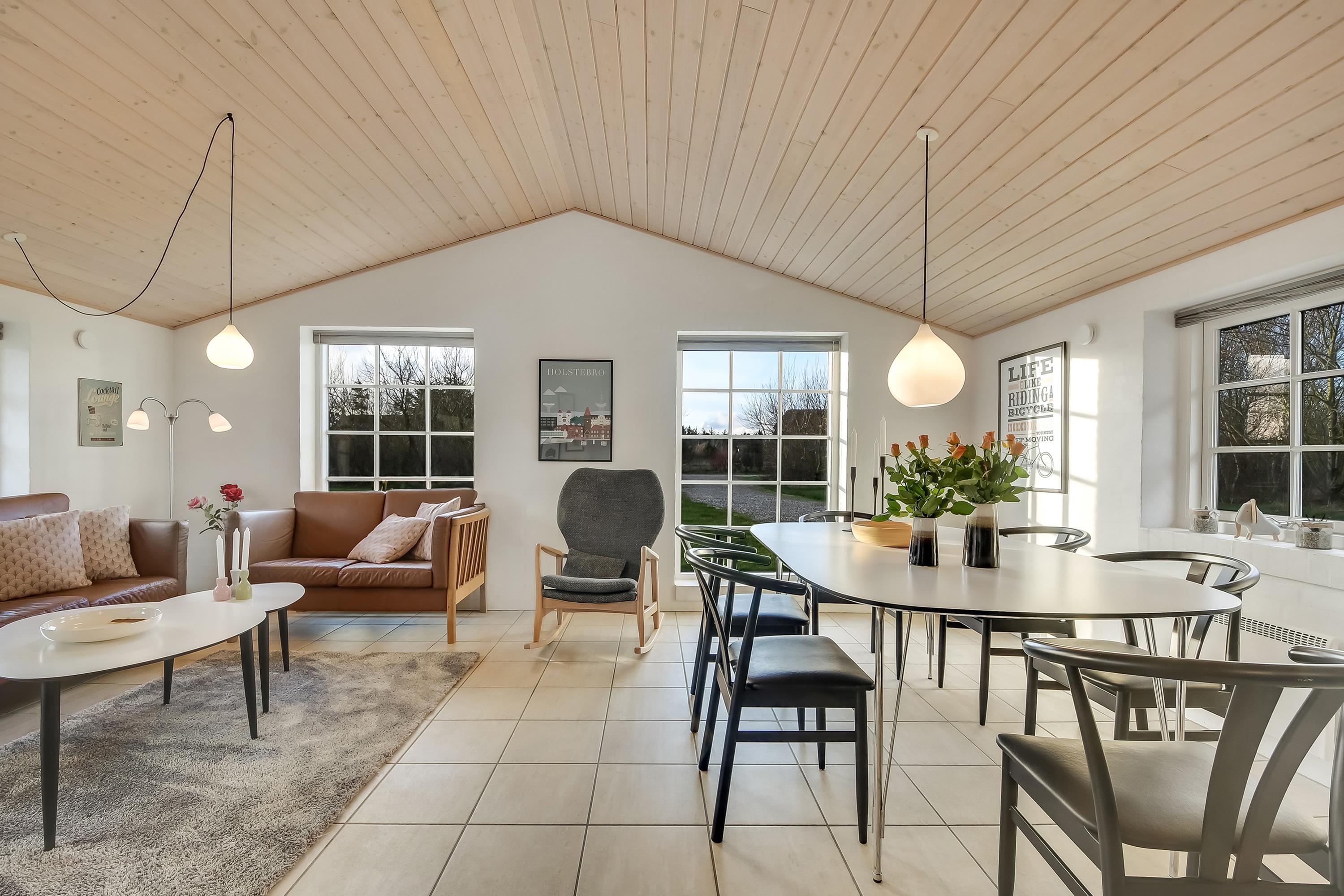 Feriehuset fremstår lyst, rummeligt og indbydende, med pæne møbler og en afslappet atmosfære.