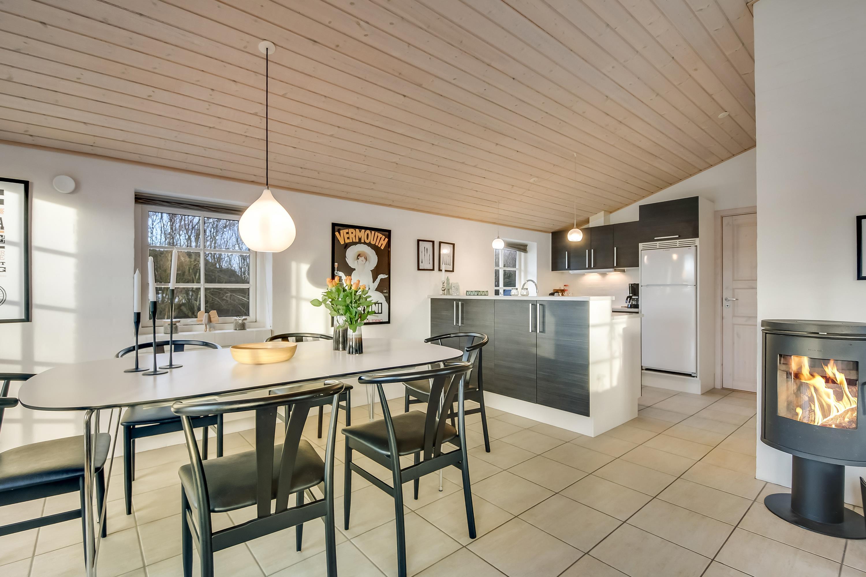 Det åbne køkken og stueområdet er husets naturlige samlingspunkt – her kan man lave mad, spille spil eller nyde en rolig aften foran brændeovnen, mens flammerne knitrer i baggrunden.