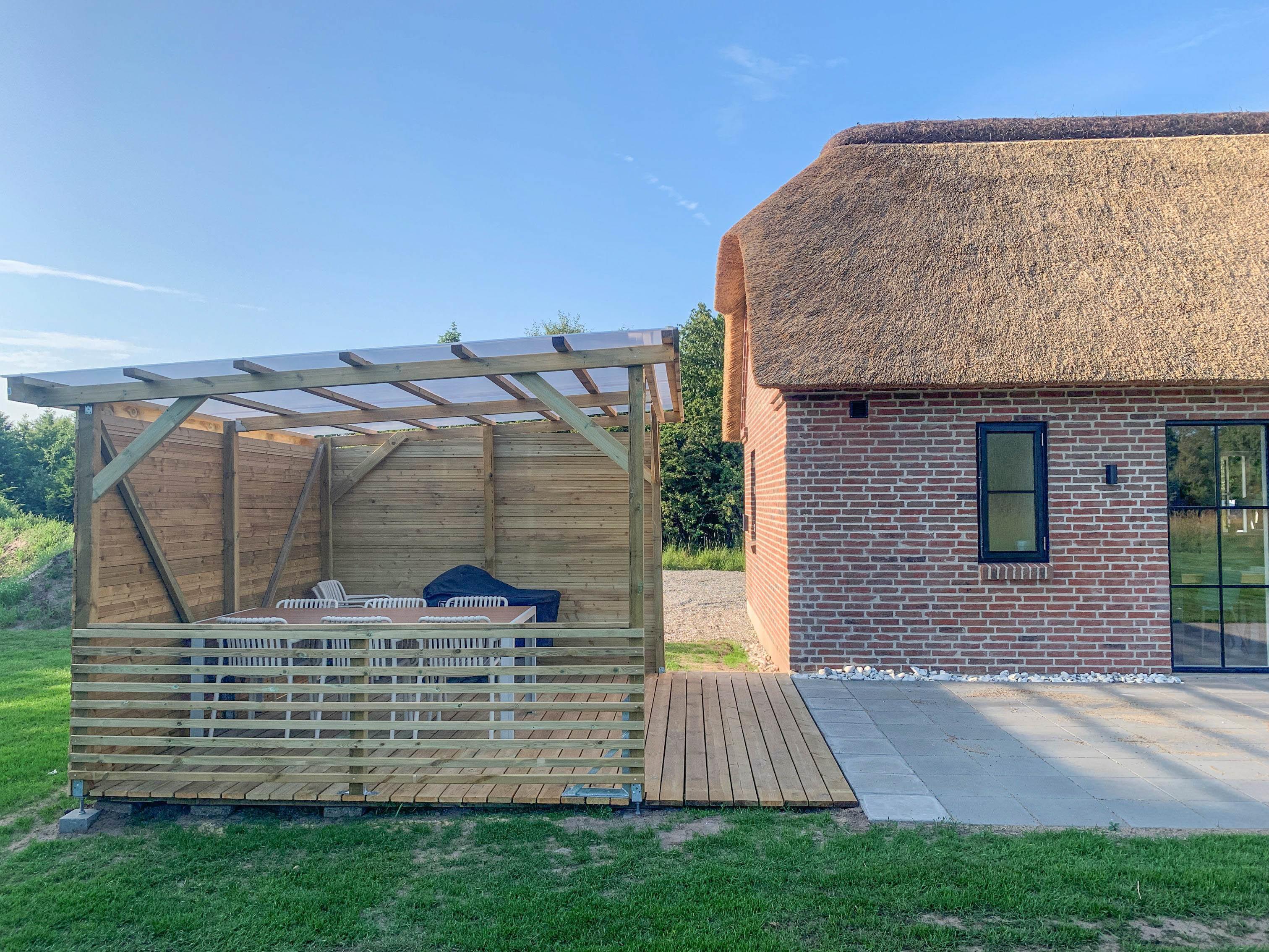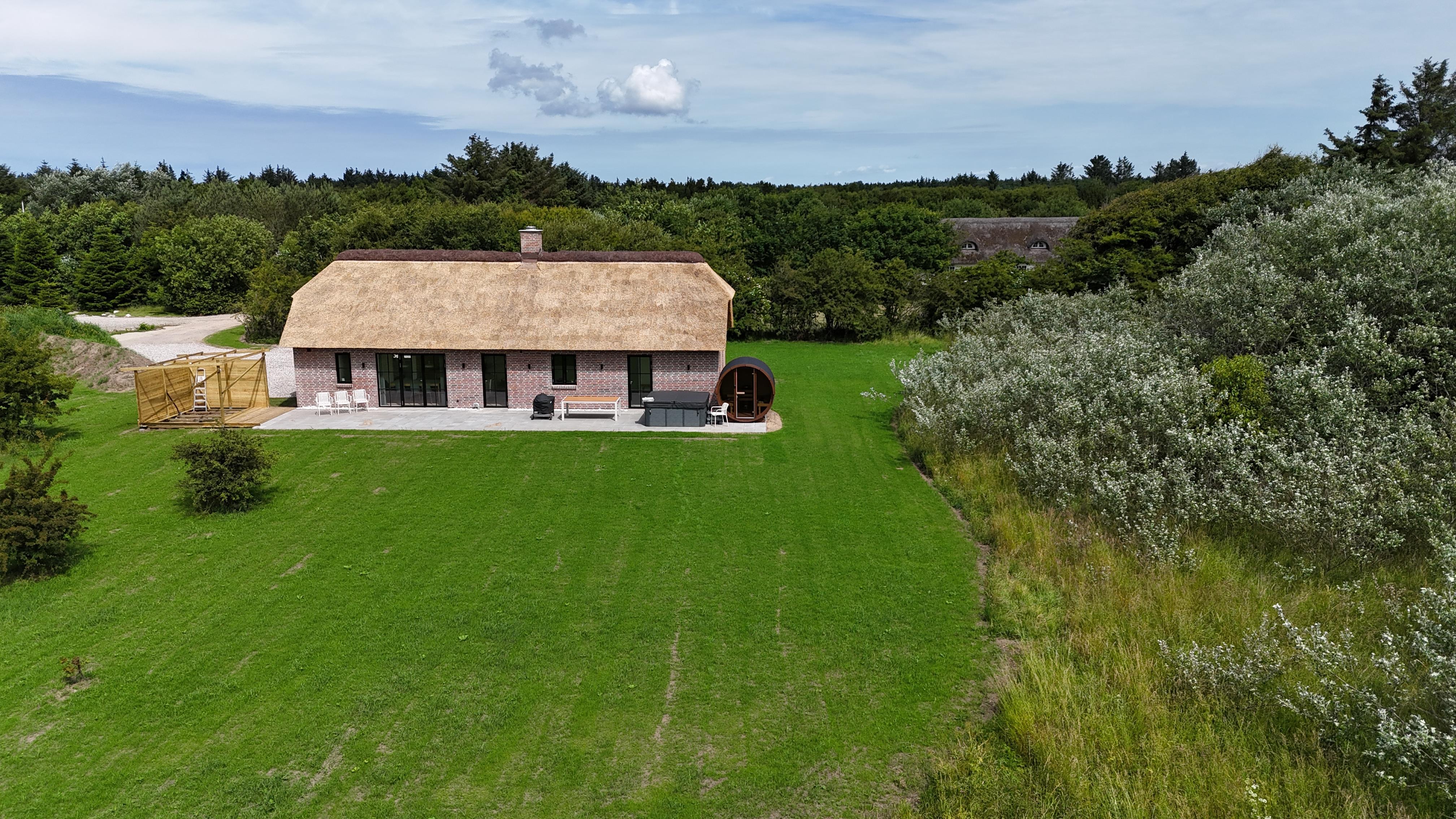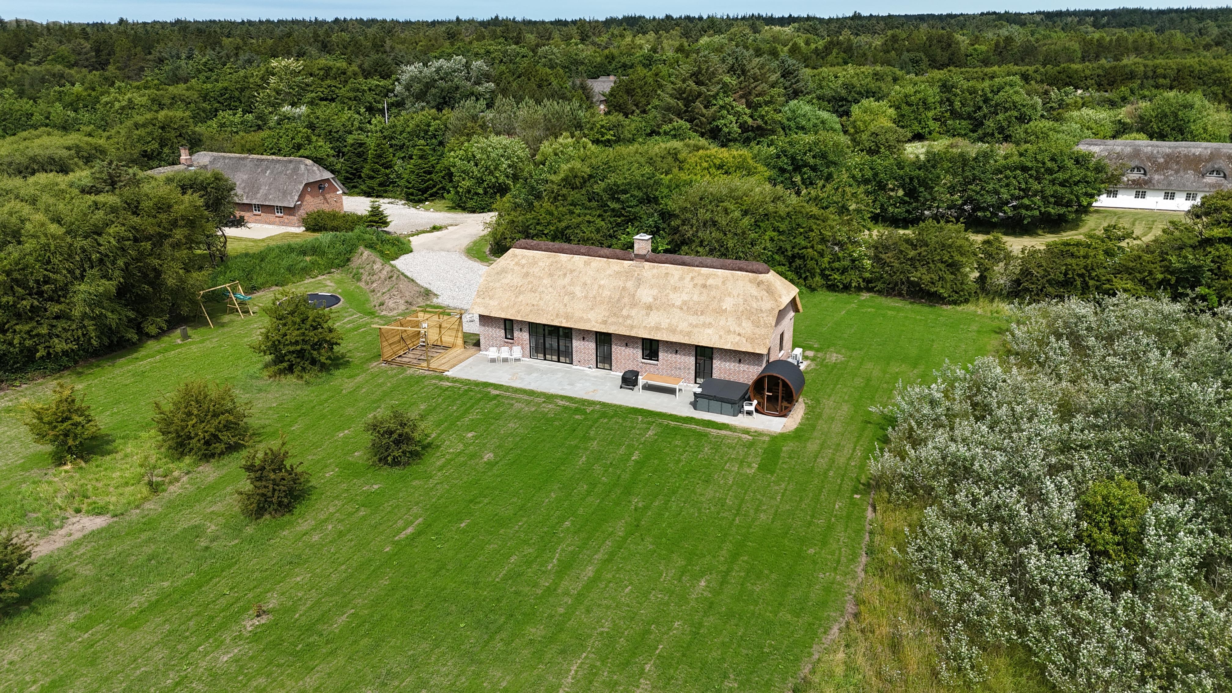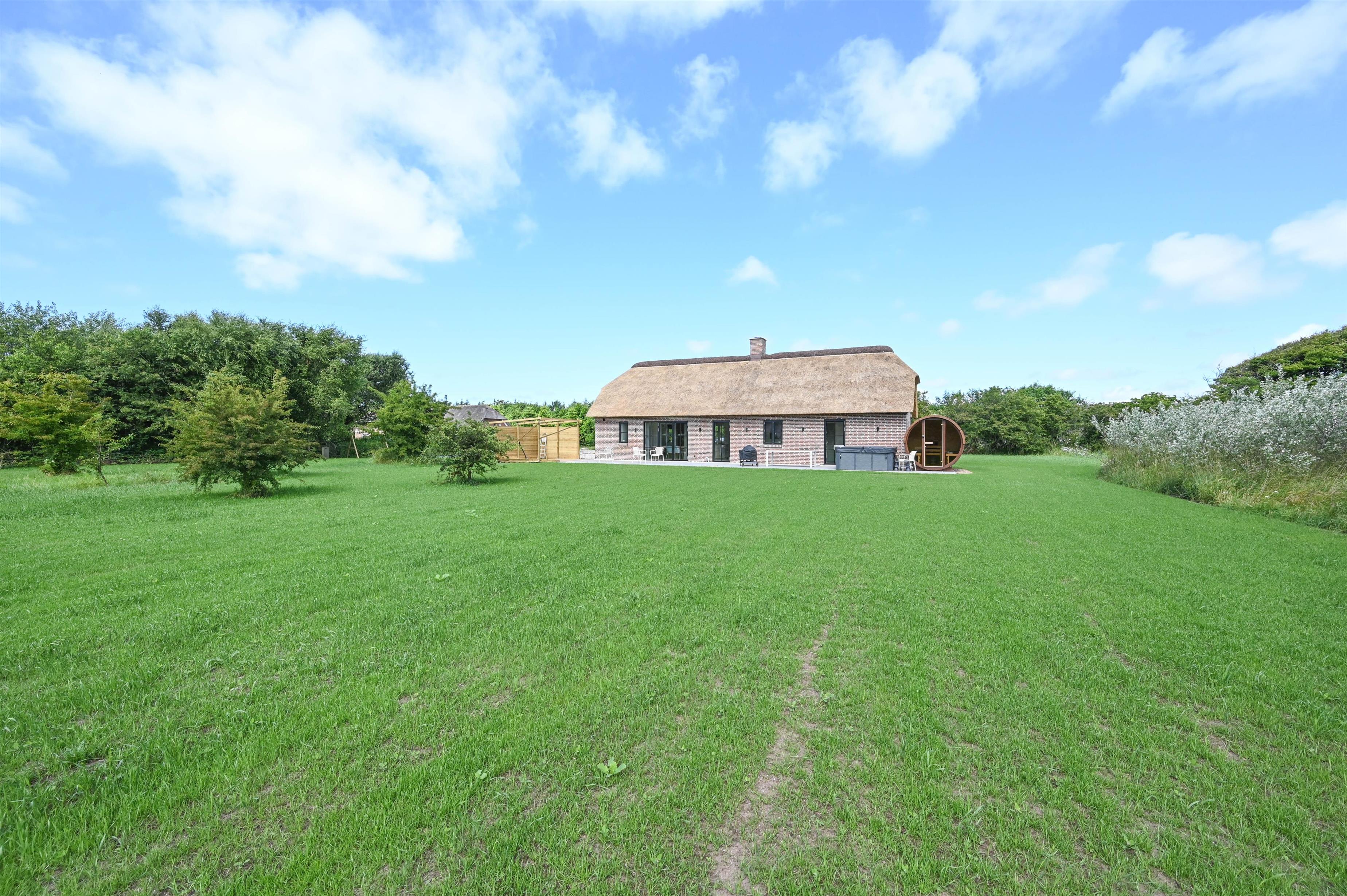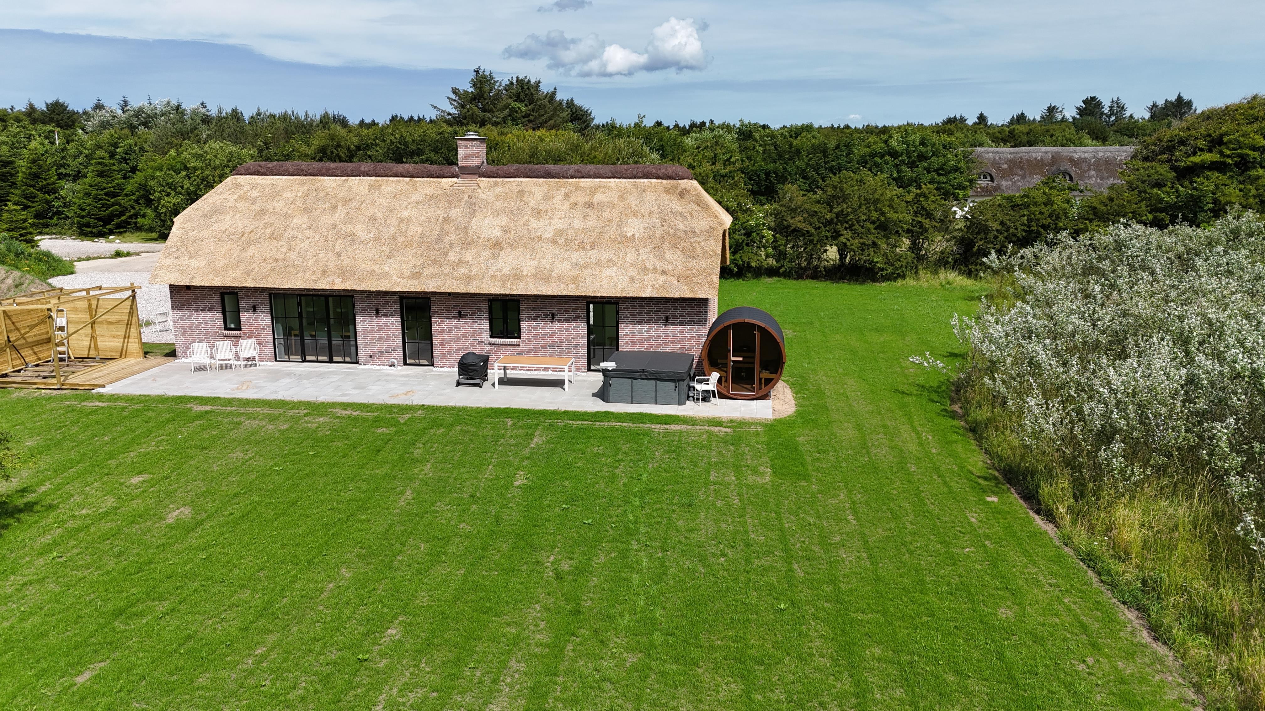 Et nyt, eksklusivt feriehus i klassisk stil med stråtag, brændeovn, udendørs spa og sauna – og med havet kun en kort gåtur væk.
