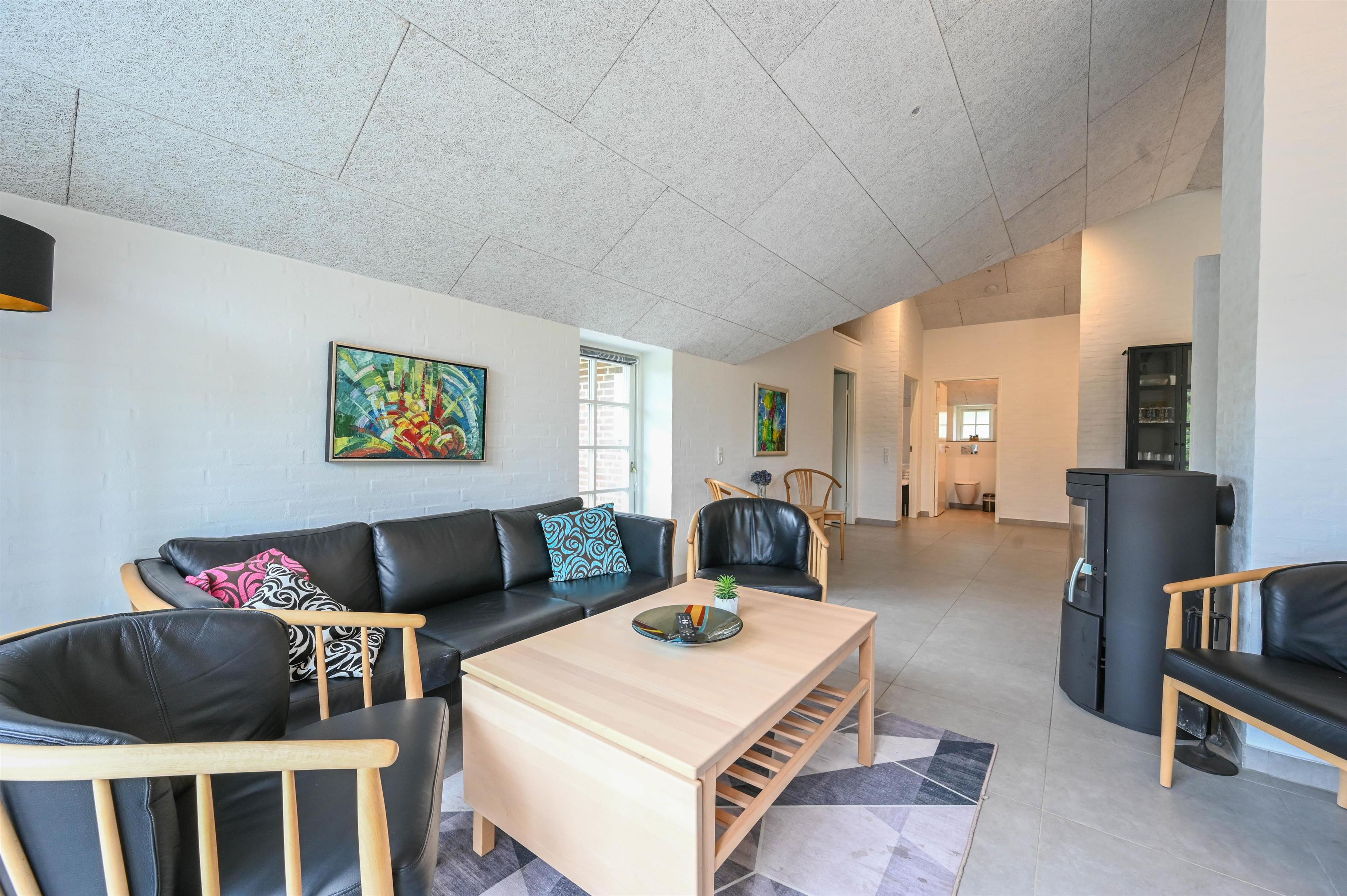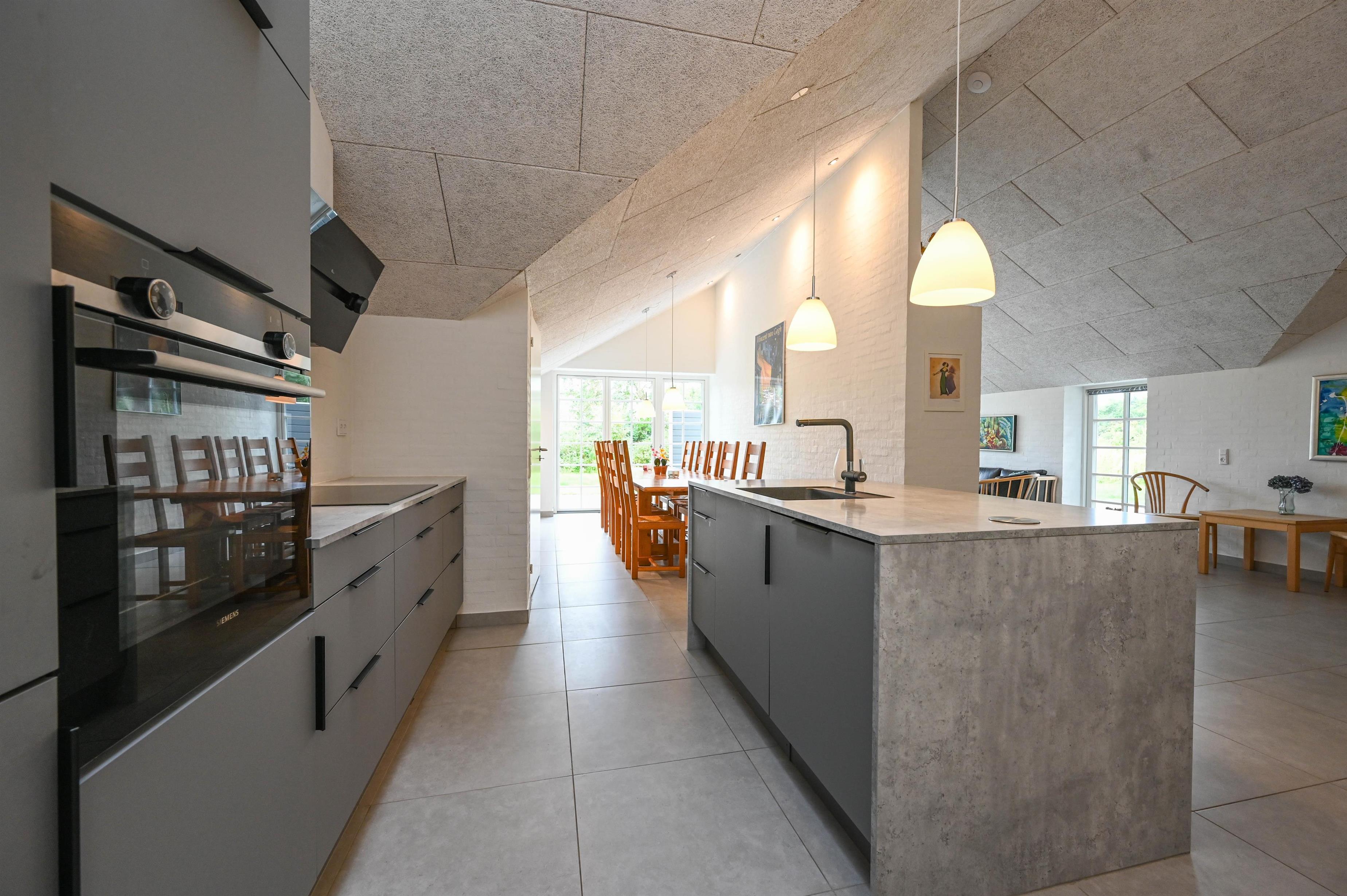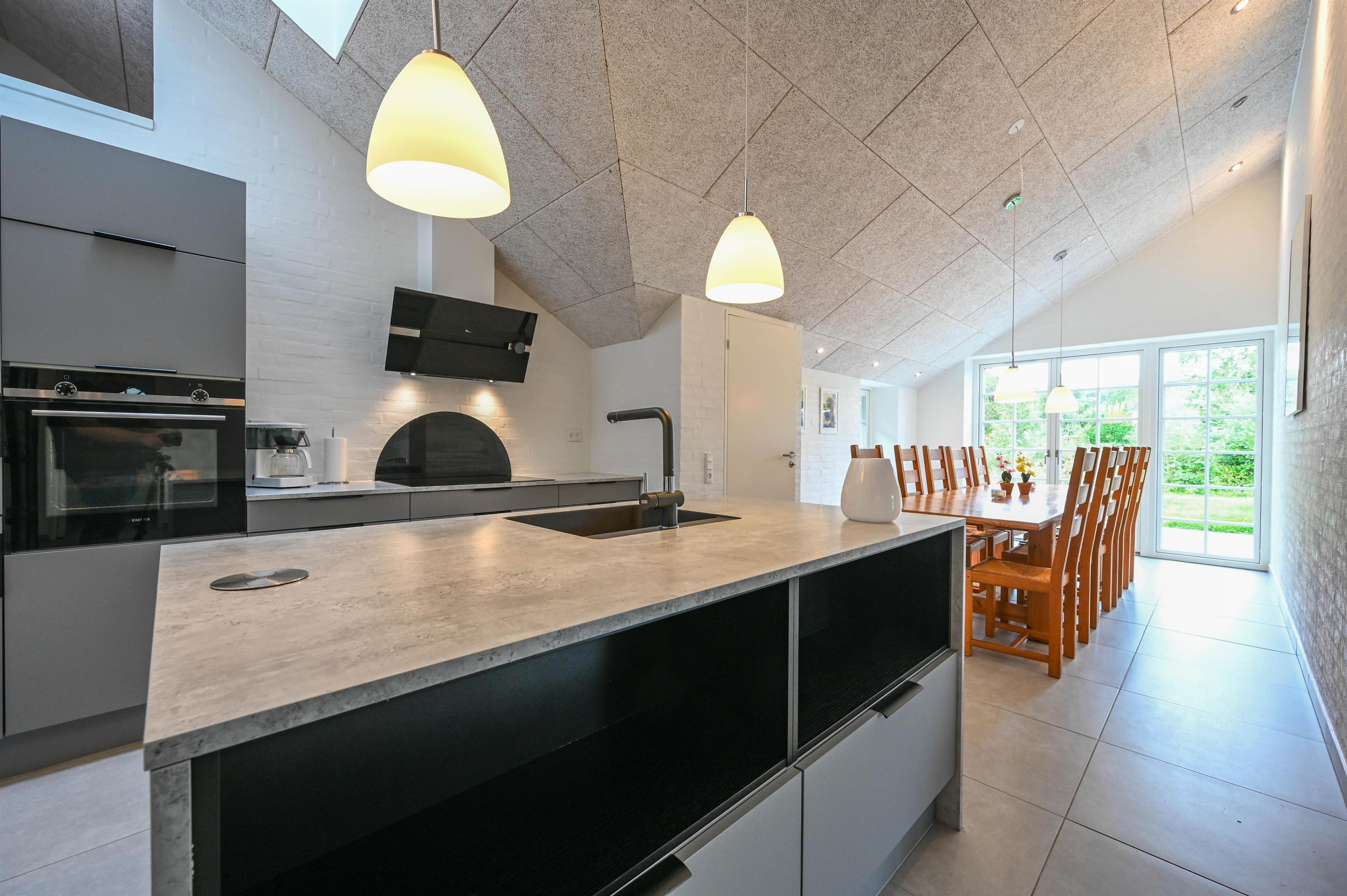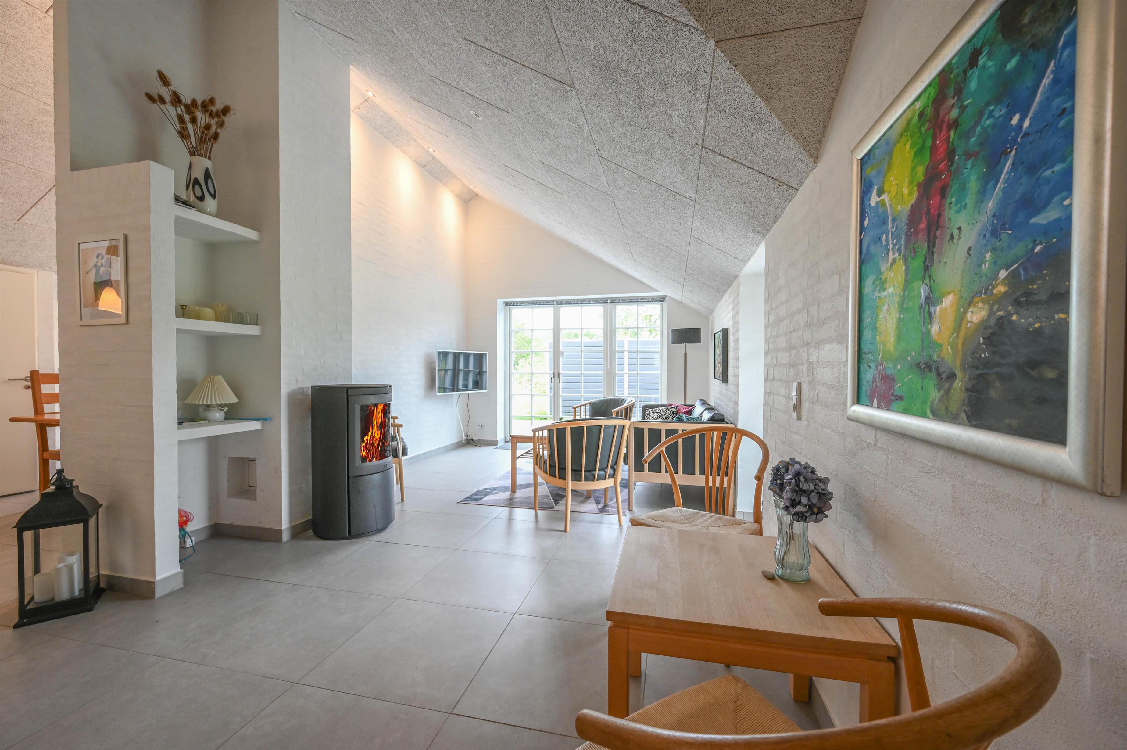 Det store køkken/alrum ligger i åben forbindelse med den hyggelige stue med TV og brændeovn – her samles man naturligt til fælles måltider, spil og afslapning efter en dag ved havet.