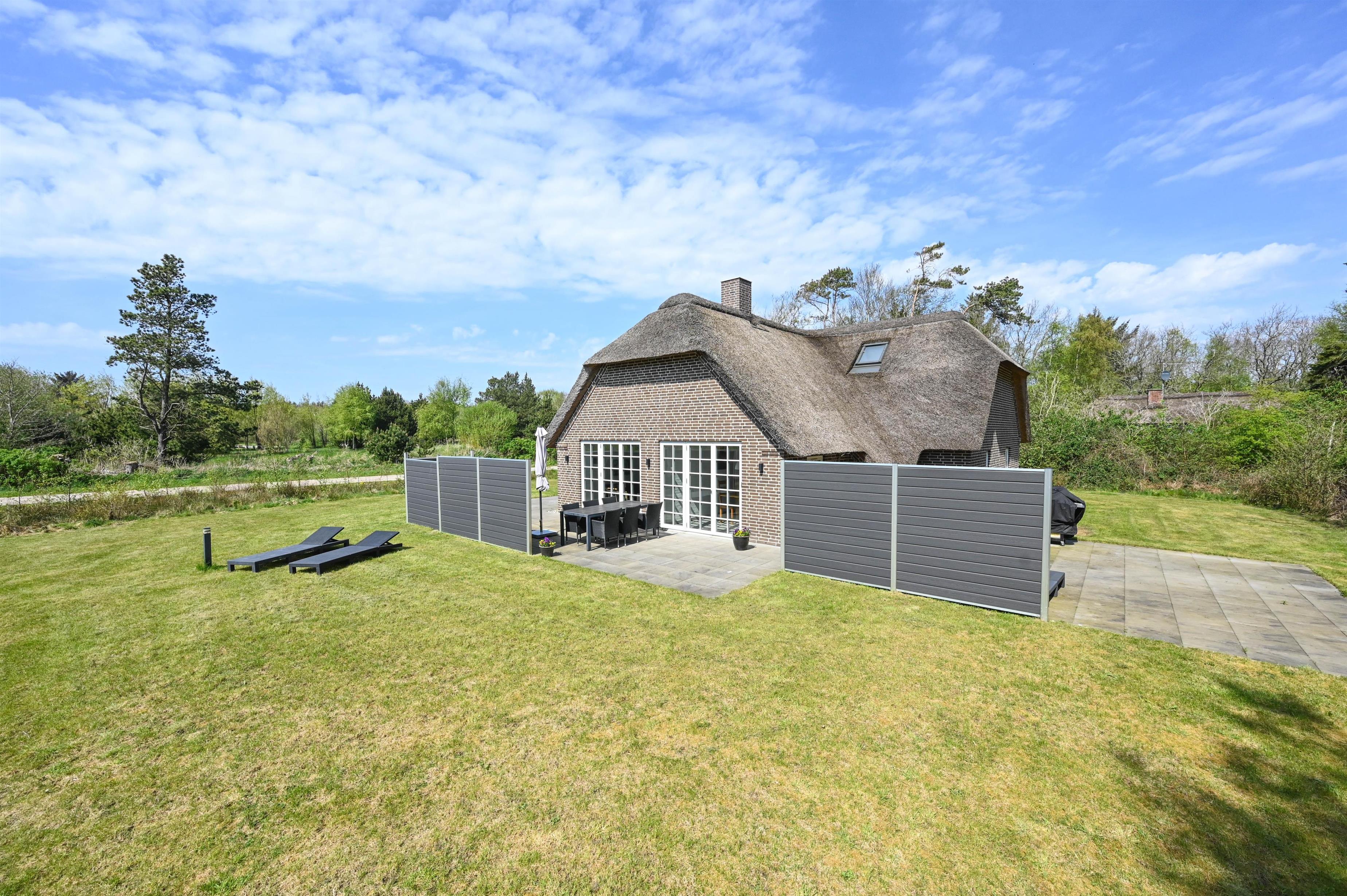 Dette charmerende feriehus fra 2021, opført i mursten med stråtag, ligger på en hyggelig, delvist afskærmet naturgrund omgivet af træer og grønne omgivelser.