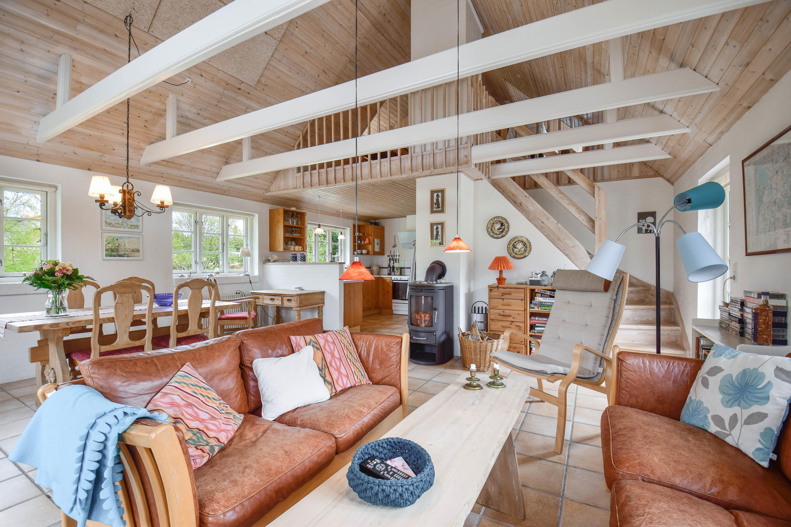 Indenfor mødes I af en varm og hjemlig stemning, hvor lyset, træet og indretningen tilsammen skaber ægte sommerhuscharme.