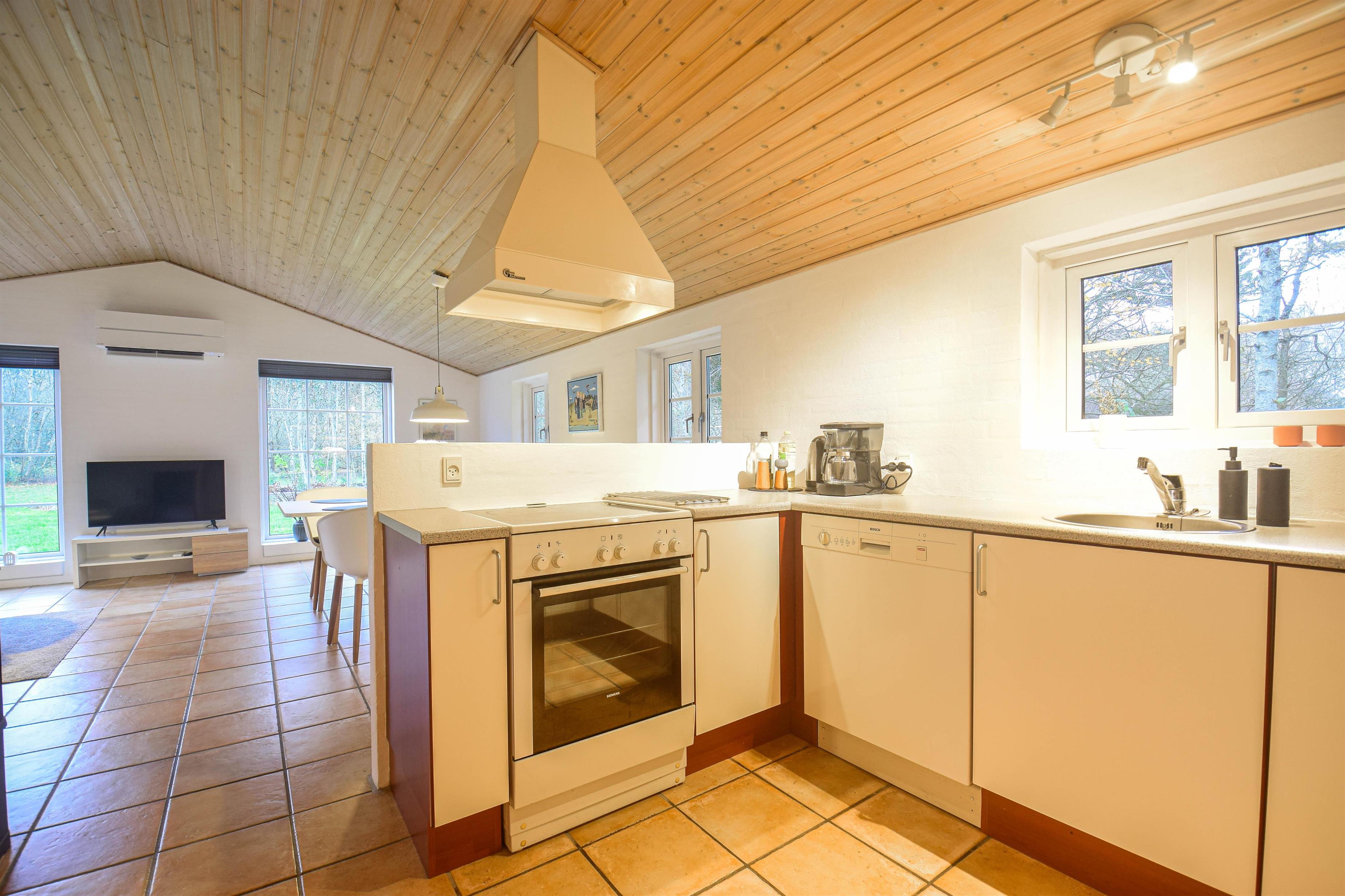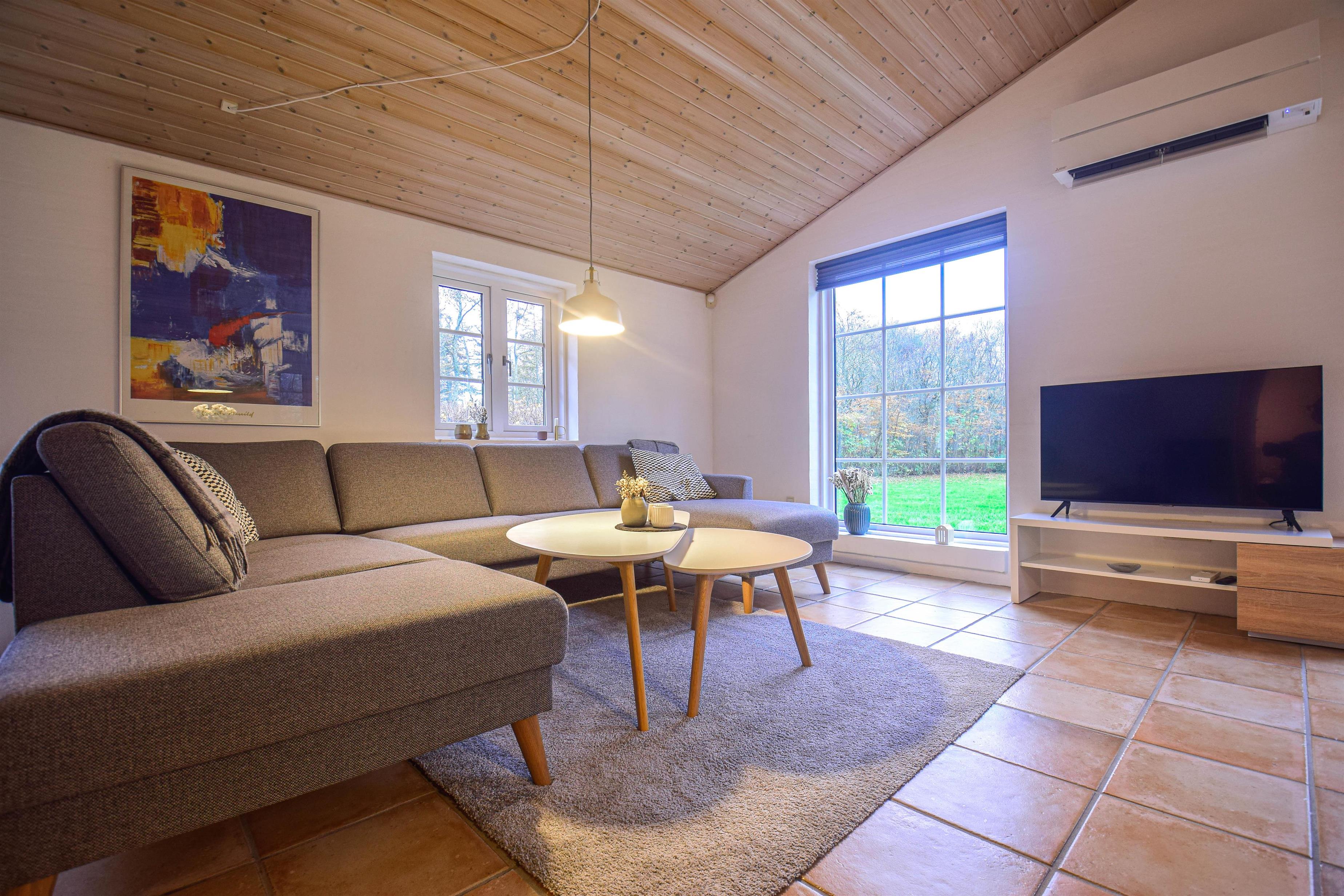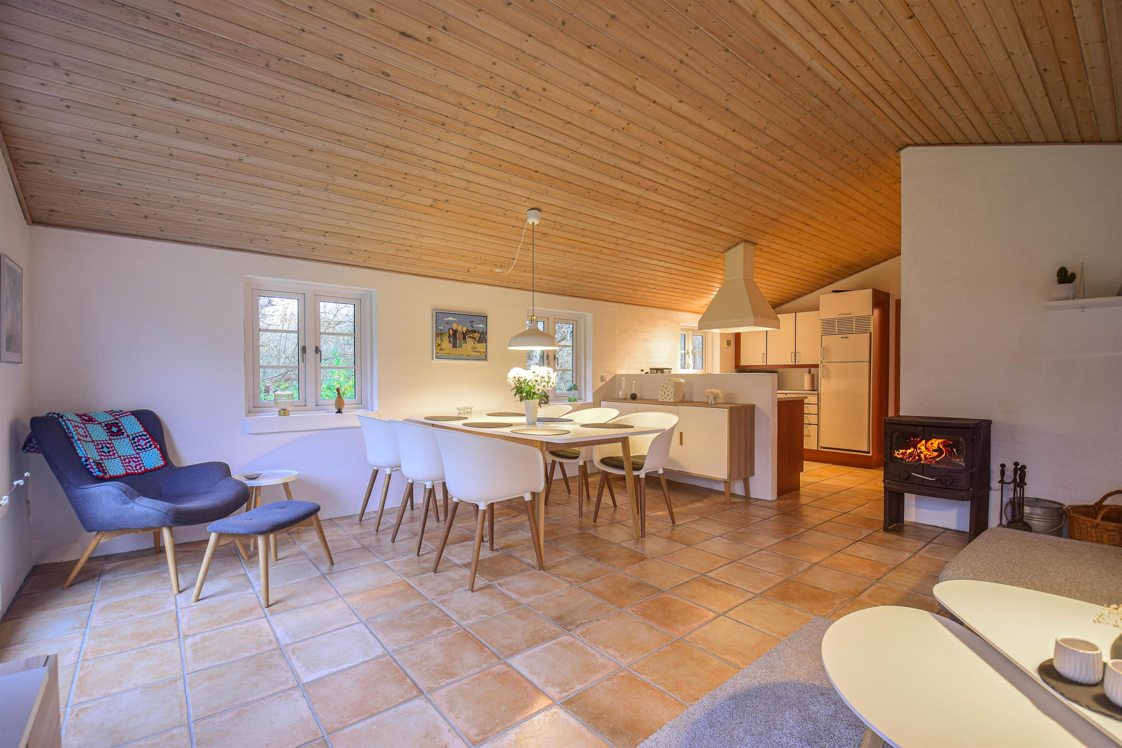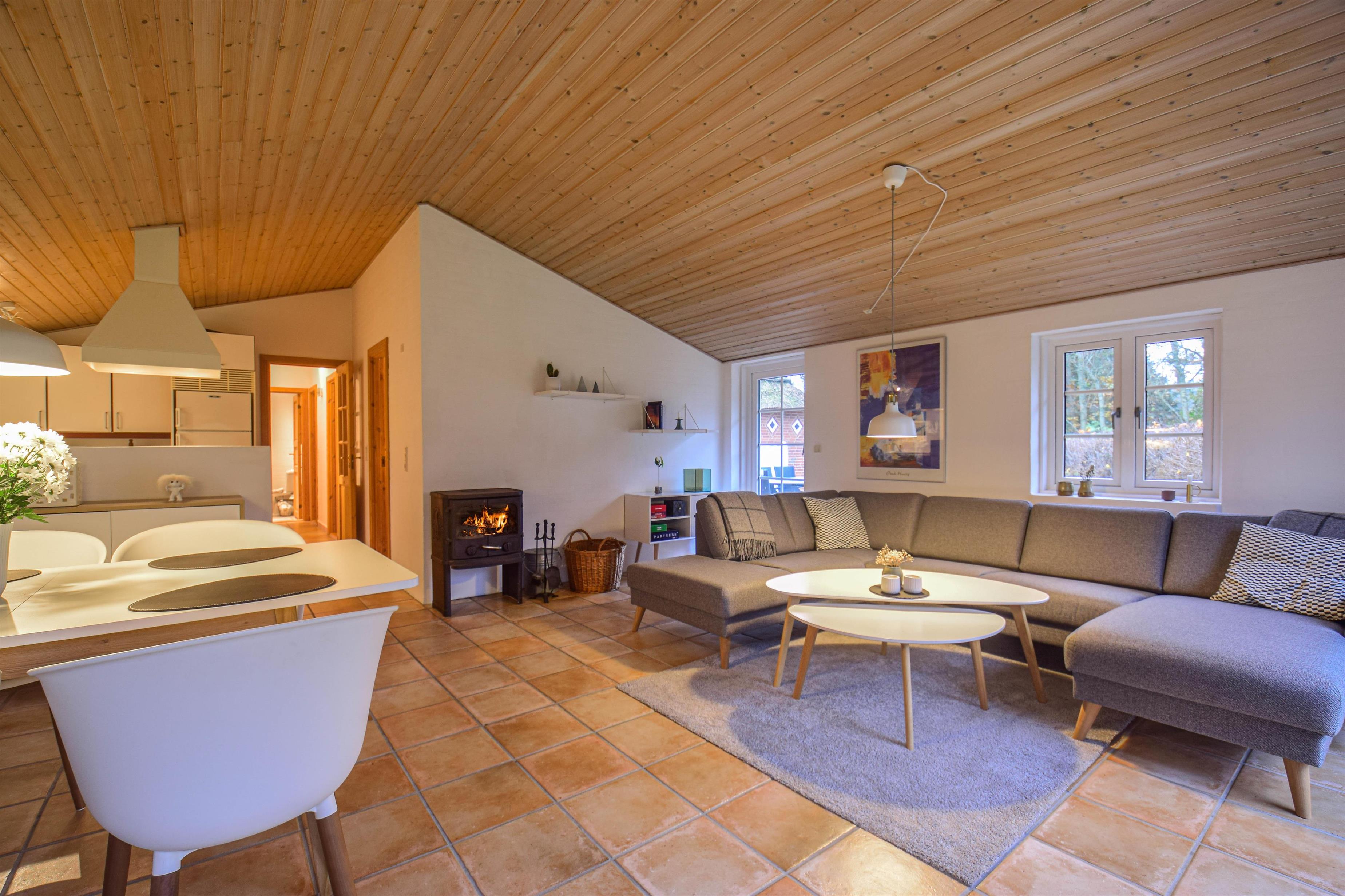 I den lyse stue, der ligger i åben forbindelse med køkkenet, finder du både fladskærms-TV, brændeovn og en behagelig spiseplads – her er det let at hygge sig sammen efter en dag ved stranden.