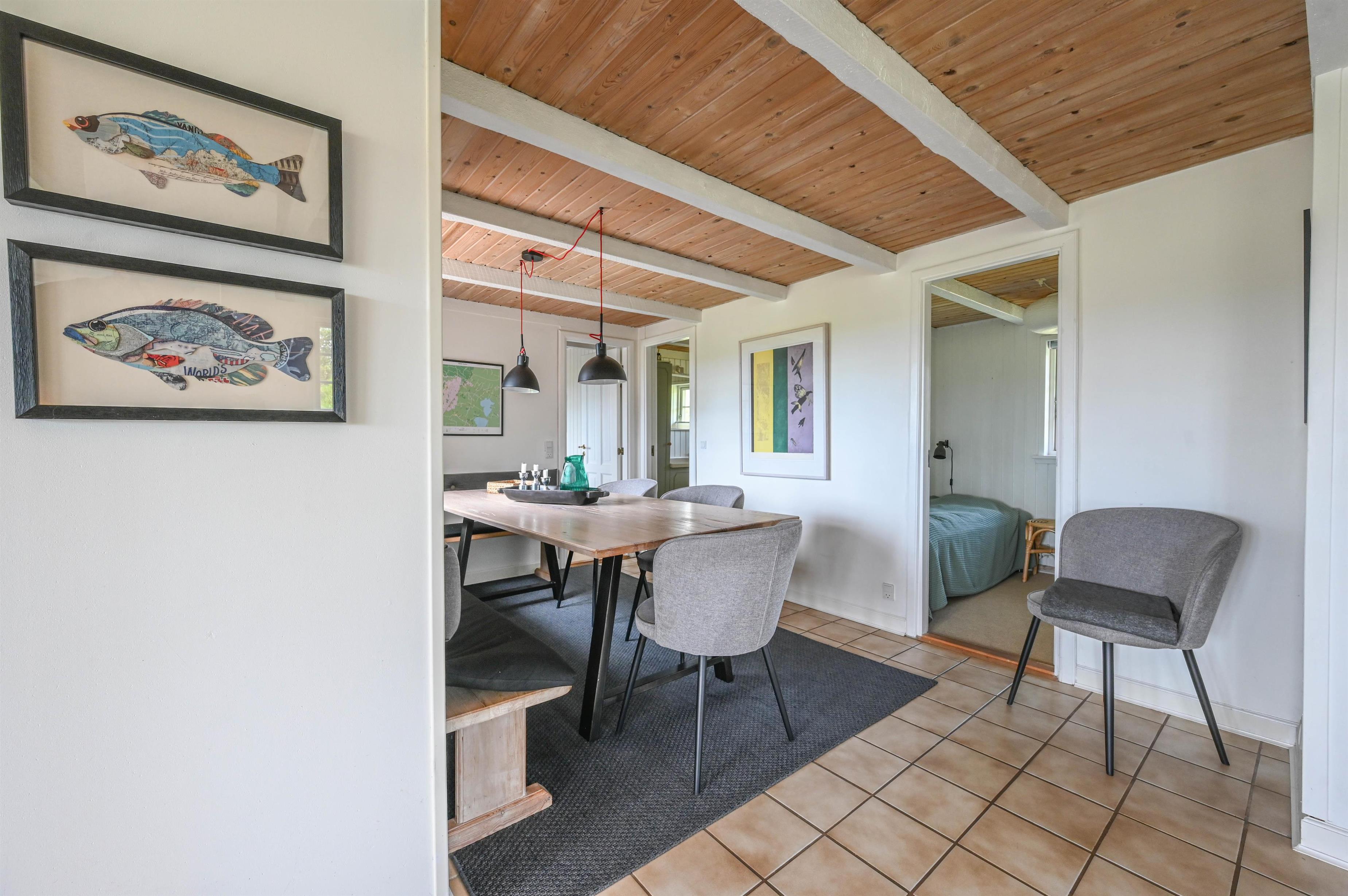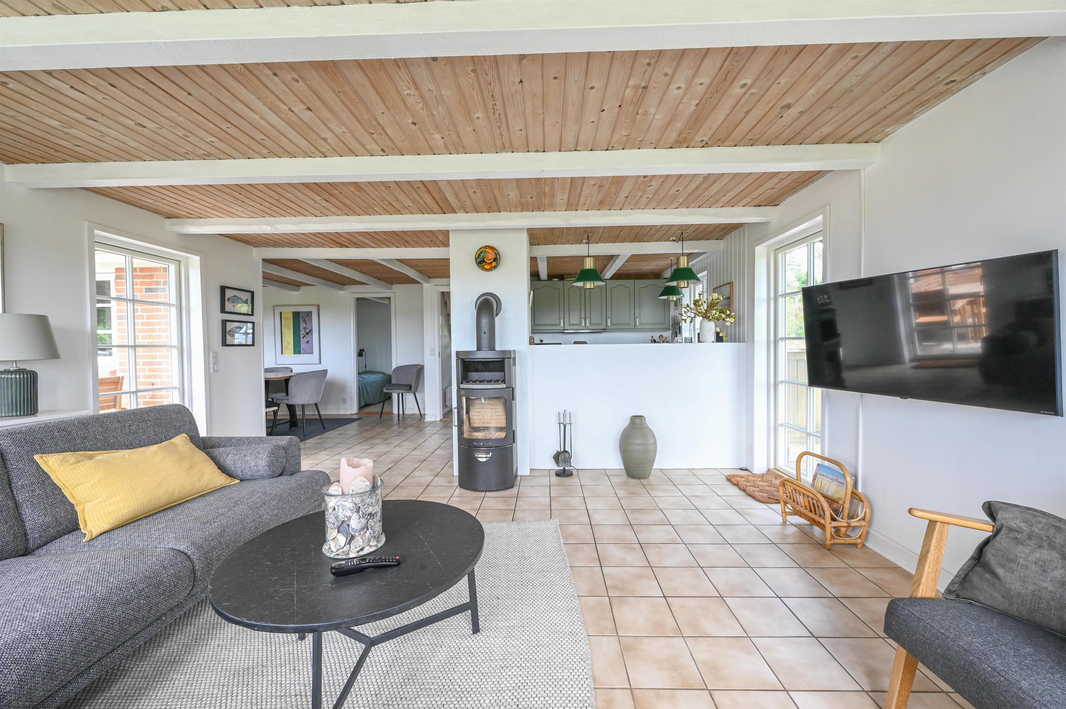 Den store stue med spiseplads, sofagruppe og brændeovn er husets naturlige samlingspunkt, hvor I kan nyde udsigten, hygge jer med spil eller lade varmen fra flammerne i brændeovnene sprede sig på kølige dage.