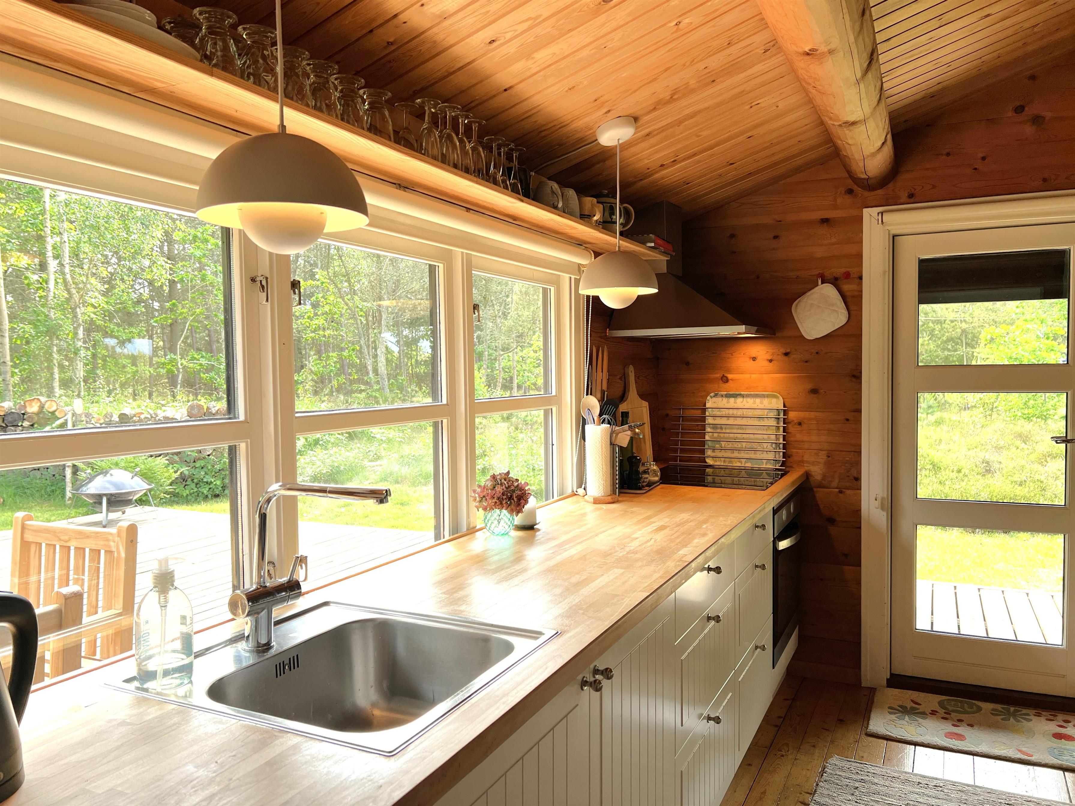 Huset har et dejligt stort køkken med spisekrog, gode møbler og brændeovn. Hyggelig stue med behagelige møbler og TV. Tre soverum, hvoraf det ene er i annekset: To med dobbeltseng, et med køjeseng og et med to enkeltsenge. Fint badeværelse med brus. Flot havkig fra huset og den store terrasse rundt huset, der forbinder det dejlige anneks med selve huset.