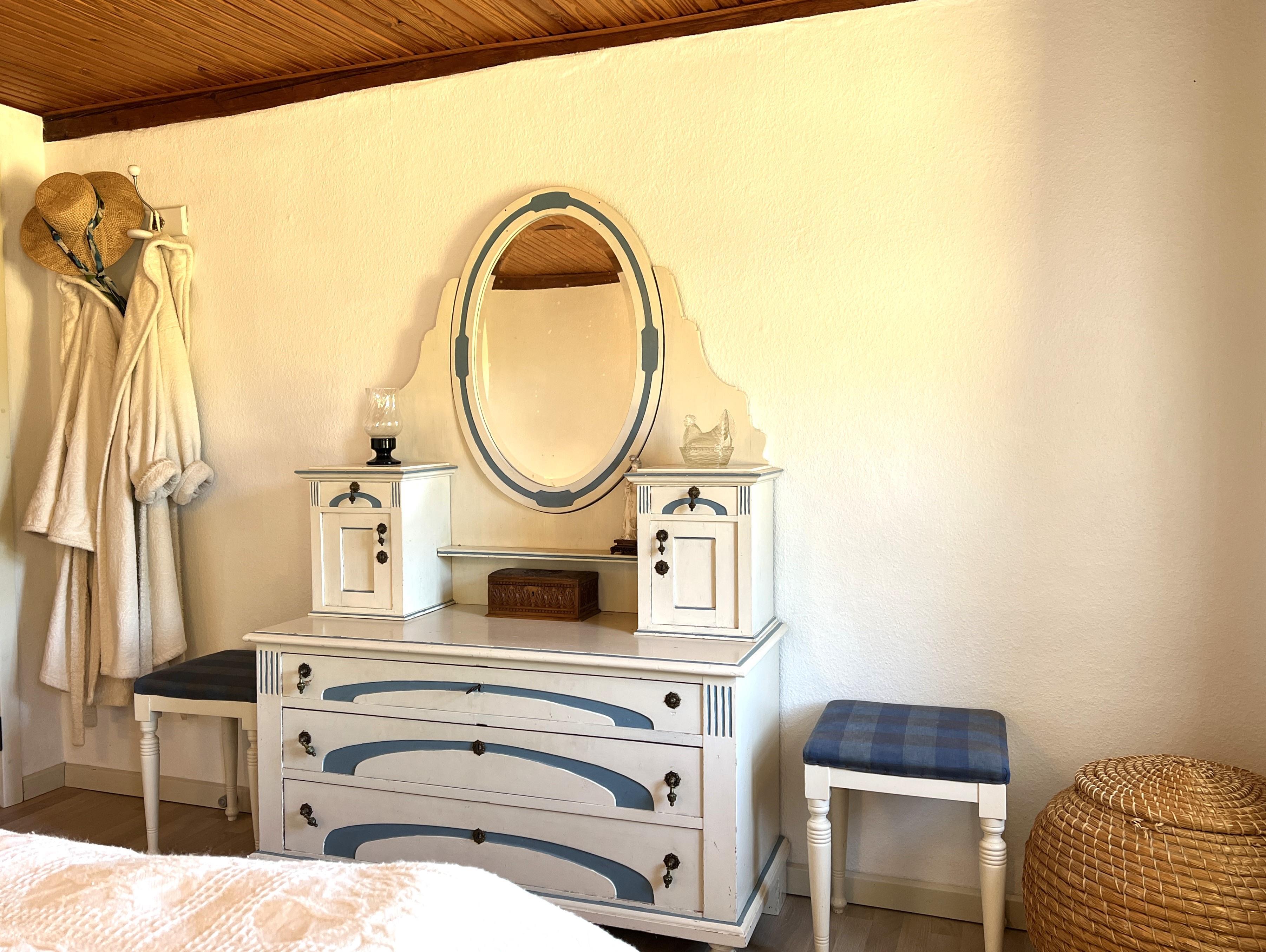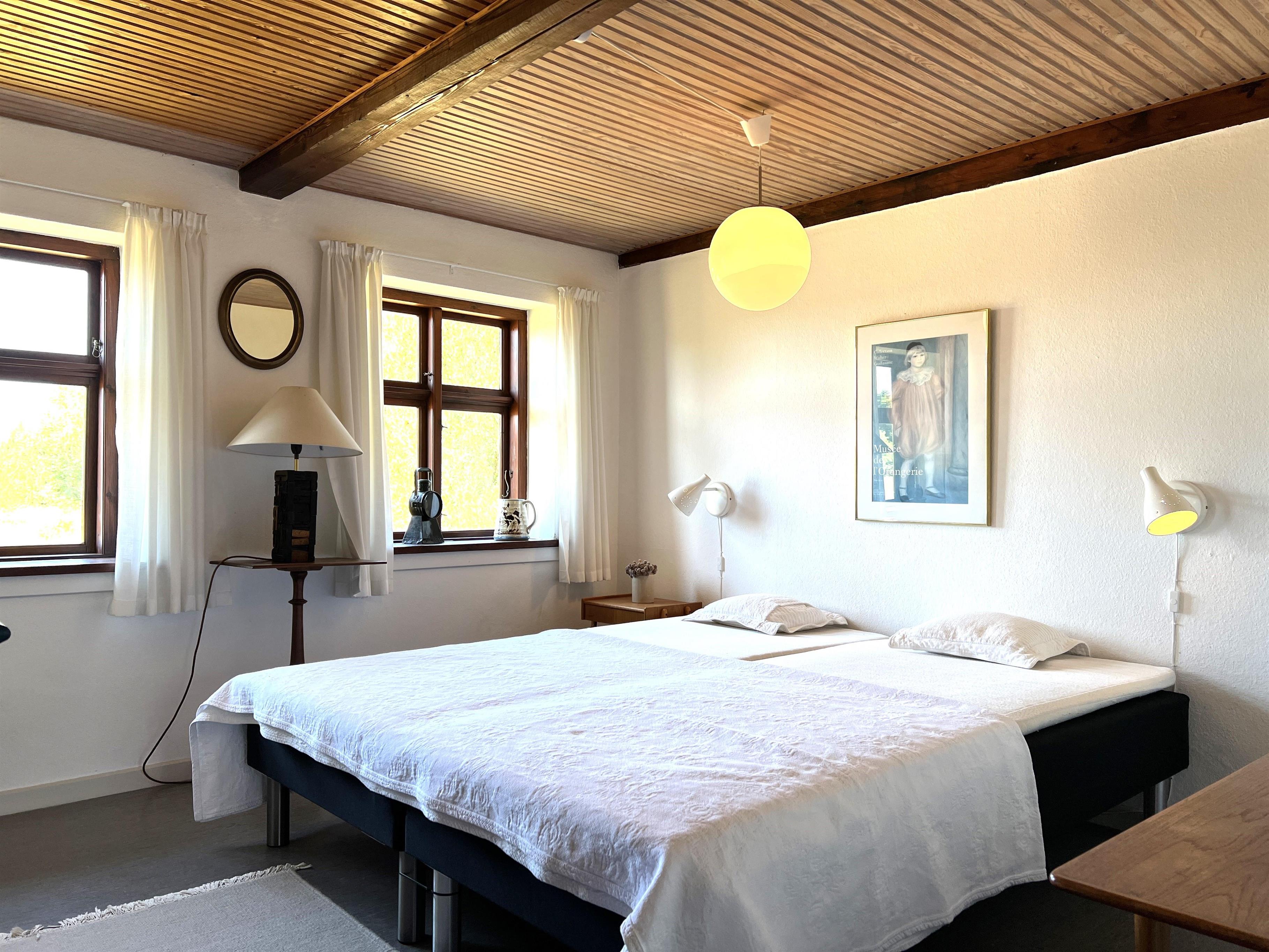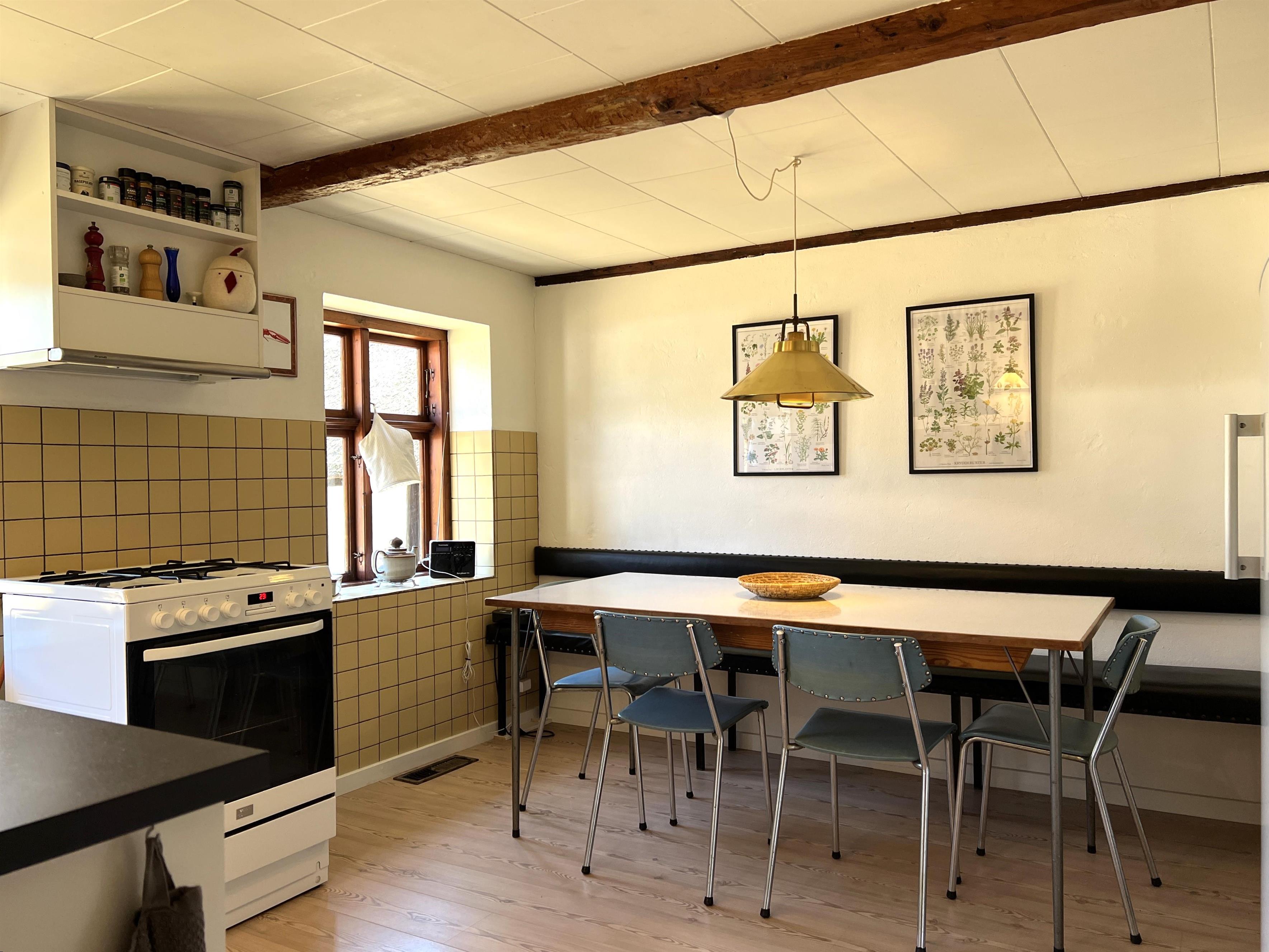 Denne smukke, gamle Læsøgård er en af Læsøs ældste, og her er mulighed for en unik ferieoplevelse til den store familie, der gerne vil bo i et fredeligt, naturskønt område. Gården ligger højt placeret på den store grund, og det giver en fantastisk smuk udsigt ud over de store lysåbne arealer, hvor man kan nyde solnedgangen over Kattegat. Den snoede gamle markvej går ned til Søndre Kirke og Kongestranden, øens nok bedste badestrand. Gården, "Rimmen" er nænsomt renoveret med respekt for stil og stemning, og man vil fx møde autentiske loftsbjælker fra skibene fra de mange strandinger rundt Læsø. Fliserne på badeværelserne, som var med, da gården blev overtaget i 1965 er intakte. Her på gården er man kun ledsaget af den særlige Læsø-ro og den smukke udsigt til søen, markerne og naturen. Det store hovedhus har fire soveværelser, hvoraf tre er med nye dobbeltsenge og et med to enkeltsenge. Ekstra, femte soveværelse med to enkeltsenge, så den store familie kan brede sig. Charmerende køkken med "det gamle" spisebord og en imponerende stor stue med spisebord og flere hyggeafdelinger med sofaer, lænestole og TV. I forlængelse af værelsesfløjen er der udgang til udebruser, hvor man kan nyde udsigten over den store have. Der er et fint rum med vaskemaskine, tørretumbler, ekstra køleskab og fryser. Der er mange gode sol/hyggekroge med havemøbler, både med udsigt til søen og inde i den gamle hyggelige gårdsplads, i læ fra de tilstødende bindingsværkbygninger.