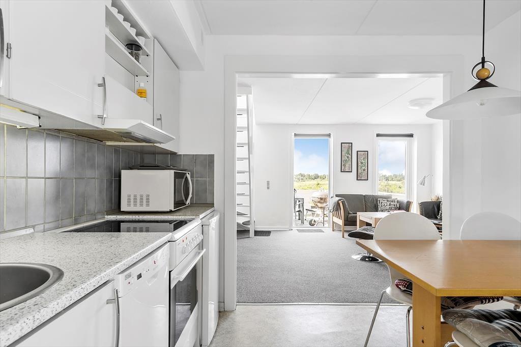 Inde bag den røde murstensfacade venter der jer en rar og indbydende feriebolig, der er indrettet i lyse farvetoner. Planløsningen breder sig over to plan, så et soveværelse er placeret i stueetagen og to på førstesalen. På overetagen er der også et rummeligt badeværelse med bruseniche, vaskemaskine og skråvindue, så I kan se ud på skyernes himmelflugt, når I står og børster tænder. Fra stuen har I en fin udsigt over golfbanen og de åbne vidder – ja, selv fra det åbne køkken kan I kigge gennem rummet og videre ud på alt det grønne.