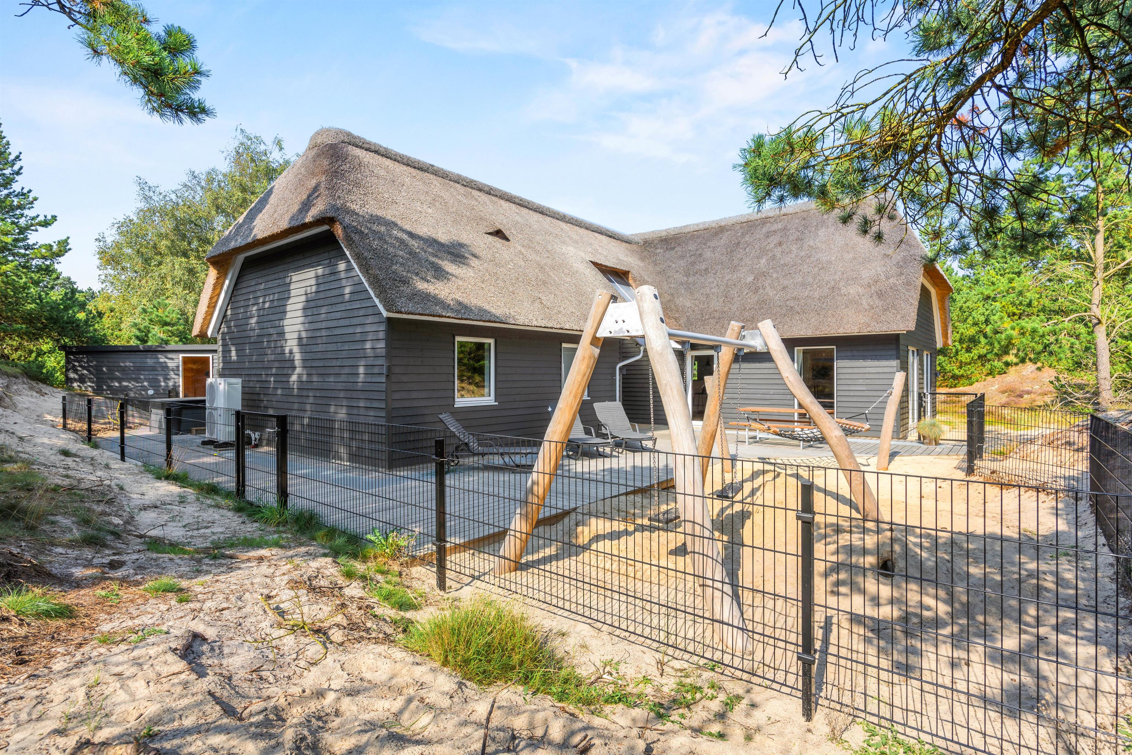 Der er luft og god plads på den smukke og rummelige naturgrund. De forskellige terrasseområder er udstyret med liggestole og havemøbler af høj kvalitet, og her kan du slappe af i den friske vesterhavsluft. Nyd en kop friskbrygget kaffe, imens dine børn brænder energi af i legetårnet med gynger og rutsjebaner.