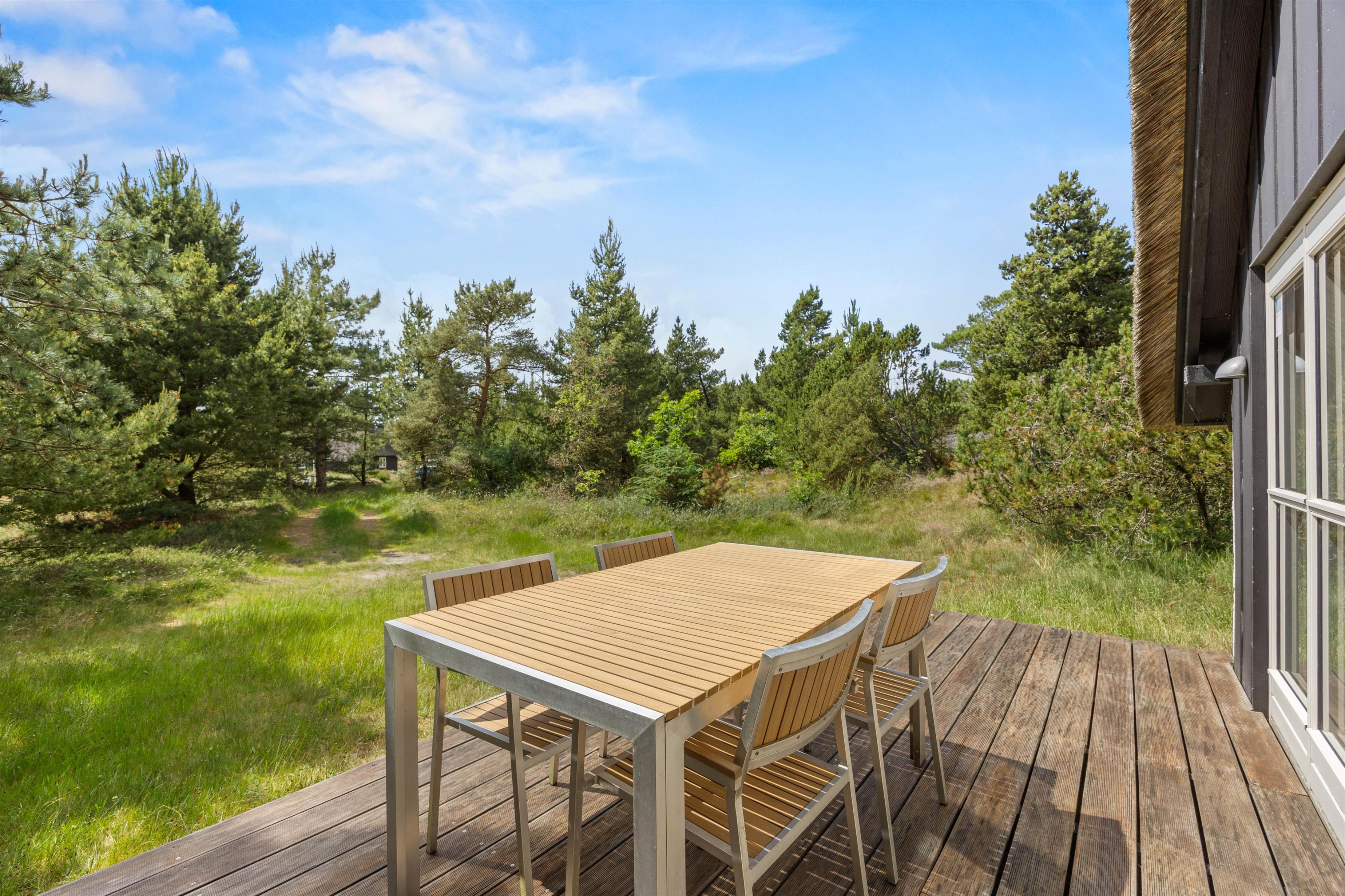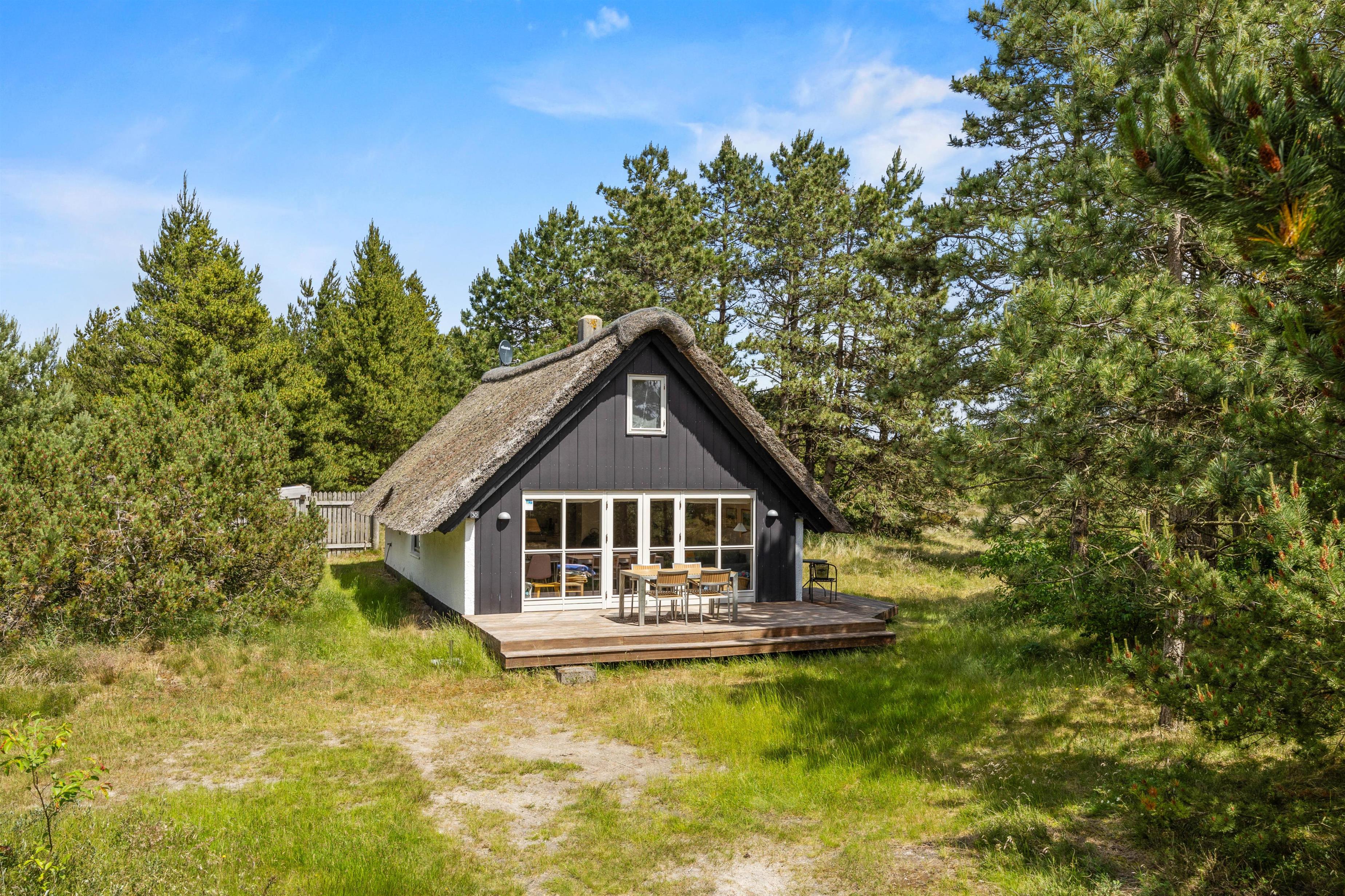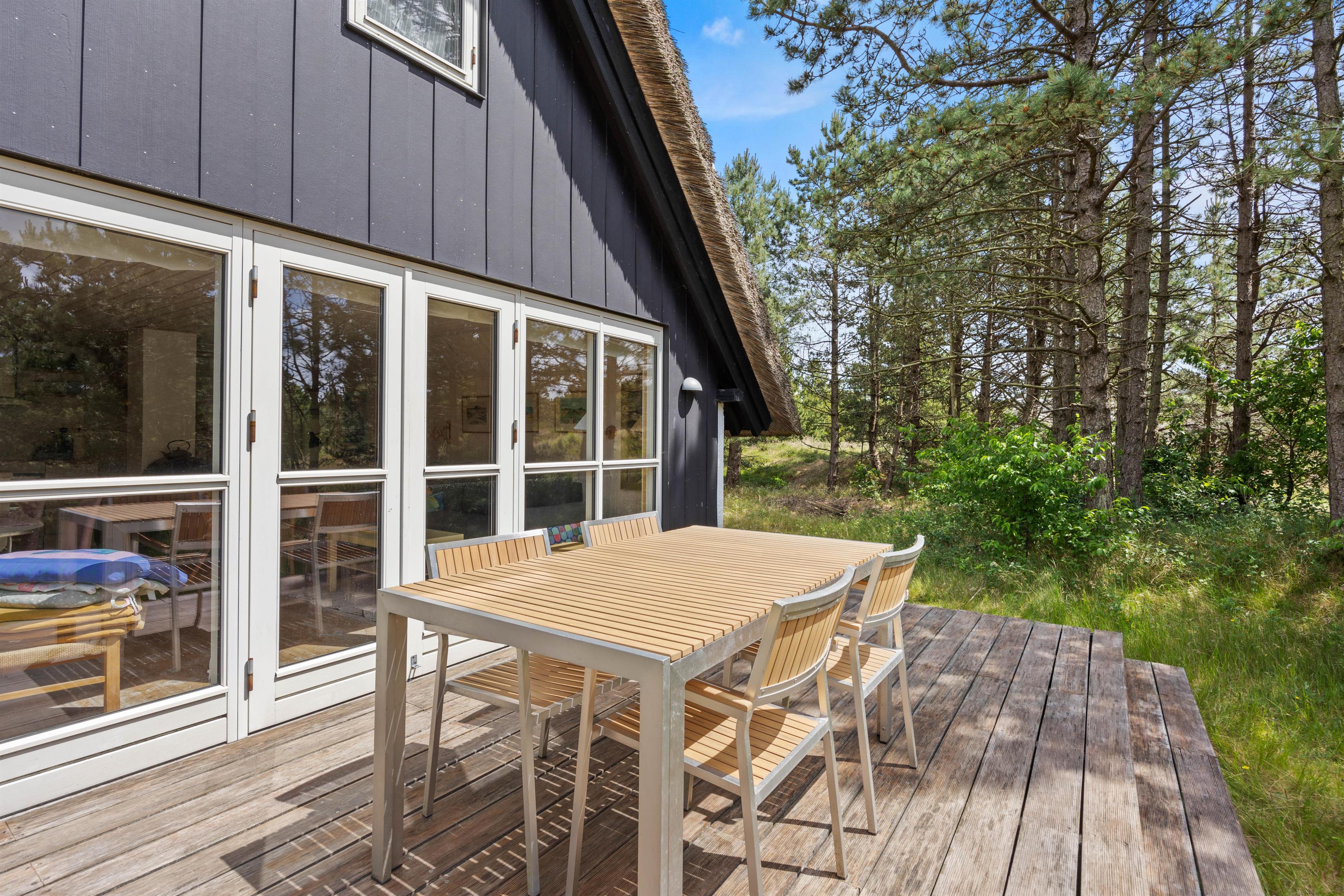 Det stråtækte sommerhus i Vesterhede, sydenden af Rømø, ligger kun 900 meter fra Vadehavet, hvilket gør det let at tage en forfriskende morgen- eller aftentur langs vandet. Den åbne terrasse og naturgrunden på godt 2800m2 giver masser af plads til ophold i det fri. Tag solbad i liggestolene, eller træk jer tilbage i havemøblerne imens børnene går på opdagelse på naturgrunden. Tænd op i grillen til aftenen, og nyd et lækkert grillmåltid sammen, imens skyggerne bliver lange.