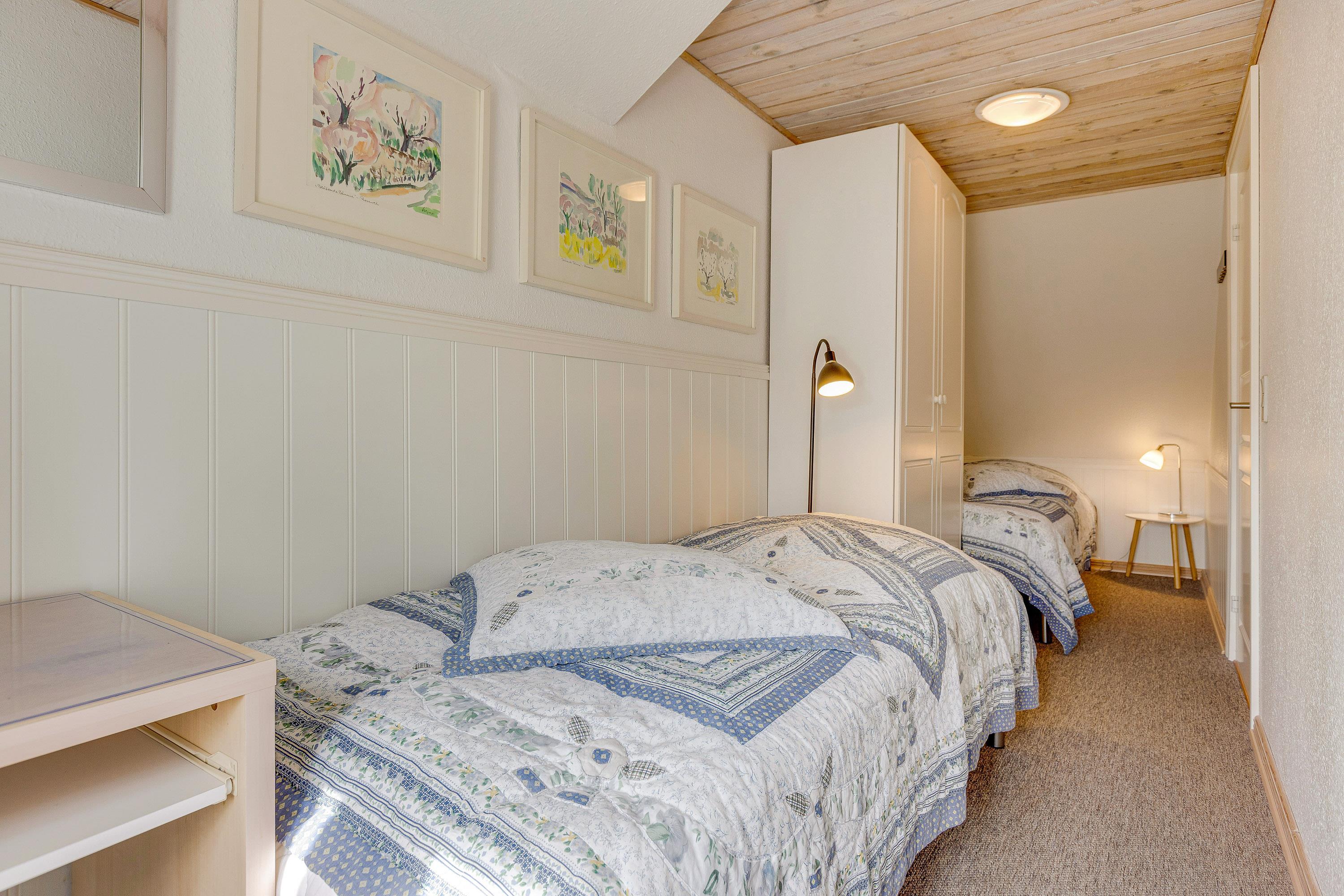 Lejlighedens 6 sovepladser er fordelt på 3 gode soveværelser, hvoraf 2 af dem er placeret på lejlighedens første sal. Her kan I få en god nats søvn i dobbeltsengen og de 2 enkeltsenge. Det sidste værelse ligger i stueetagen, hvor I kan lade op til morgendagens aktiviteter i den komfortable dobbeltseng.