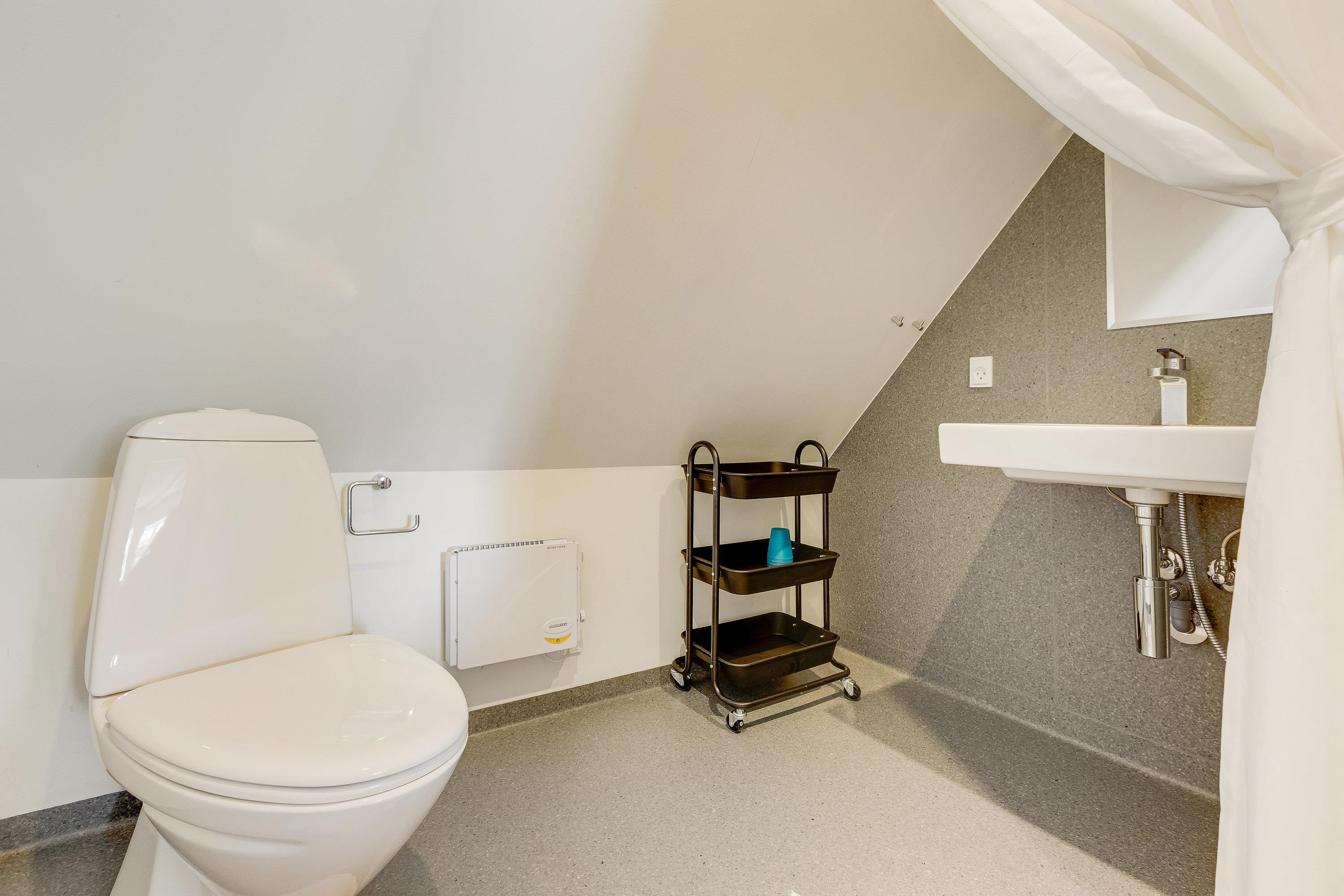 Ferielejlighedens badeværelse ligger i stueetagen, og her er der gulvvarme, så I ikke fryser fødderne. Som et ekstra plus er der et fint gæstetoilet på første salen, så der ikke opstår lang kø om morgenen.