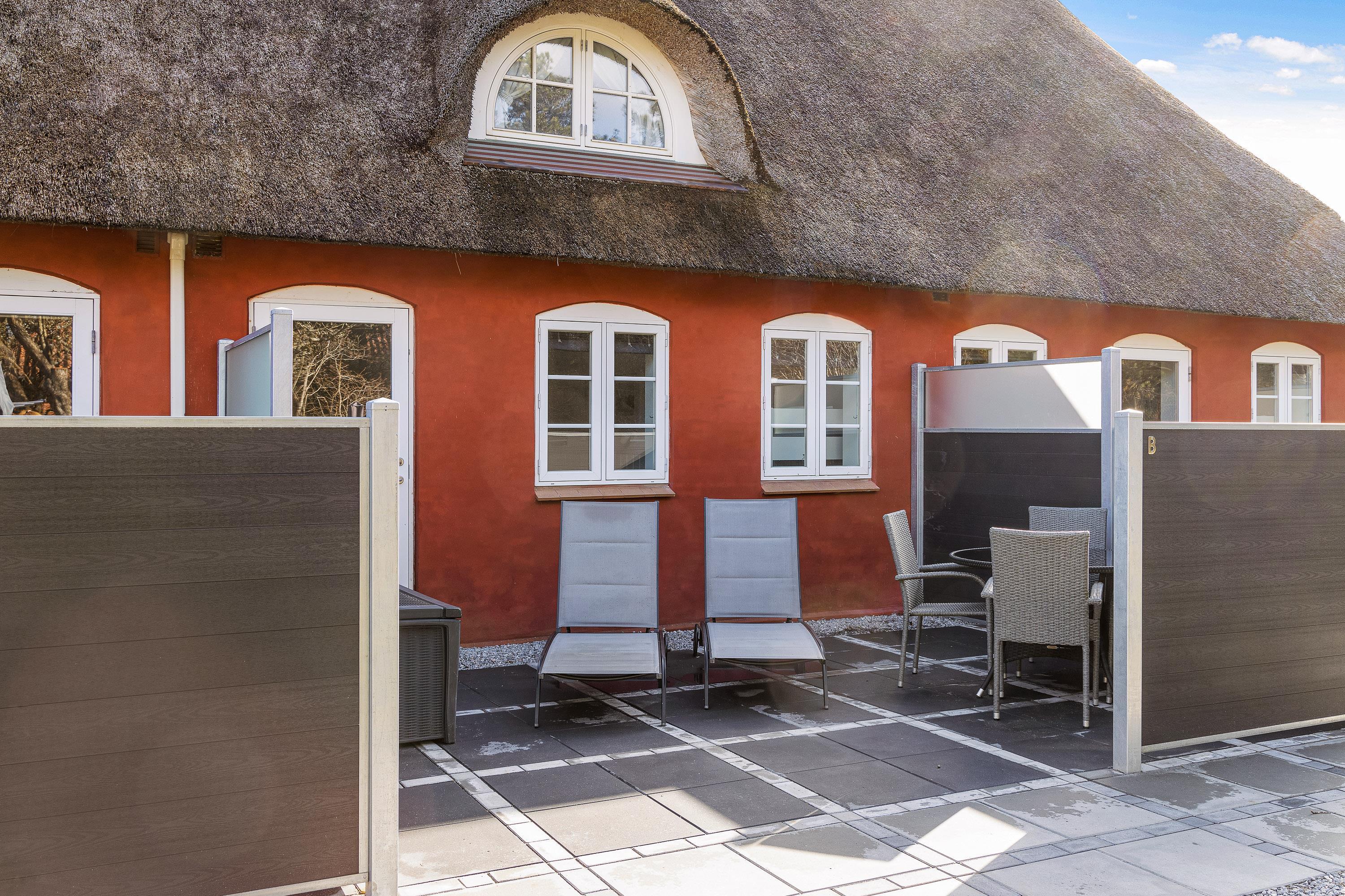 Ferielejligheden har 2 gode, afskærmede terrasser, hvor I kan nyde ferien med en kop kaffe og en god bog i hånden. Ferielejlighederne deler desuden en fin udestue med borde og stole, som I frit kan benytte jer af.