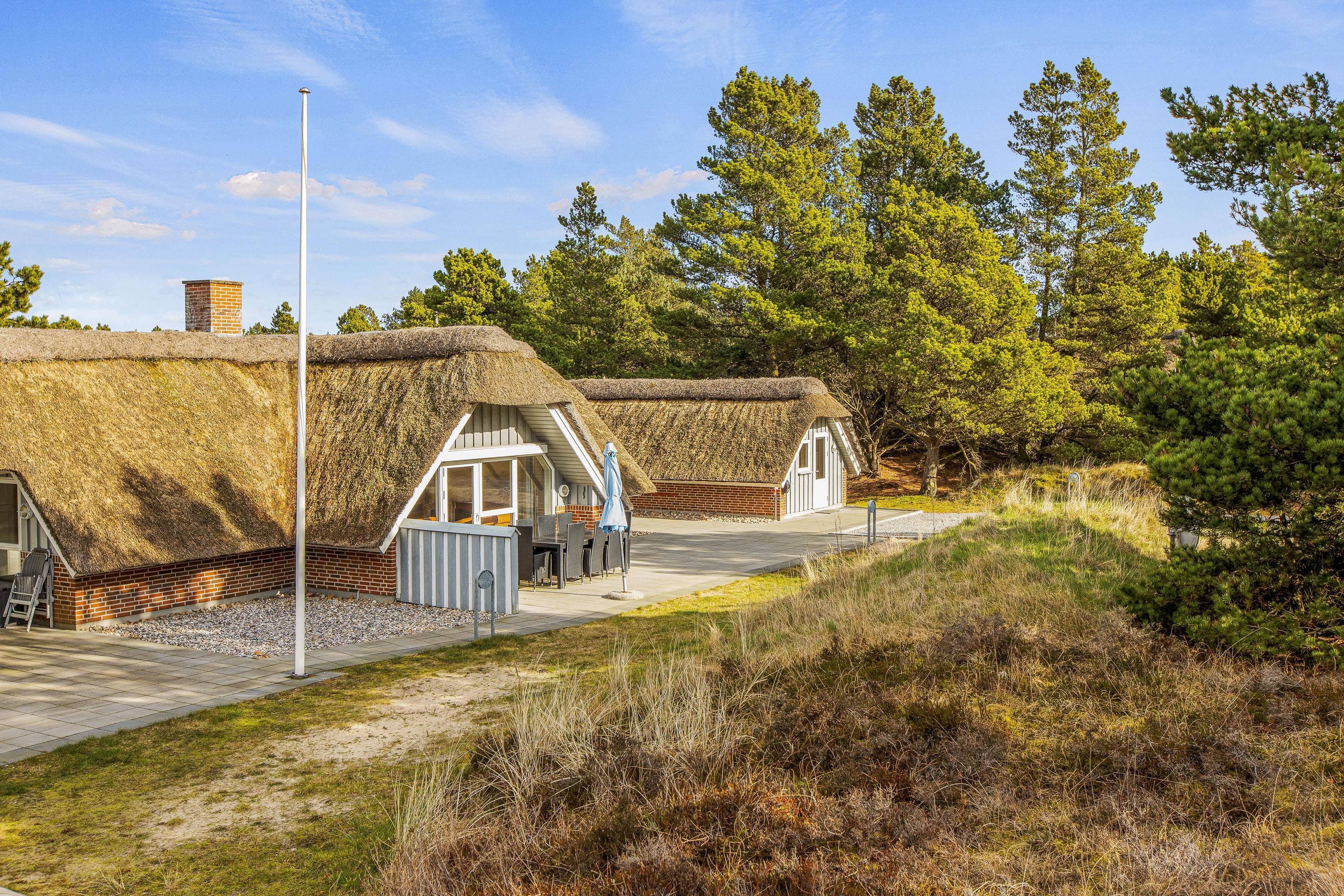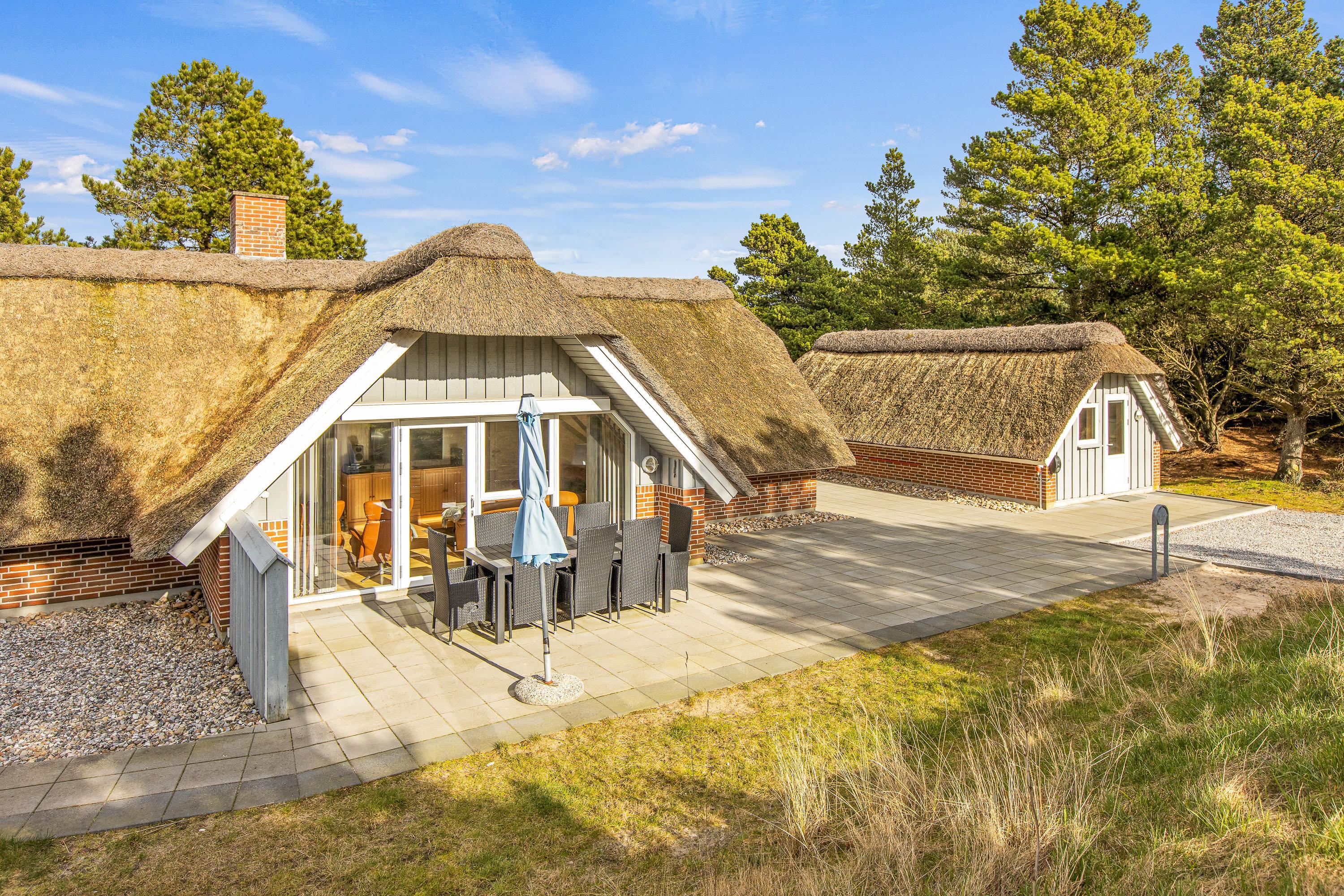 Det stråtækte hus byder med sine 185 m2 plads til 6 voksne og 2 børn/unge. Det lyse køkken med opvaskemaskine ligger i åben forbindelse med spisestuen og stuen. Opholdsstuen er hyggeligt indrettet og har en behagelig størrelse. En brændeovn, som i den kølige tid hurtigt giver varme, desuden er der en energibesparende varmepumpe.