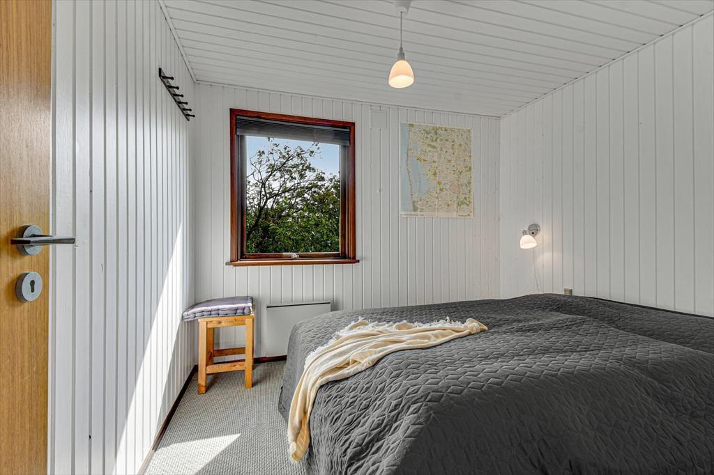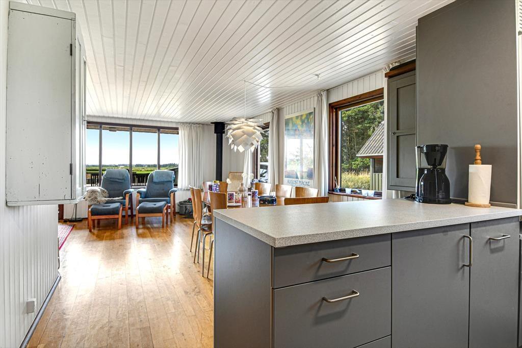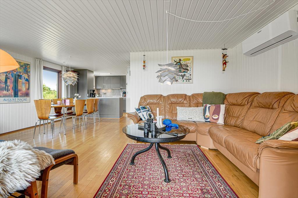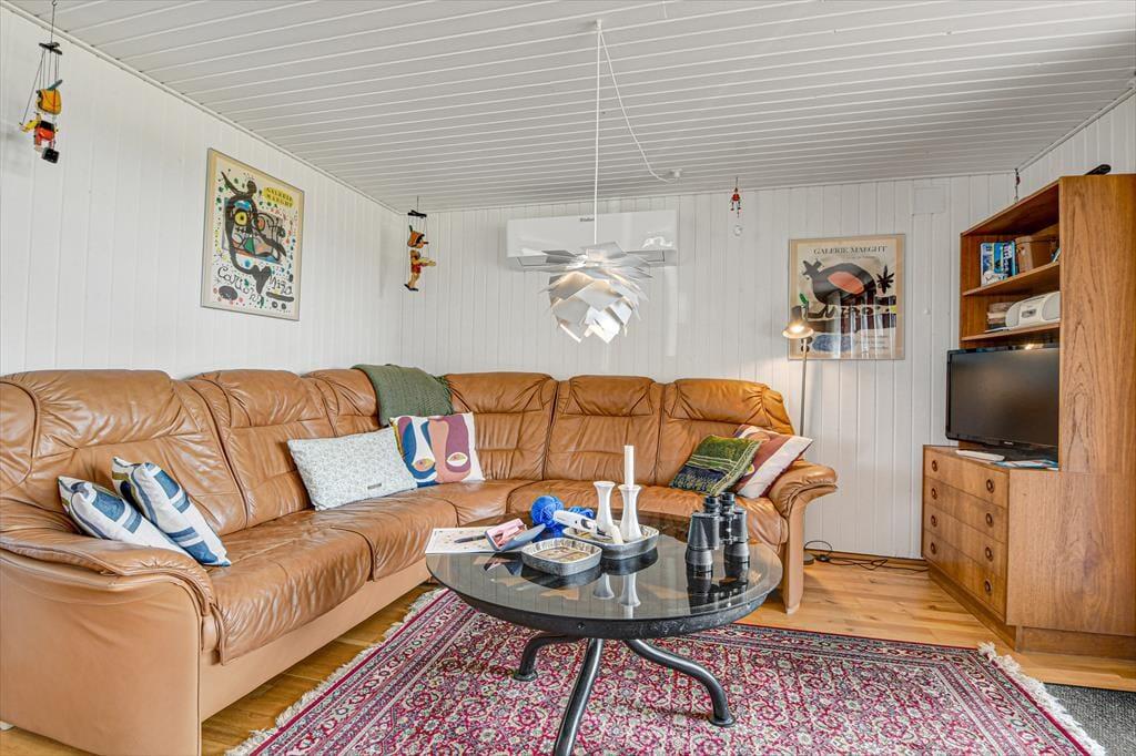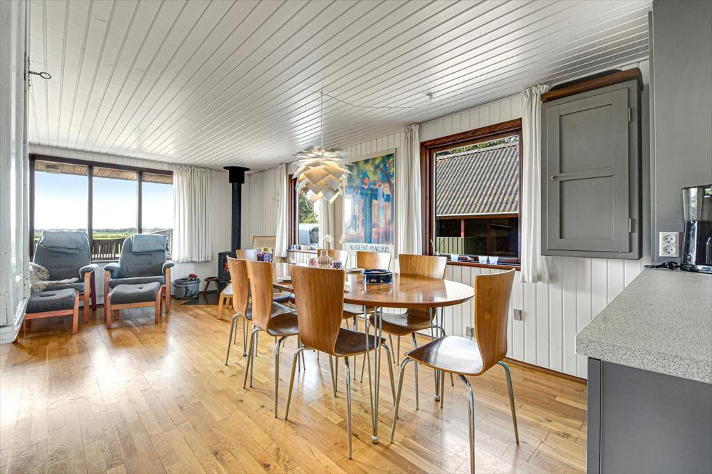 Den klassiske, ældre træejendom passer med sin mørkegrønne træfacade fint ind i de naturskønne omgivelser. Inden døre er der lyst med hvidmalede vægge, og stuens brændeovn hører til de klassiske detaljer. I stuen giver det sydvendte vinduesparti dig og dine kære mulighed for at nyde udsigten over det åbne landskab, når I hygger jer i sofaafdelingen eller deler et godt måltid mad ved spisebordet. Køkkenet ligger i åben forbindelse med stuen, og på de tre soveværelser kan seks personer se frem til at sove længe i hyggelige rammer. Sommerhusets badeværelse er udstyret med gulvvarme, bruseniche og endda en sauna, så når du vender hjem fra en badetur eller andre aktiviteter i naturen, kan du blive varmet helt igennem.