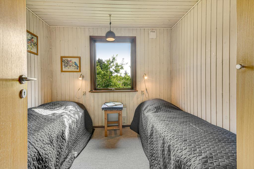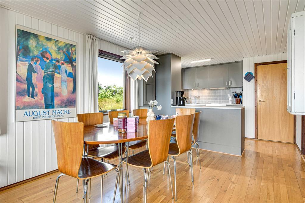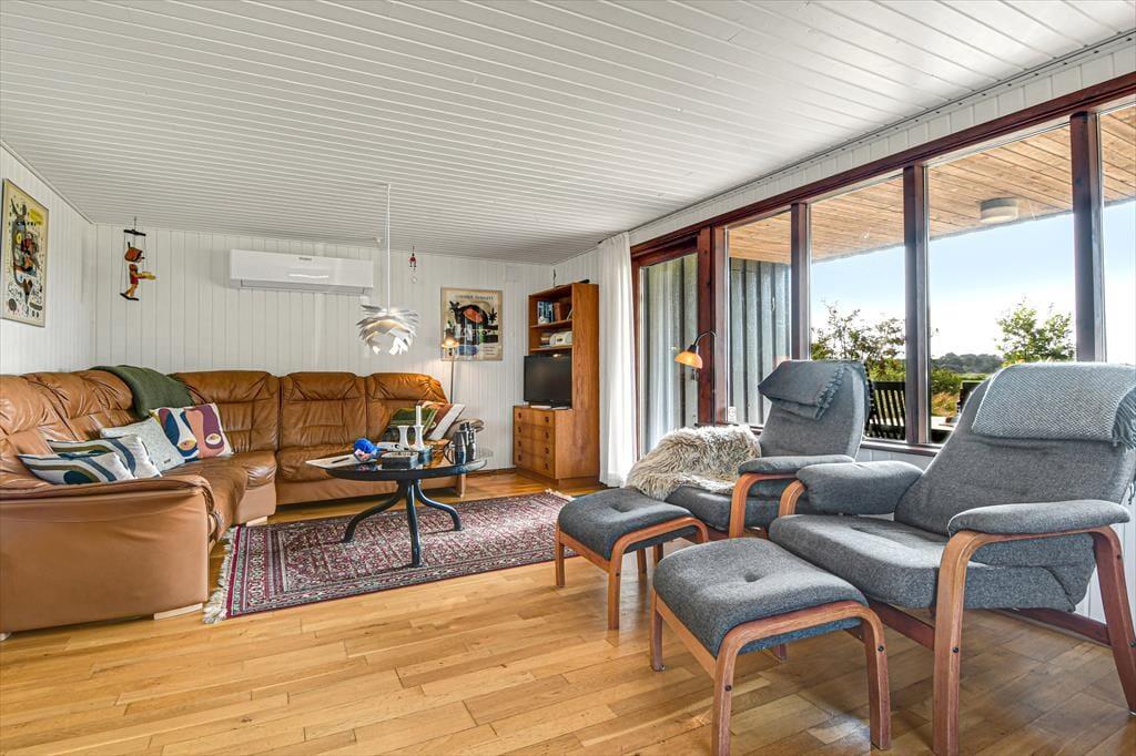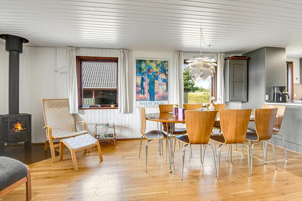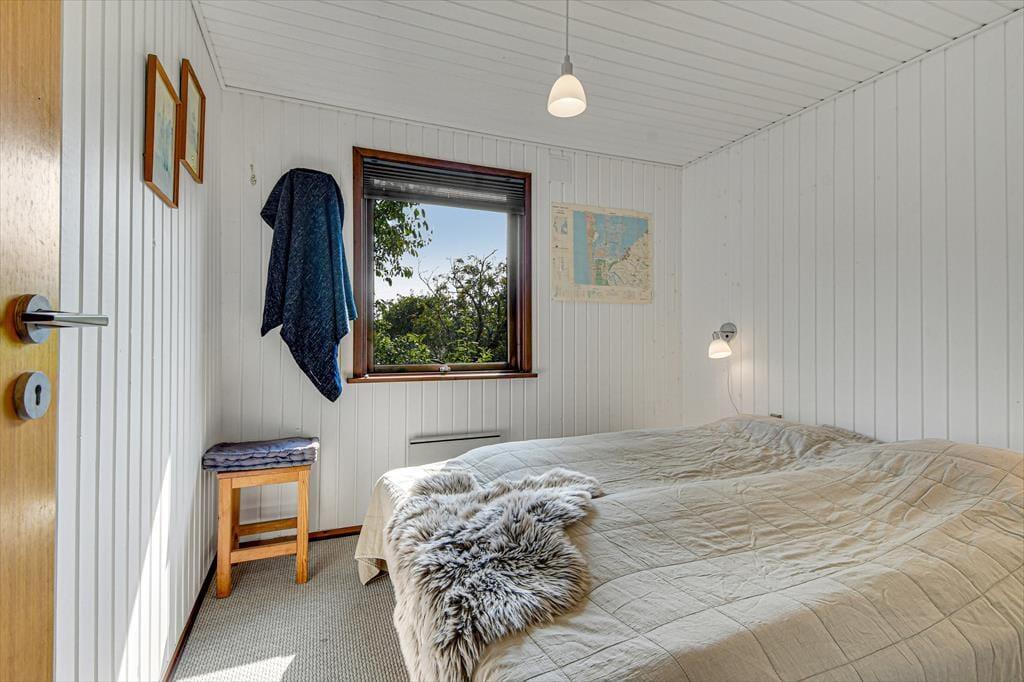 Den klassiske, ældre træejendom passer med sin mørkegrønne træfacade fint ind i de naturskønne omgivelser. Inden døre er der lyst med hvidmalede vægge, og stuens brændeovn hører til de klassiske detaljer. I stuen giver det sydvendte vinduesparti dig og dine kære mulighed for at nyde udsigten over det åbne landskab, når I hygger jer i sofaafdelingen eller deler et godt måltid mad ved spisebordet. Køkkenet ligger i åben forbindelse med stuen, og på de tre soveværelser kan seks personer se frem til at sove længe i hyggelige rammer. Sommerhusets badeværelse er udstyret med gulvvarme, bruseniche og endda en sauna, så når du vender hjem fra en badetur eller andre aktiviteter i naturen, kan du blive varmet helt igennem.
