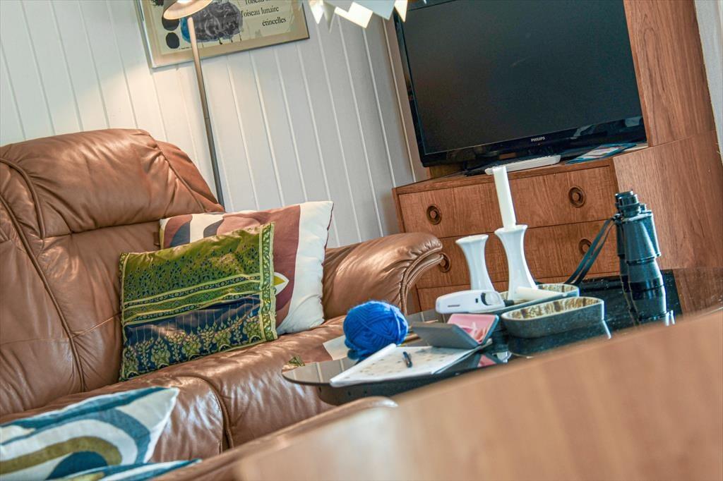 Solskinstimerne kan oplagt udspille sig på den delvist overdækkede terrasse, der ligger syd for sommerhuset, lige i forlængelse af stuen. En varm kop kaffe eller en kølig forfriskning smager altså bare bedre, når man sidder i et smukt landskab som dette, og hvis du drømmer om at tilberede alle feriens aftenmåltider i det fri, kan du tage grillen i brug og dække op ved havebordet. Grunden er med sine 3600 m2 meget stor, og der er god afstand til naboerne – og med både carport og gårdsplads er der masser af kvadratmeter til at parkere en eller flere biler.
