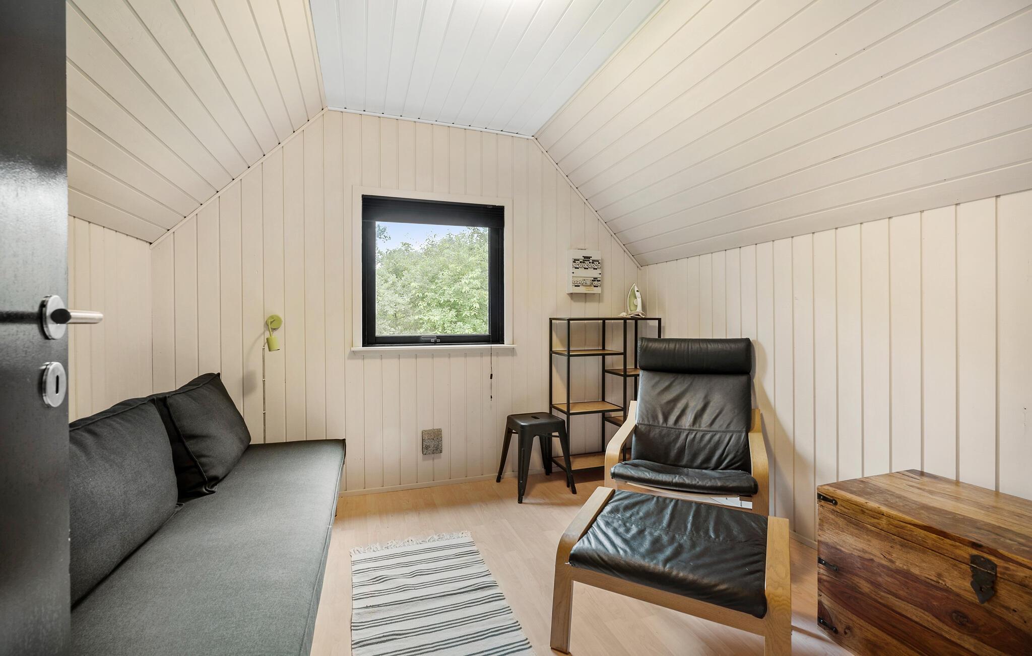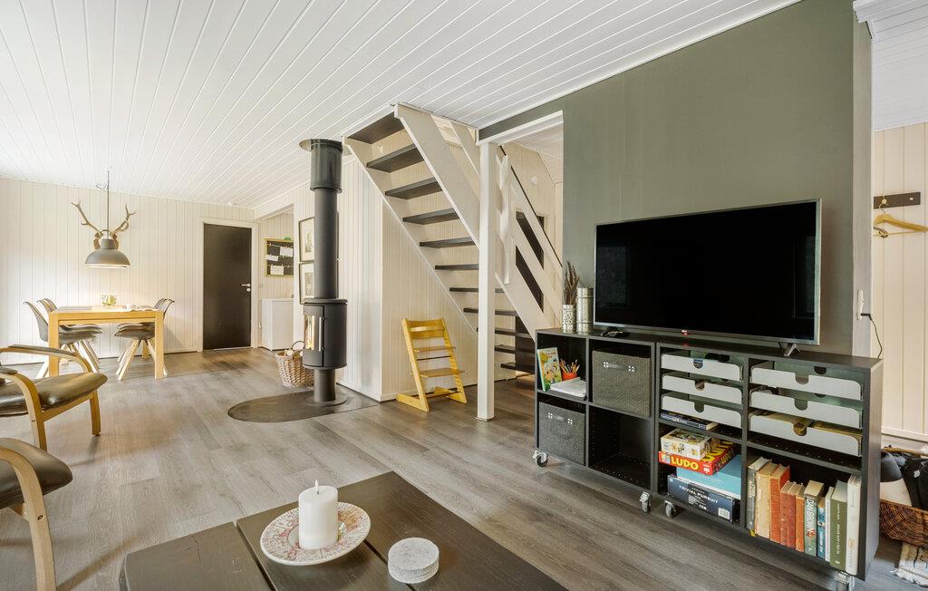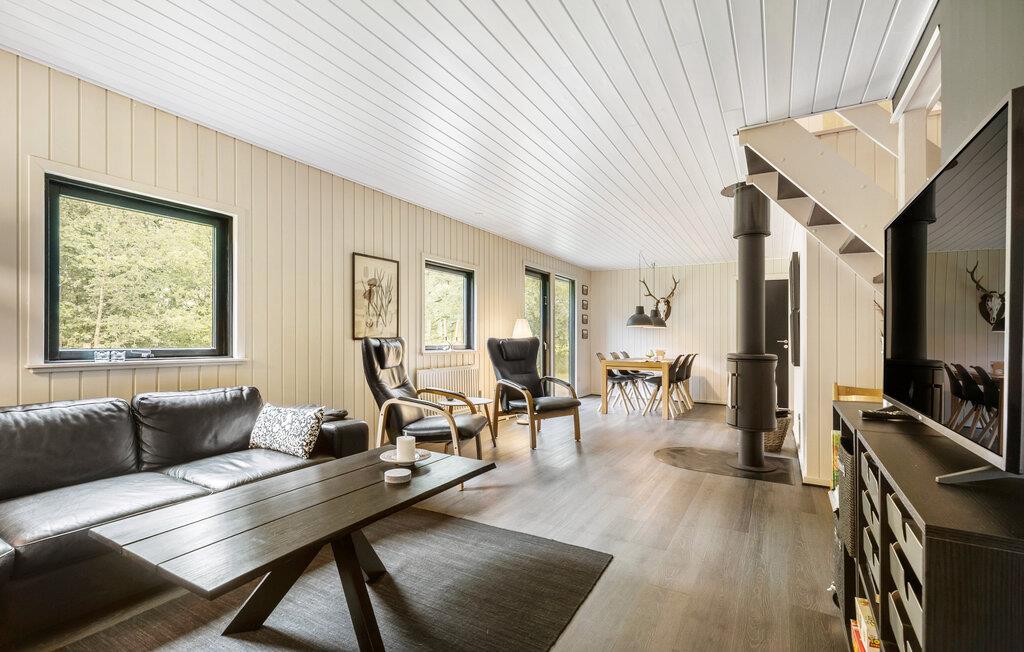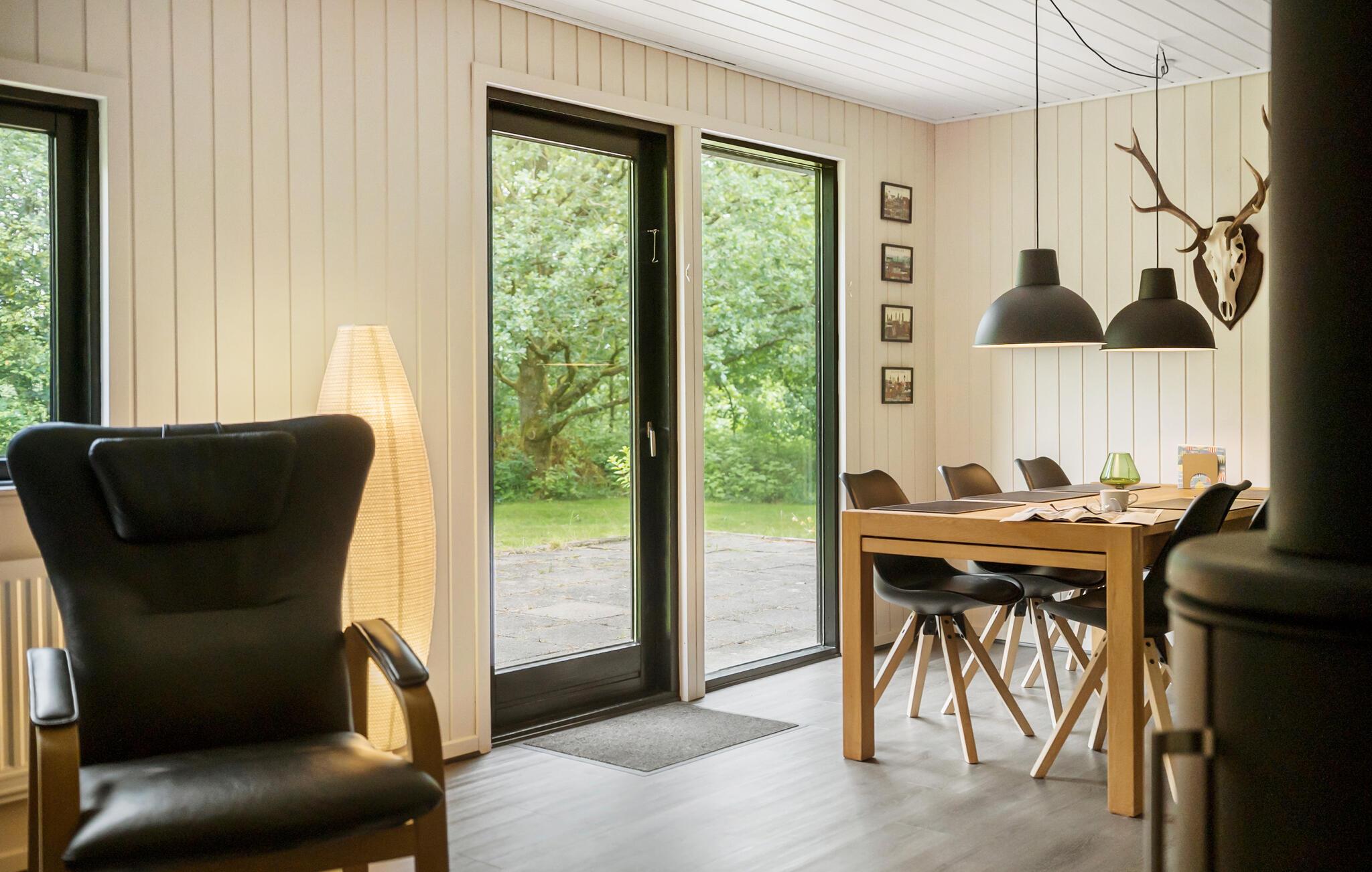 Der er lagt op til en afslappende ferie i dette hus, som har en fredfyldt beliggenhed på en grund, som er omkranset af træer. Husets mange vinduer giver jer en dejlig udsigt over den grønne have, så boligen har en skøn forbindelse mellem ude og inde. Efter dagens aktiviteter kan I læne jer godt tilbage i det hyggelige opholdsområde til lyden af gnisterne i brændeovnen.