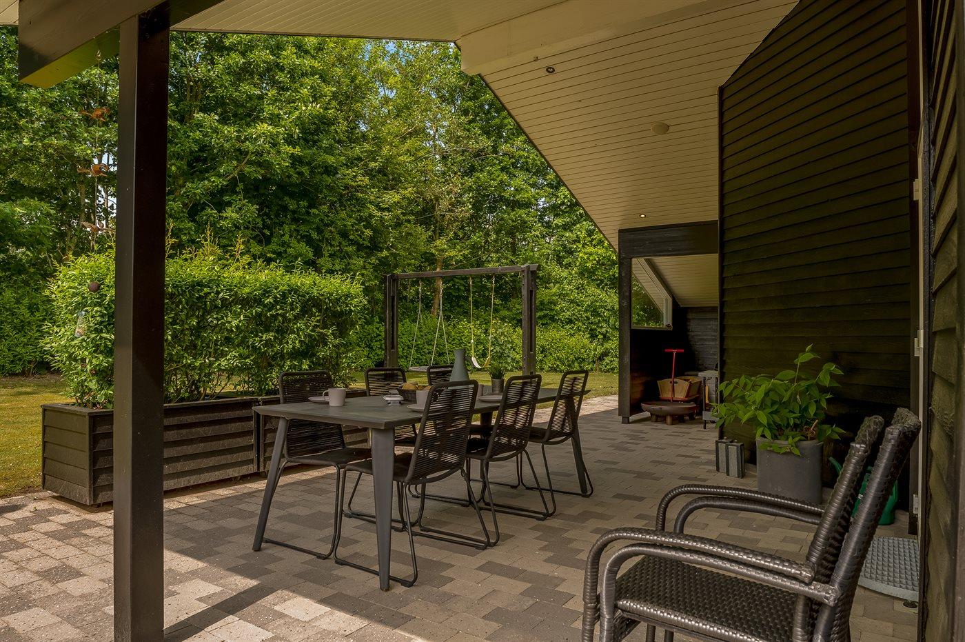 Terrasser på 3 af husets sider med mange læmuligheder (såvel åbent som overdækket terrasseareal) med havemøbler. Der findes en stor integreret carport med direkte indgang til entréen.