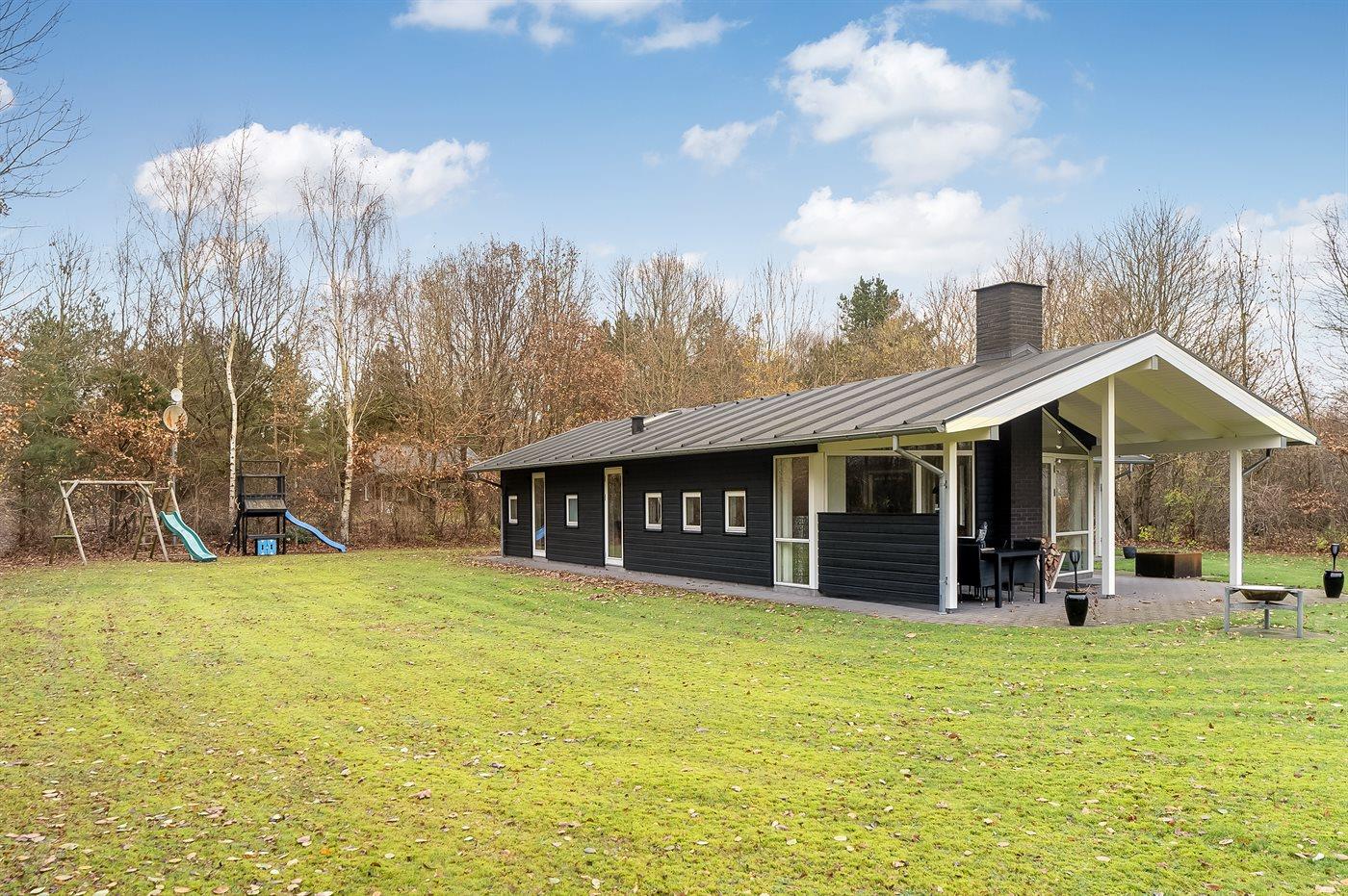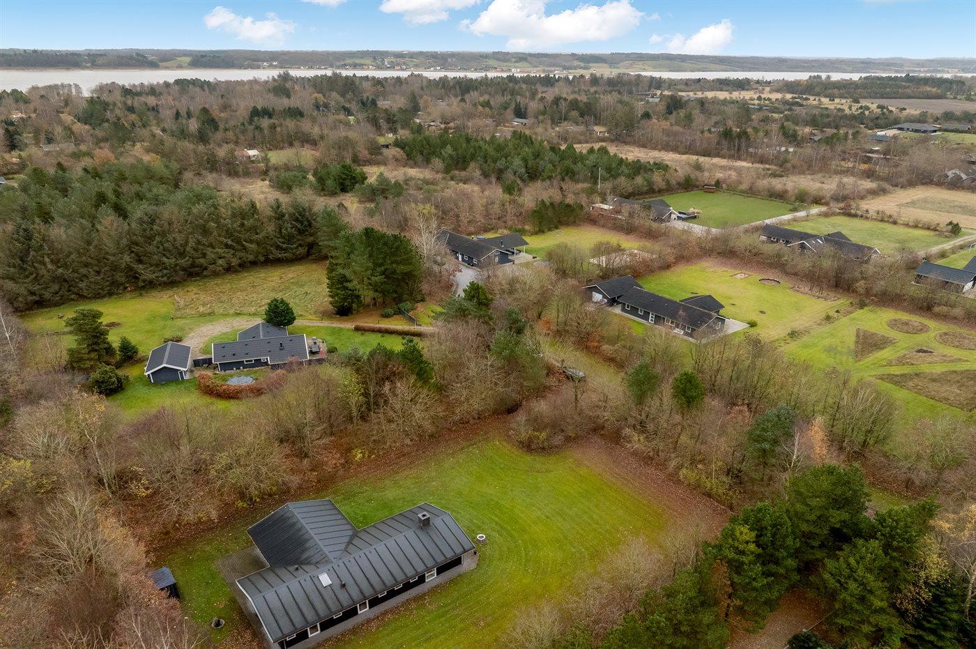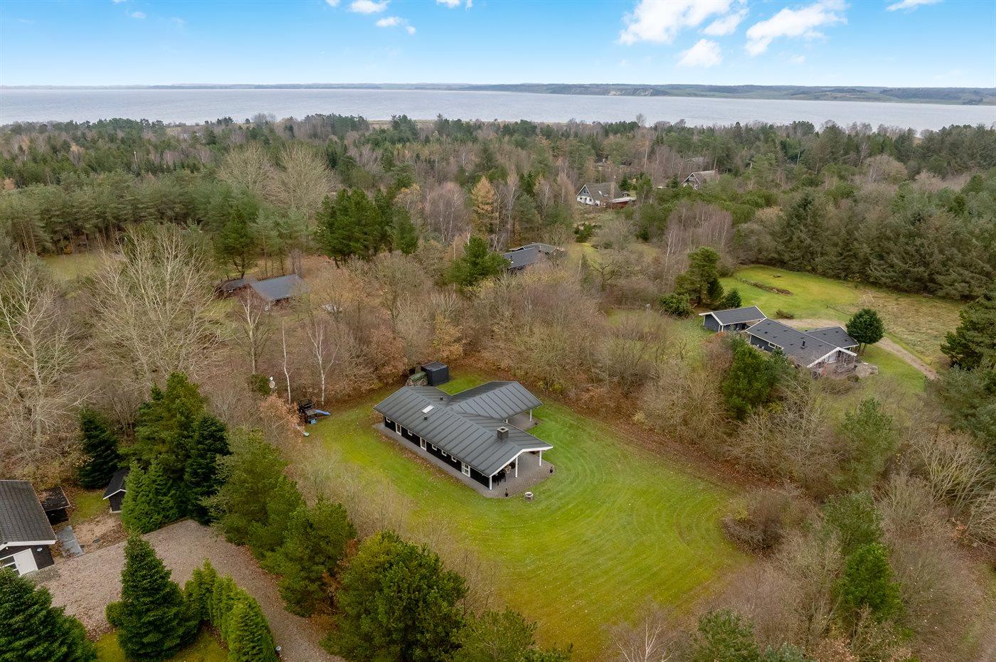 Ferieboligen er beliggende på en 2500 m² stor grund i skov/plantage. Der er 500 m til fjorden. Nærmeste forretning er beliggende i en afstand af 6000 m. Til ferieboligen hører åbent terrasseareal. Desuden er der overdækket terrasse. Gynge. Legetårn. Rutchebane. Grill til rådighed. Parkering ved ferieboligen.